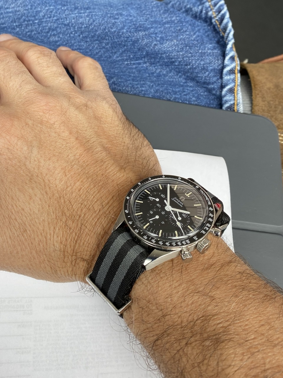I don't have the Apollo XI 50th in steel, but I think it is at least very similar. It is very thin though, much thinner than my Speedmaster'57 60th anniversary. It wears very comfortable, just like my original 1039 (but less flimsy).
