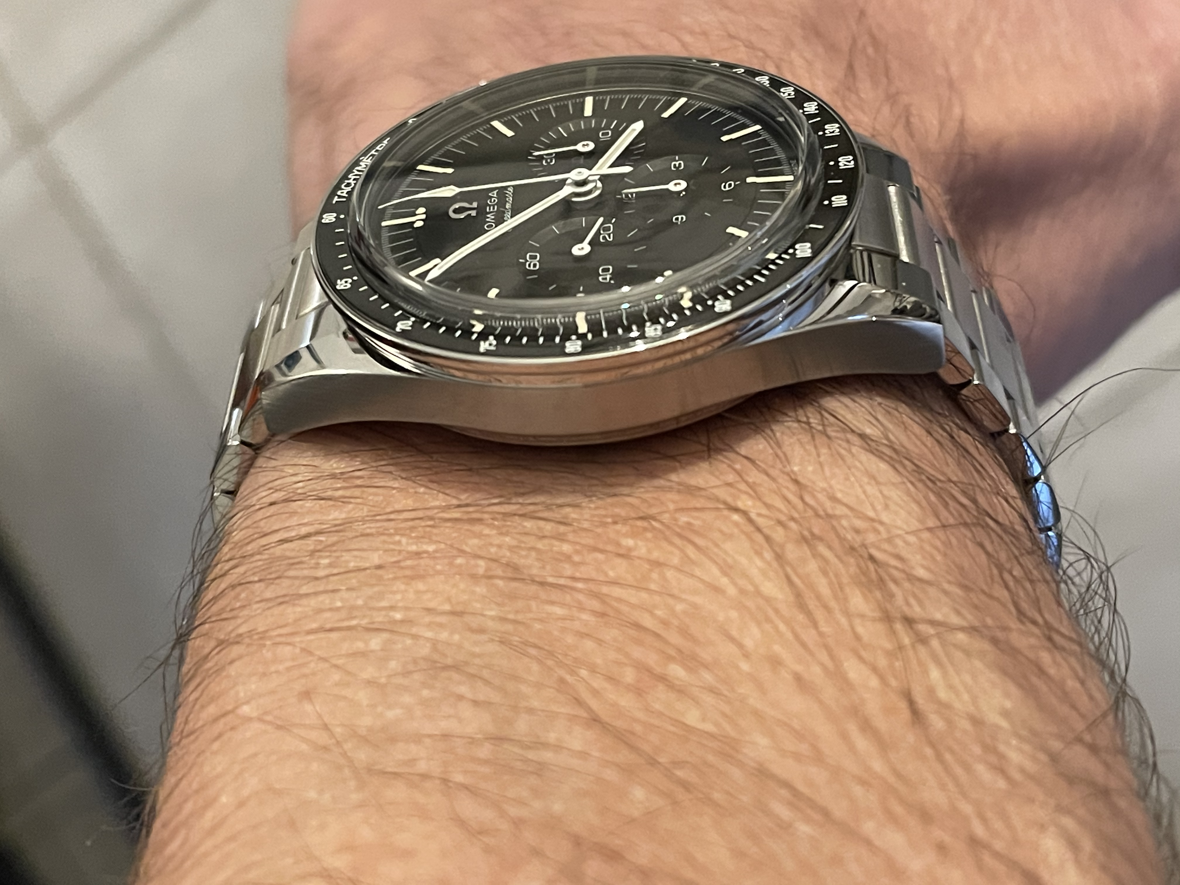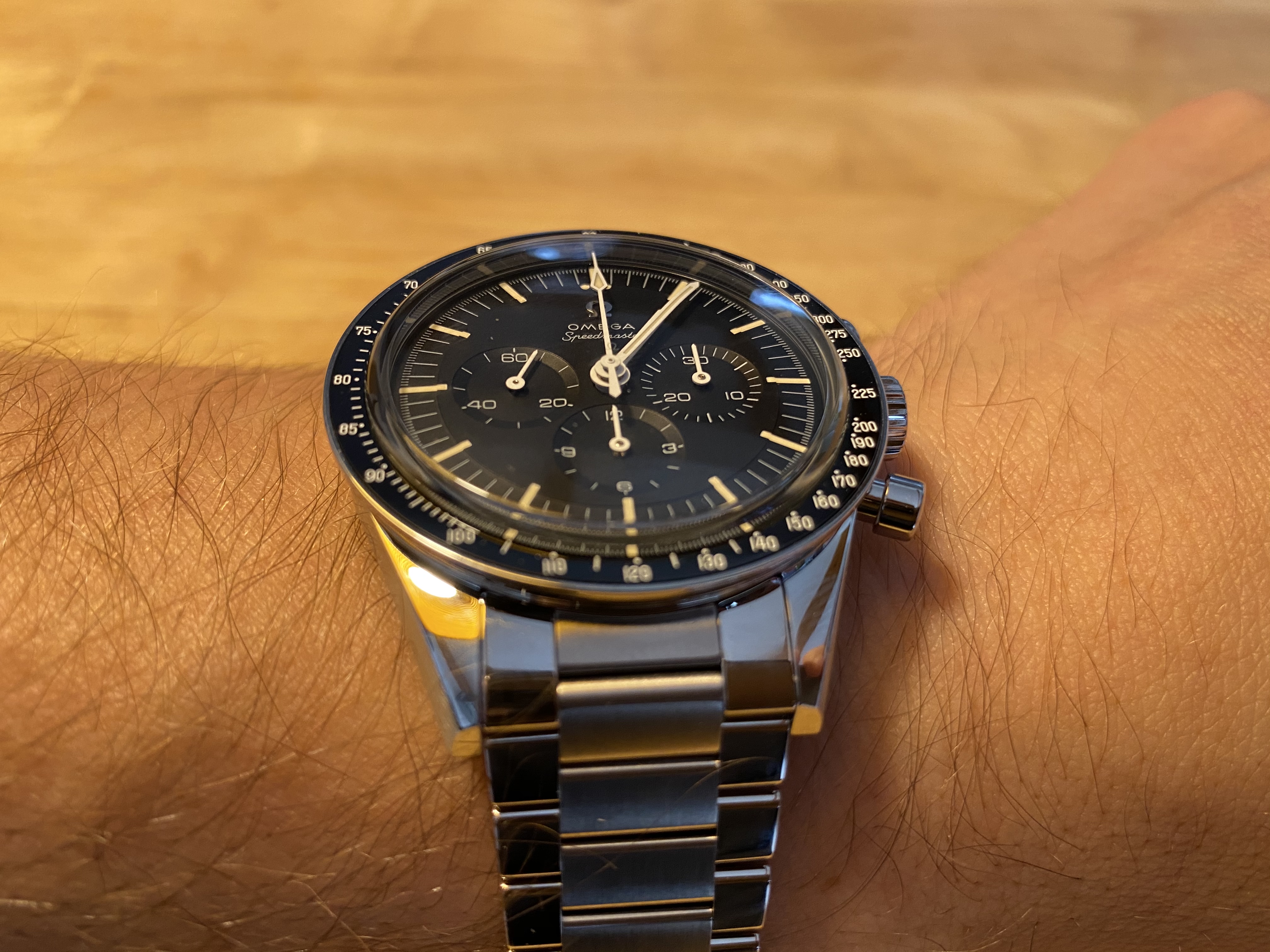The good: to me, the all-around best looking modern Speedy that I’ve seen in the flesh; somehow, the sapphire does NOT give the typical halo almost whatsoever (which was my biggest pre-receipt worry); can’t wait to show the 321 in motion to my 14 month old son (for whom this was ostensibly purchased); the lume “color” is in no way a “faux-tina” or anything other than an appropriate design choice.