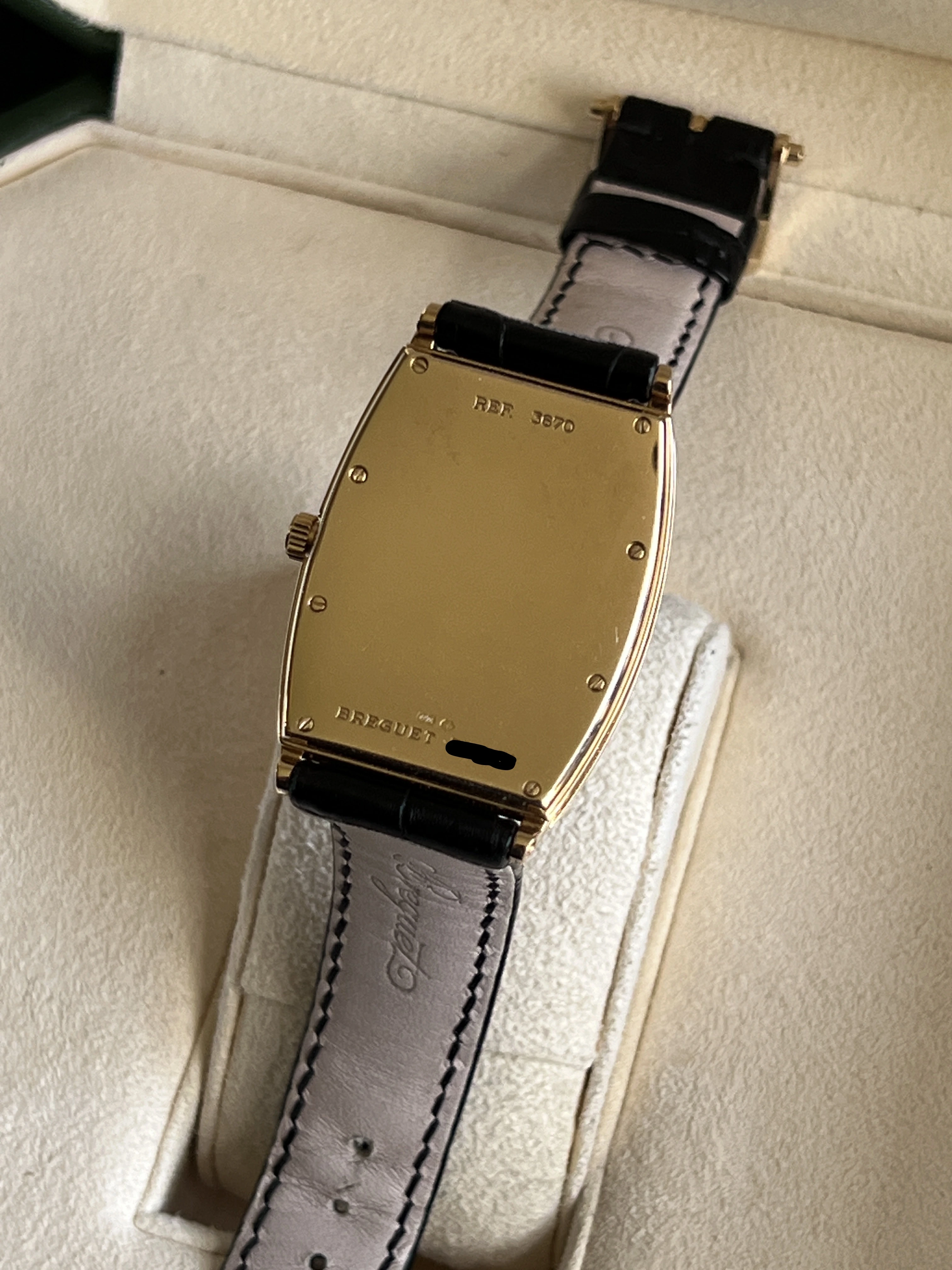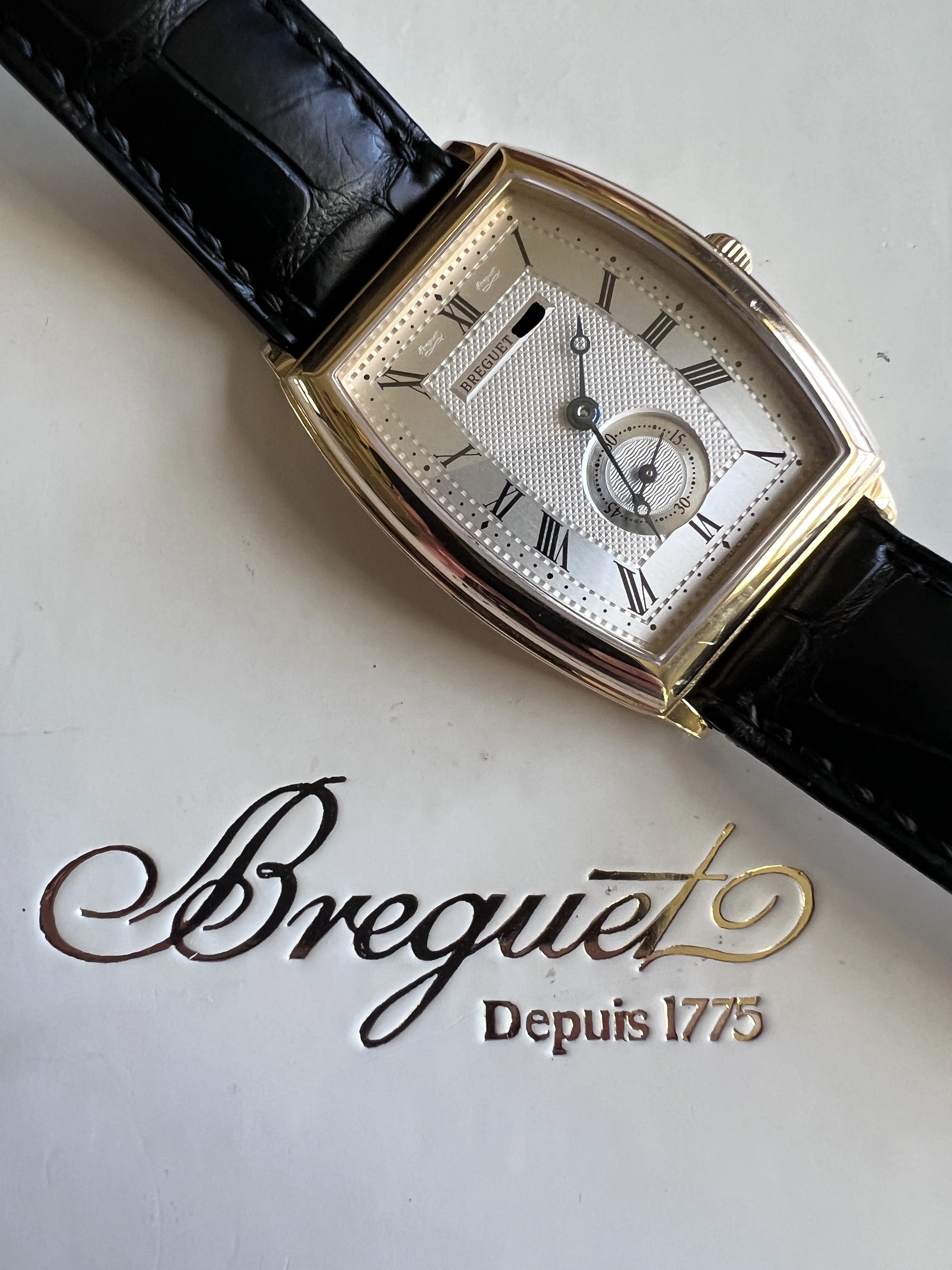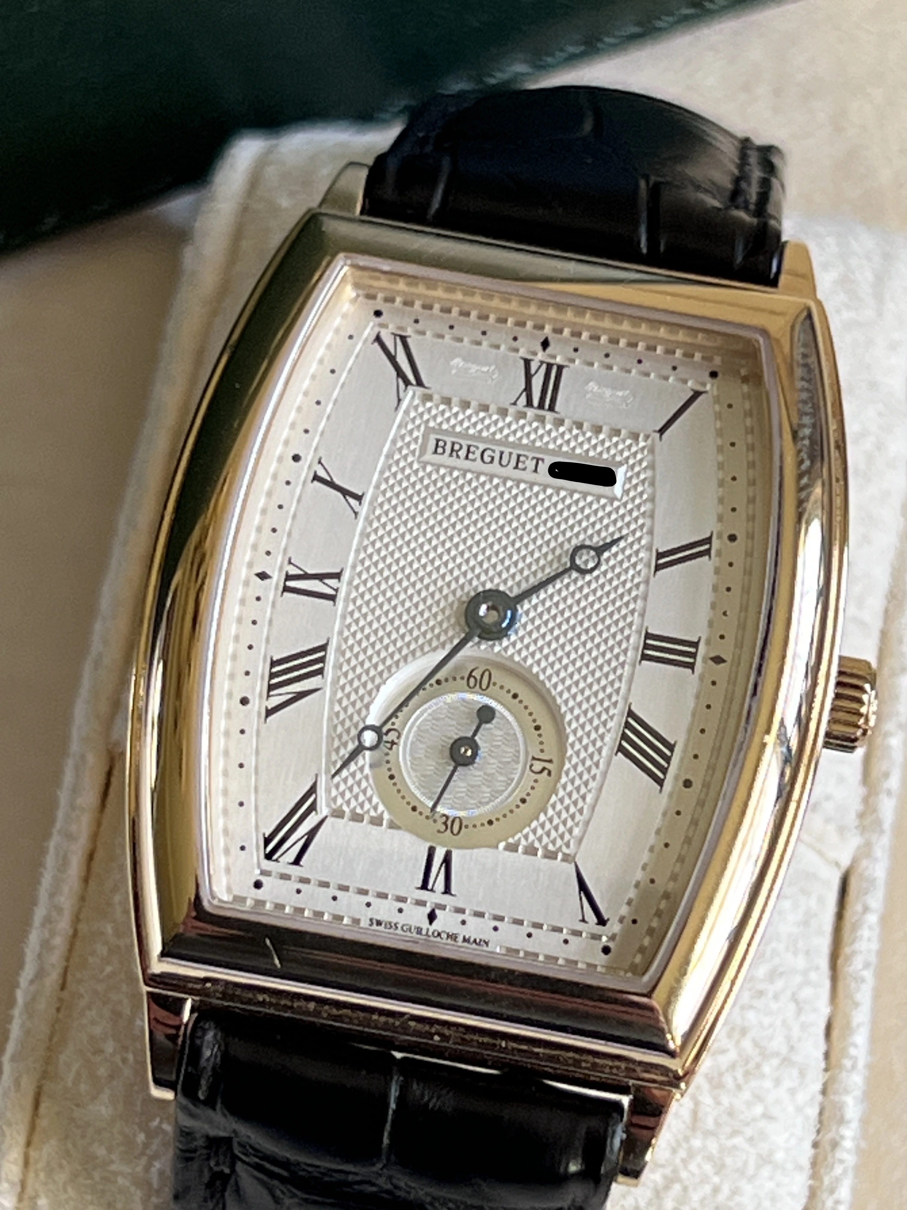 Looking for a new home for my Breguet Heritage 3670 in 18k yellow gold. Features a curved tonneau case in excellent condition with curved glass, coin-edge bevel, cal. 532 automatic movement with a 38-hour power reserve, small seconds, and Breguet leather band. The case measures roughly 30mm x 34mm exclusive of lugs (closer to 40mm with lugs). Basically it presents as a more elegant take on a JLC Reverso. Comes with original interior and exterior box with unsigned / undated papers. This is a truly fabulous watch that you don't (remotely) see every day.