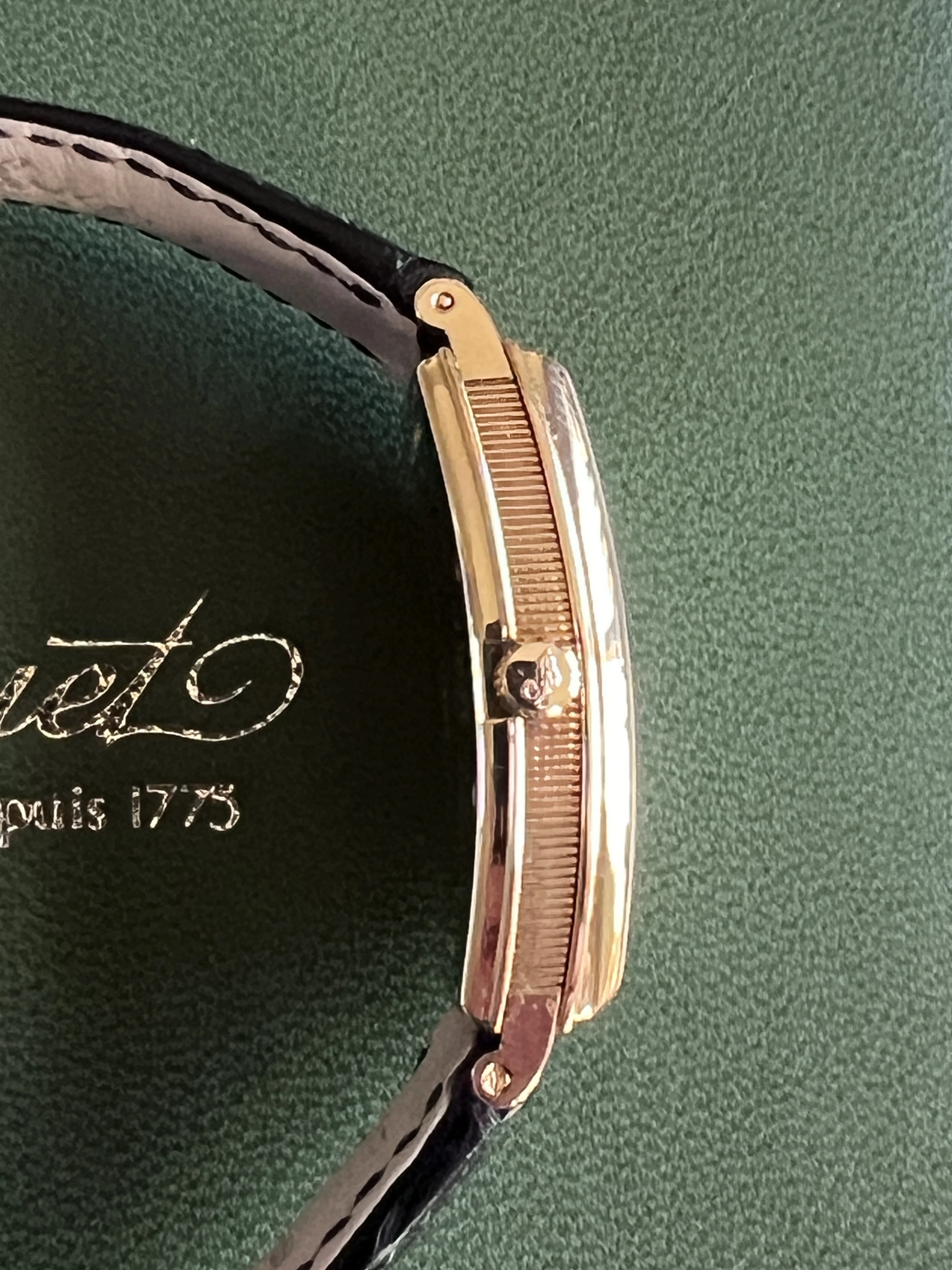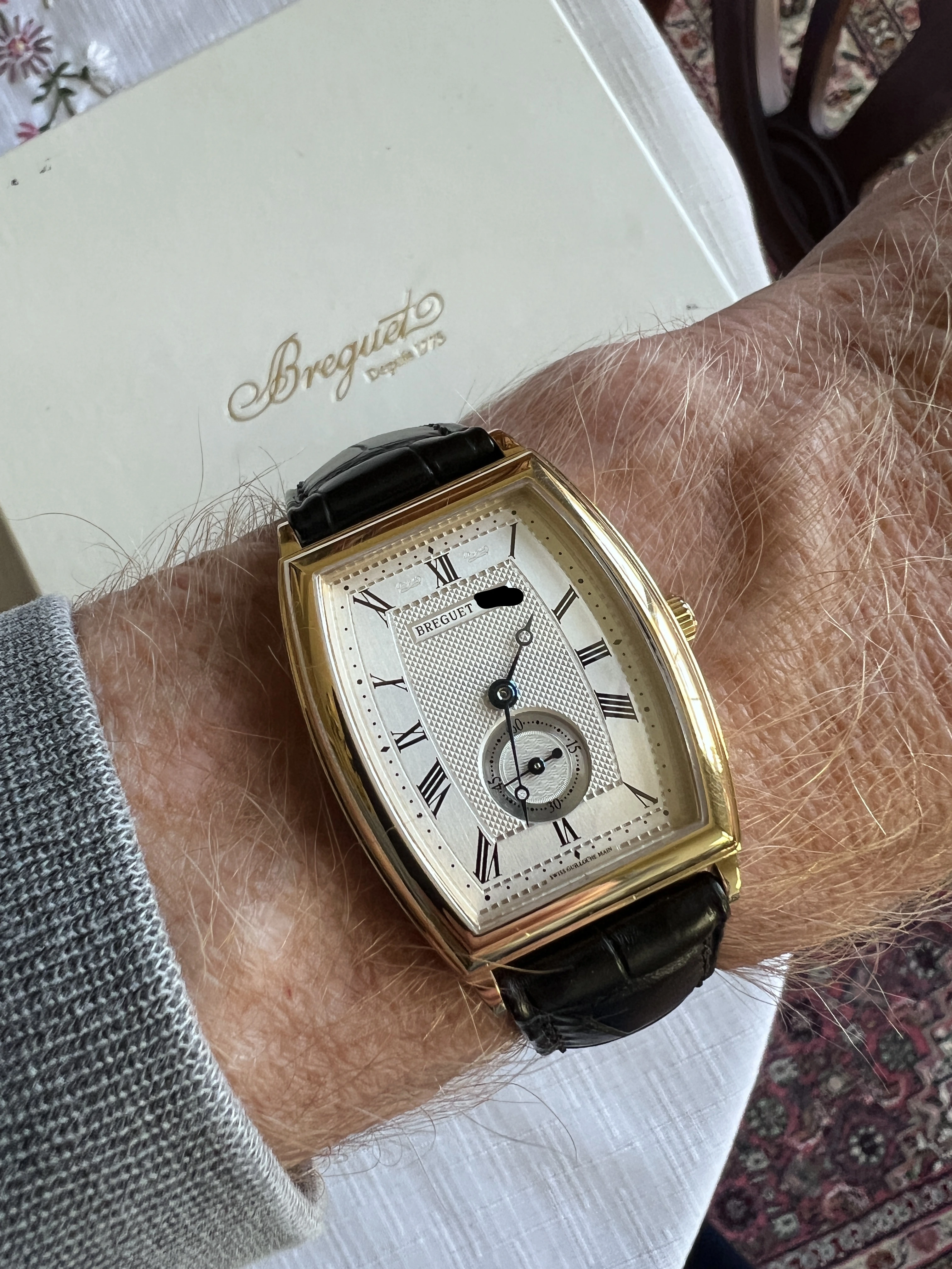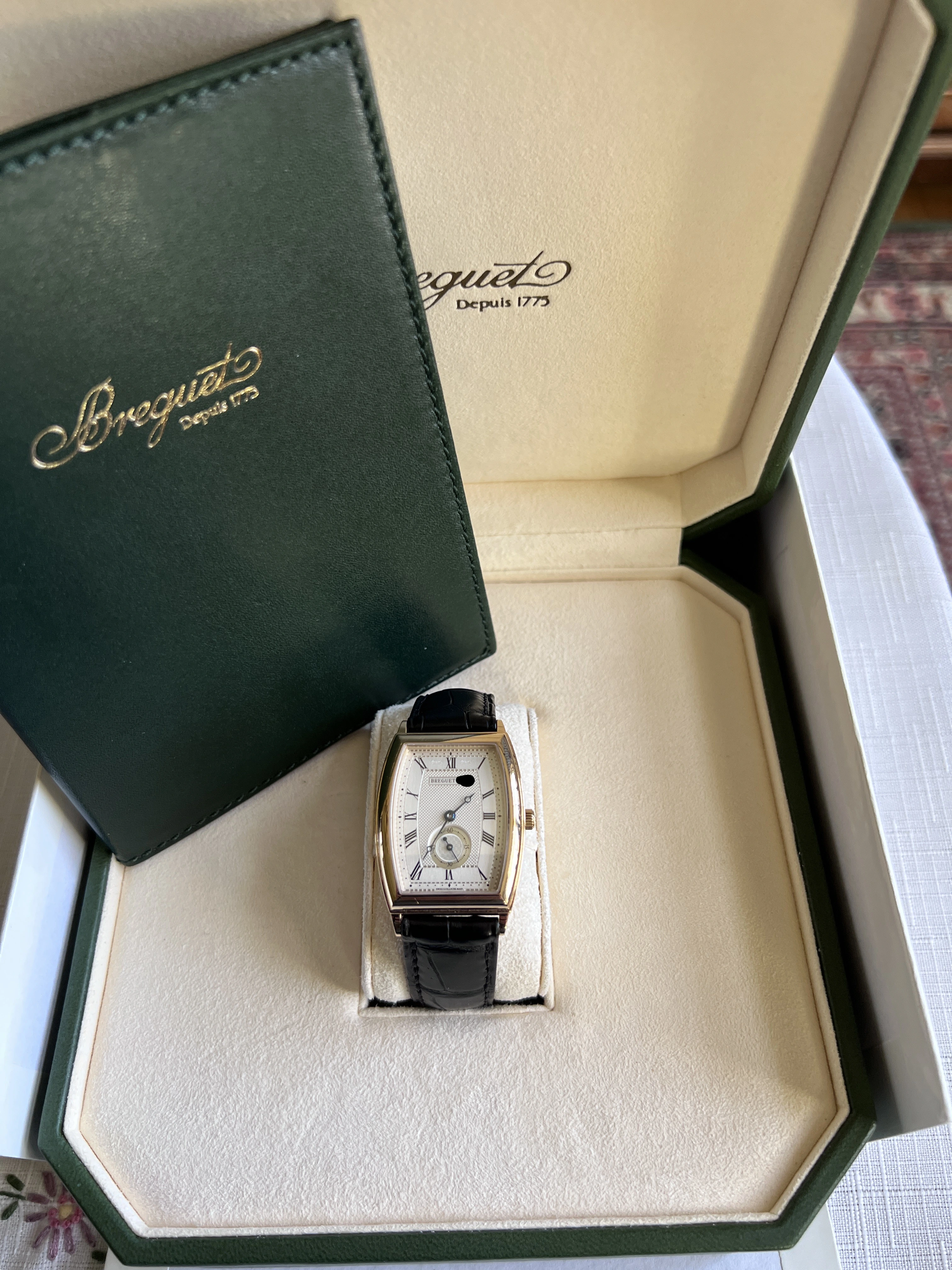 Looking for a new home for my Breguet Heritage 3670 in 18k yellow gold. Features a curved tonneau case in excellent condition with curved glass, coin-edge bevel, cal. 532 automatic movement with a 38-hour power reserve, small seconds, and Breguet leather band. The case measures roughly 30mm x 34mm exclusive of lugs (closer to 40mm with lugs). Basically it presents as a more elegant take on a JLC Reverso. Comes with original interior and exterior box with unsigned / undated papers. This is a truly fabulous watch that you don't (remotely) see every day.