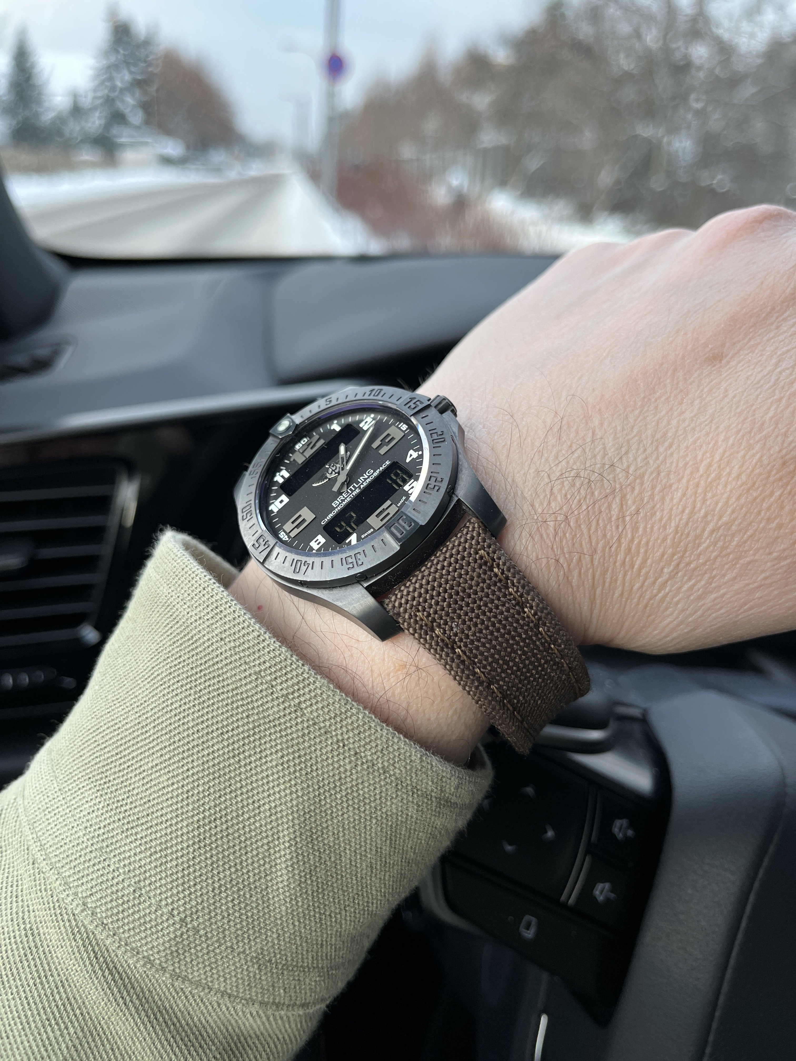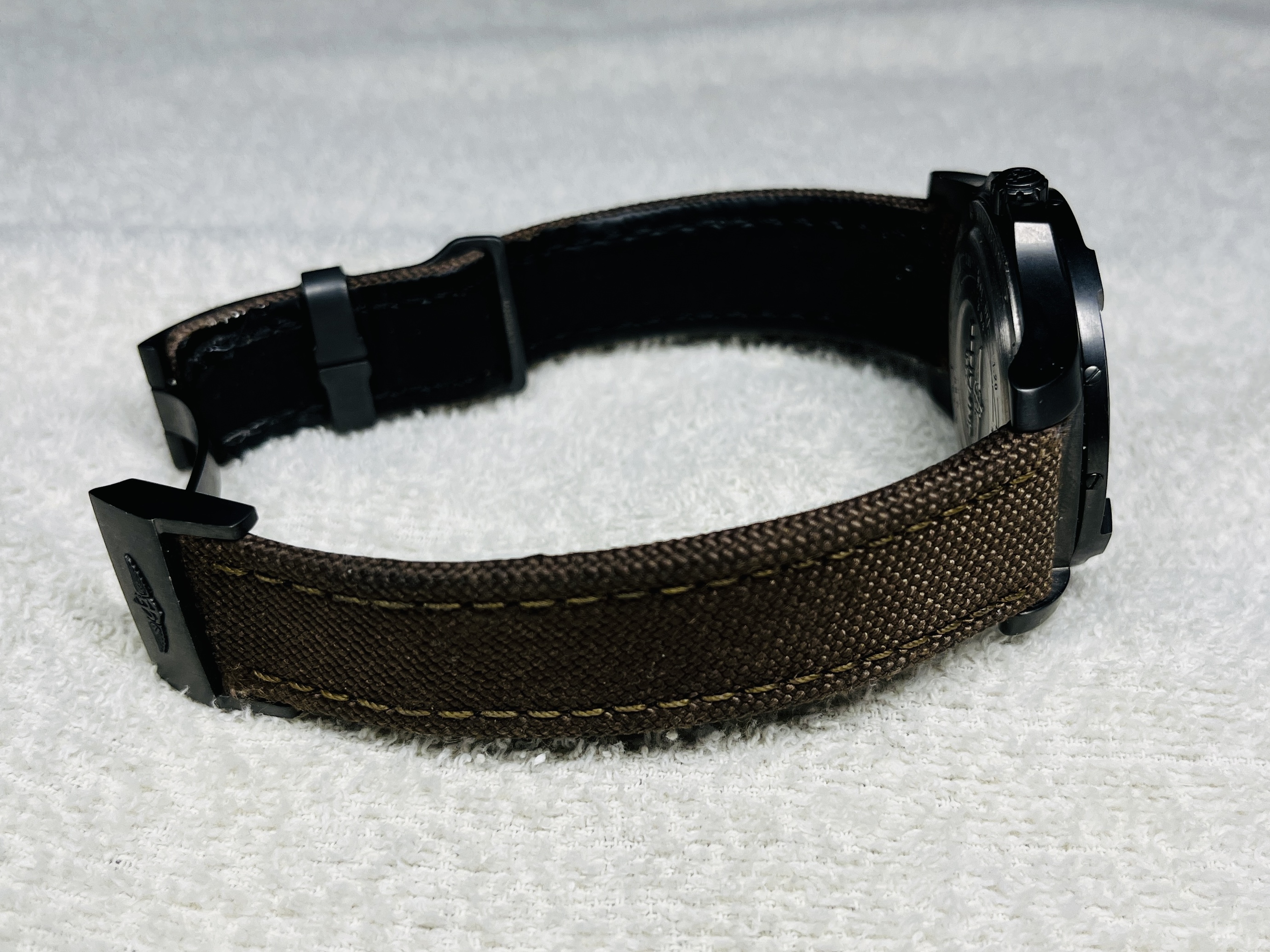 From the shop it came on a brown canvas strap & titanium deployant clasp.