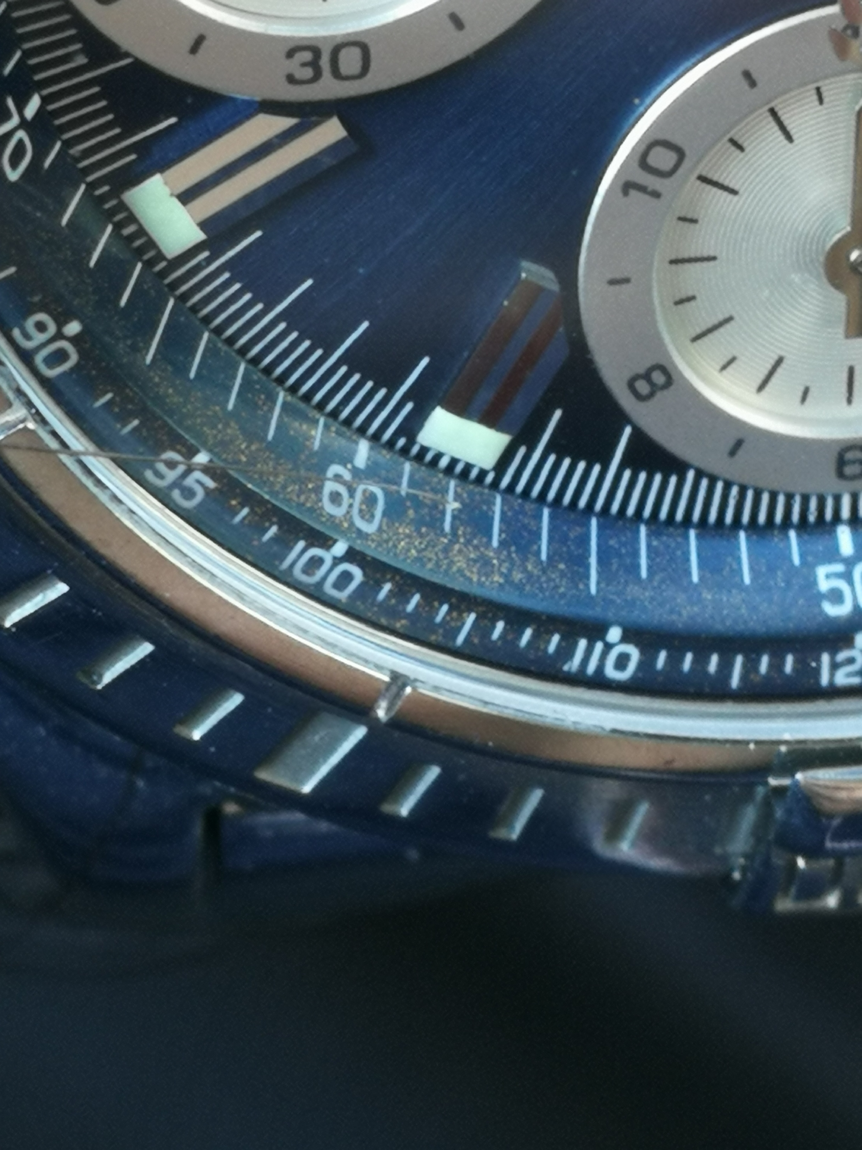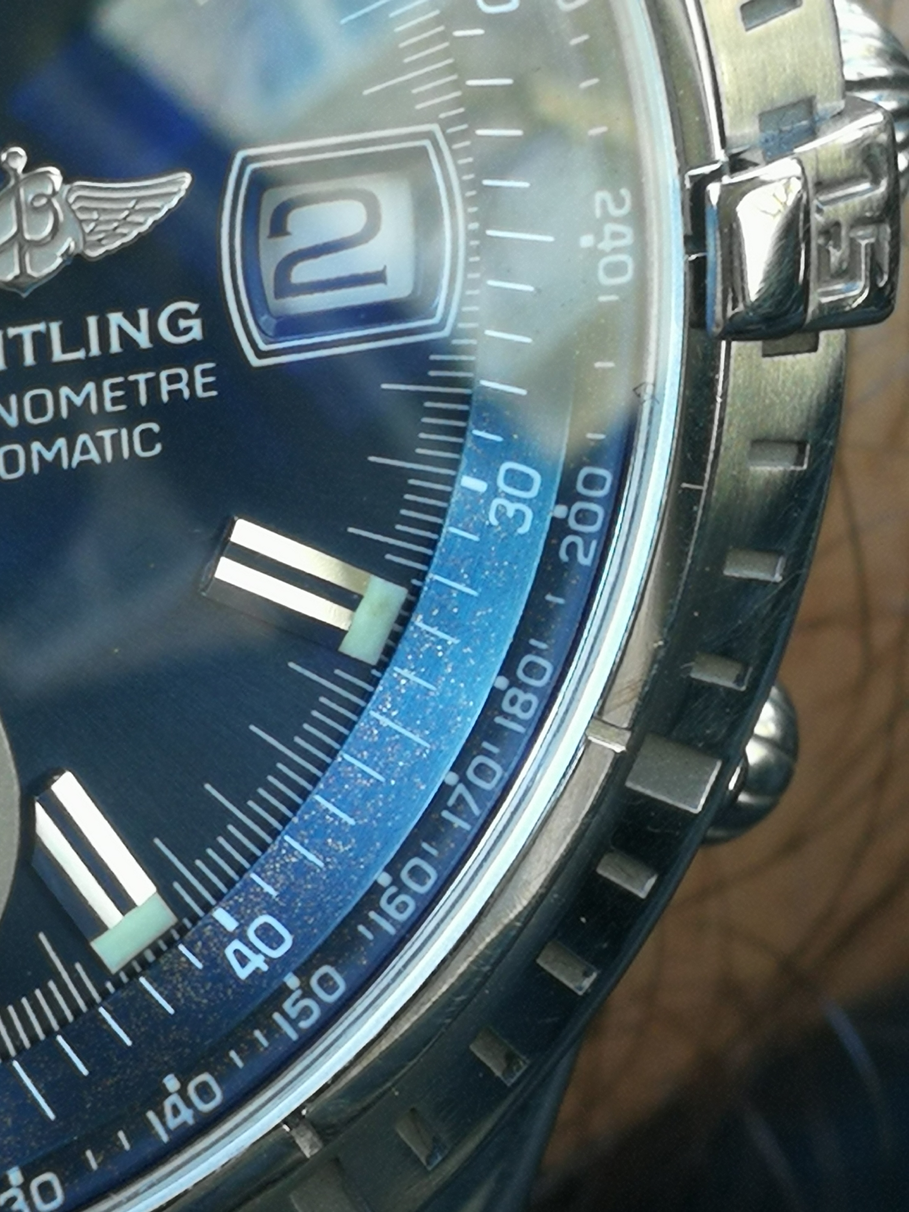 Posts 9 Likes 5 Britishman80 ·Apr 2, 2020 Hello all, Can you help with this. What os it could be on a chapter ring of a 16 years old chronomat? Rust? The movement is fine but if ots oxidation how come the dial is not affected? Thnx for opinion...