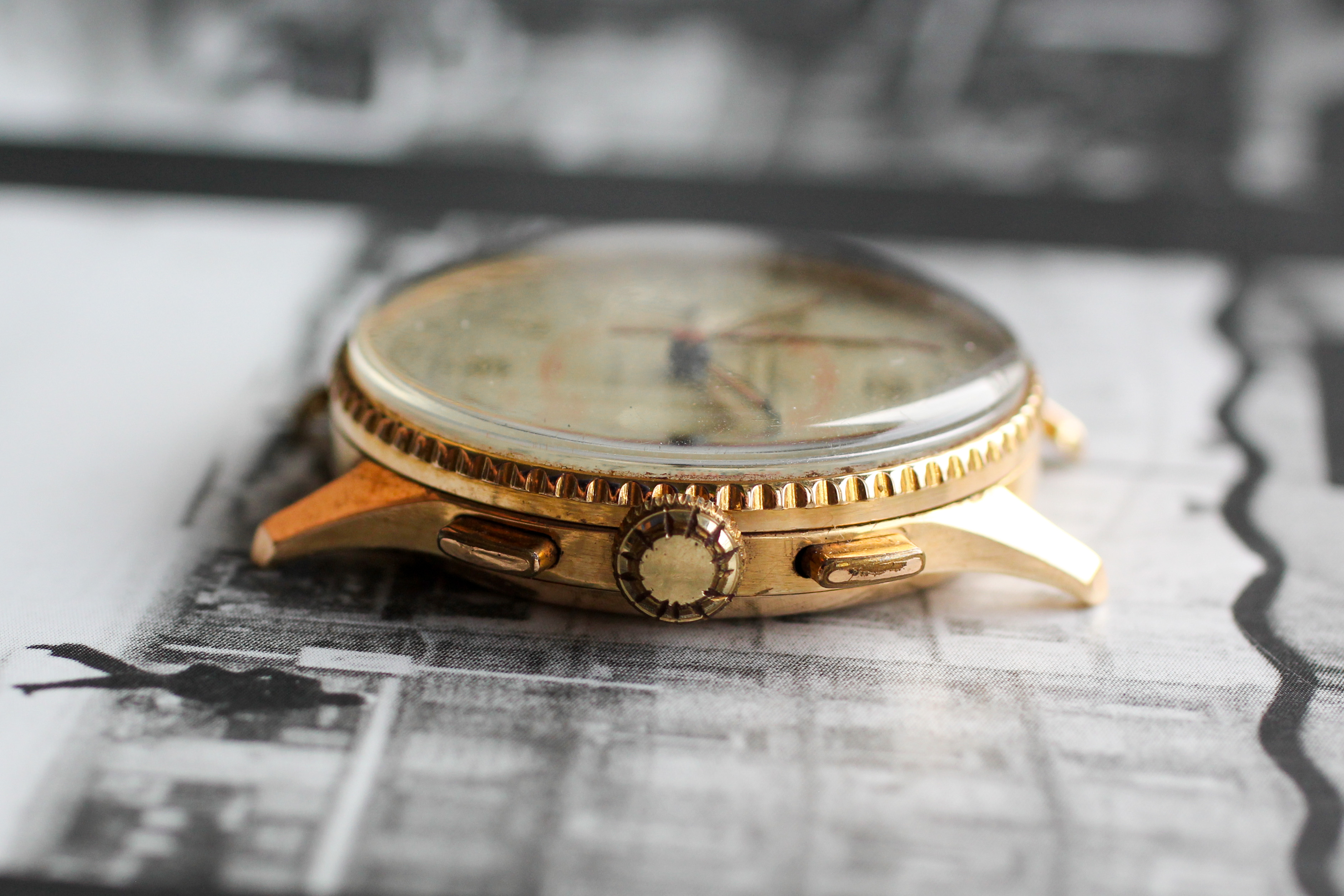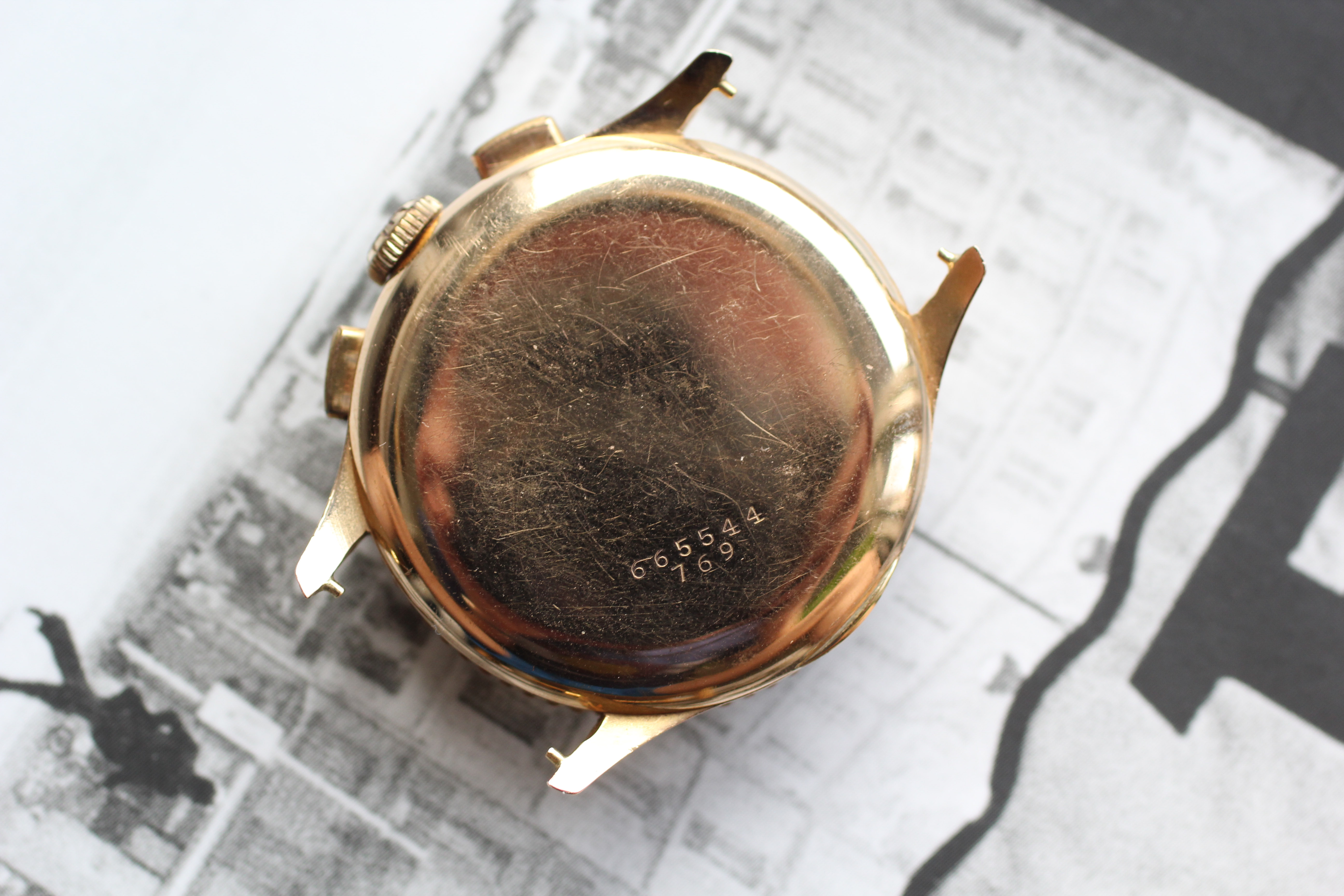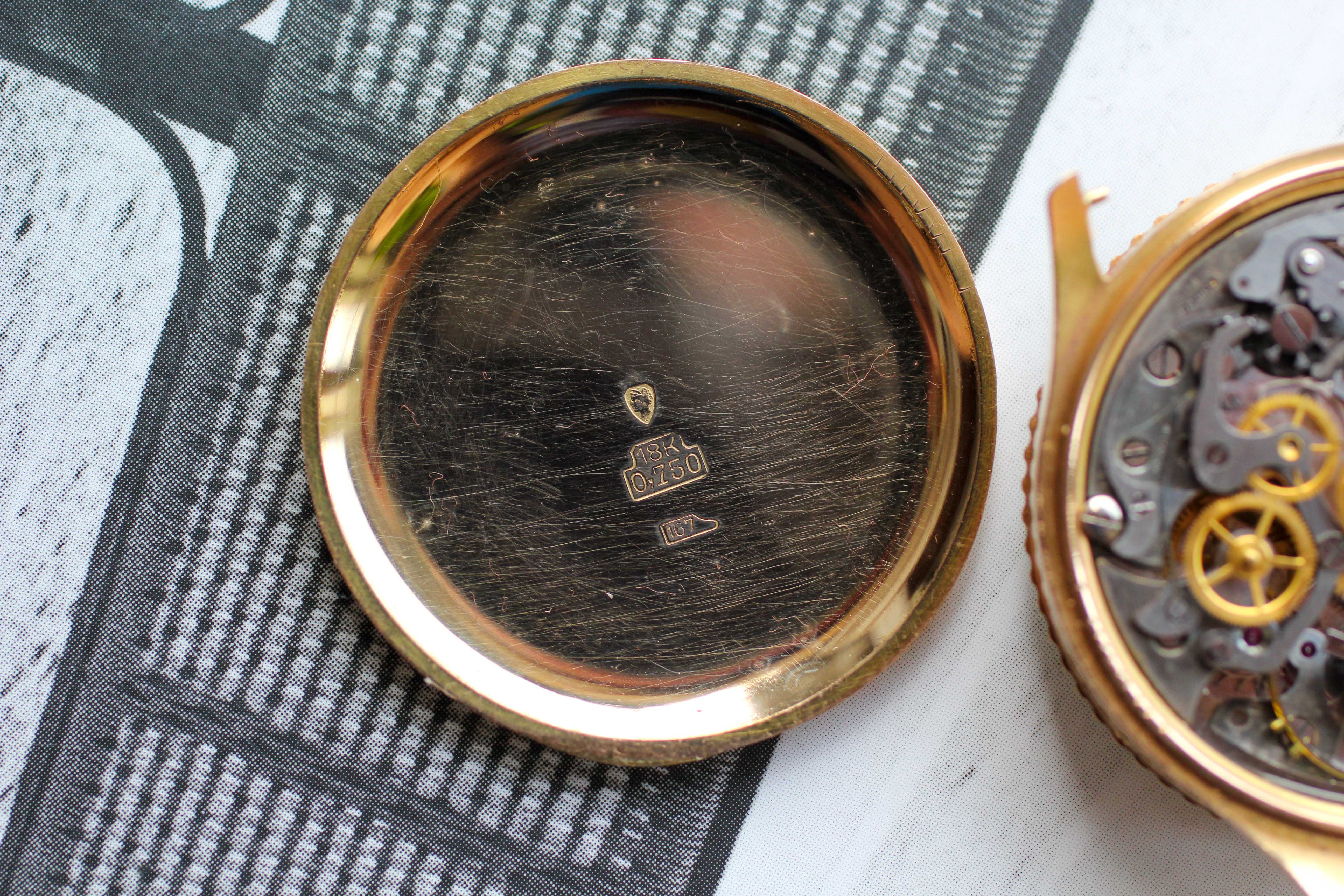 Case: Solid 18kt case is in great condition, with sharp case lines and intact engravings. Pushers show very little wear. Worth noting that the case takes "female" spring bars, which, yes, can still be sourced. Crown may be original but I have not studied the 769's enough to know what is correct. Case dimensions: 36mm x 12mm (18mm lugs).