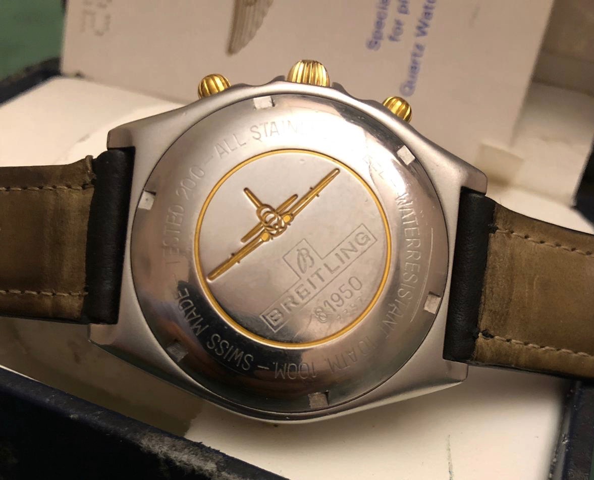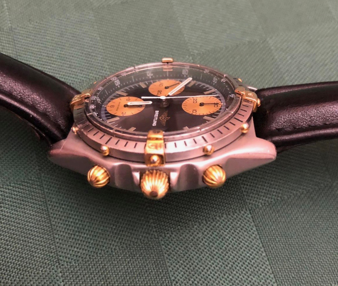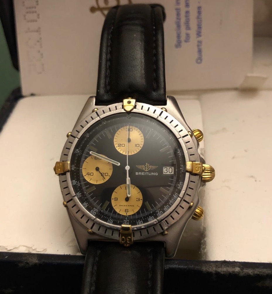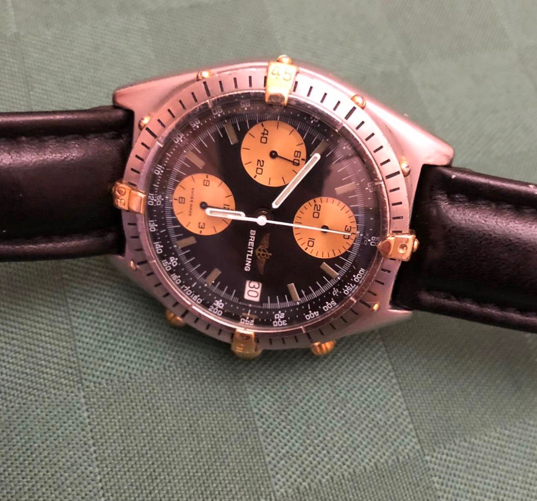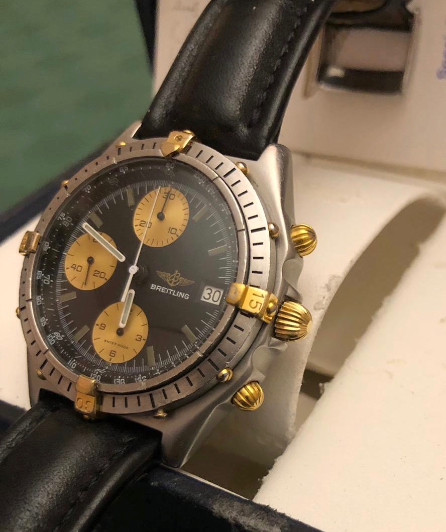 Stainless Steel and Yellow Gold 18kt case, 39 mm, Gold "Cavaliers" and external dots, Tachymetric scale that border the dial, Black Dial with tritium indexes (faded to gray) and white stick hands, golden chronometric sub-dials at 6, 9 and 12 o'clock with small black hands, rotating bezel with trim steel. Scratch resistant sapphire crystal, Breitling black leather strap (could fit a wrist up to 20 cm), Screw-down case with engraved the golden Breitling logo, the reference 81950 and the serial number. Golden crown and chrono pushers.