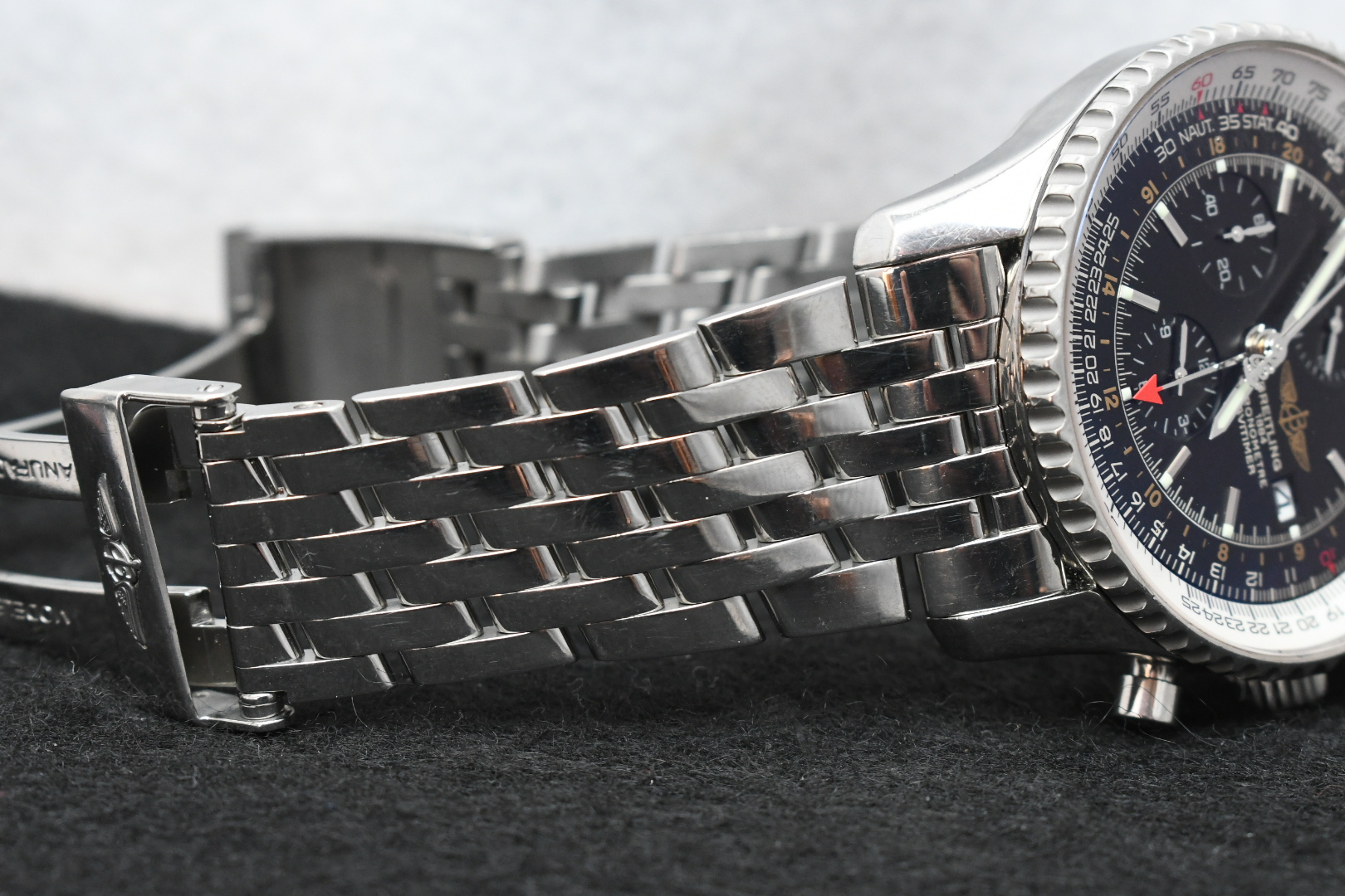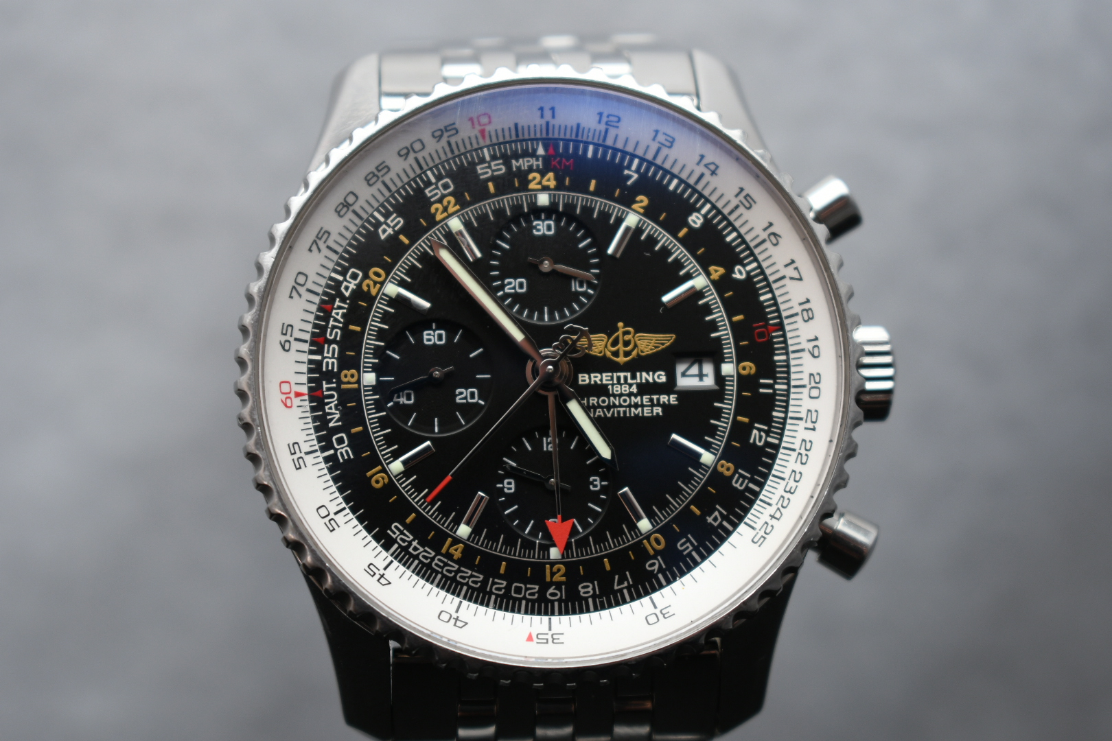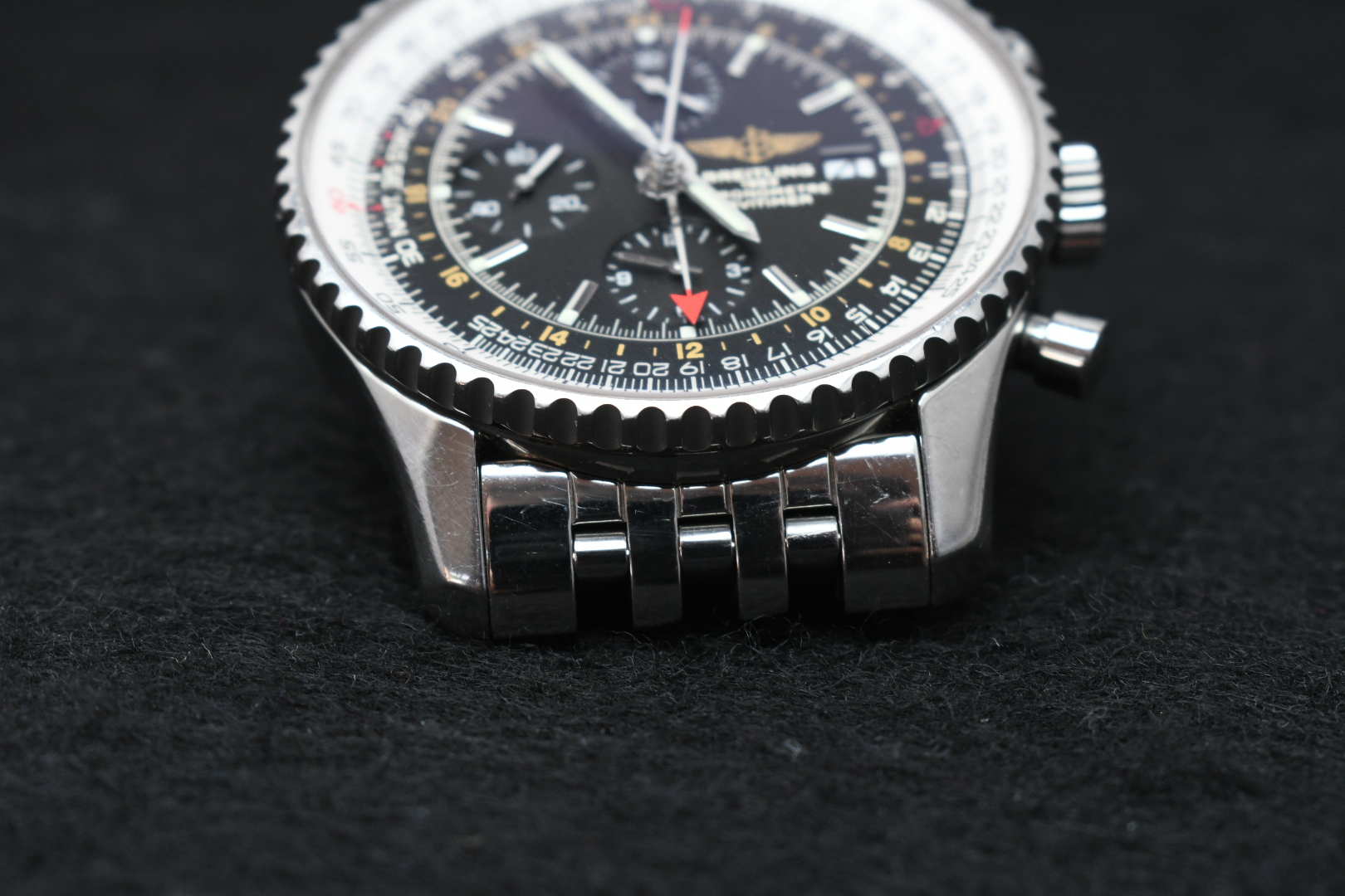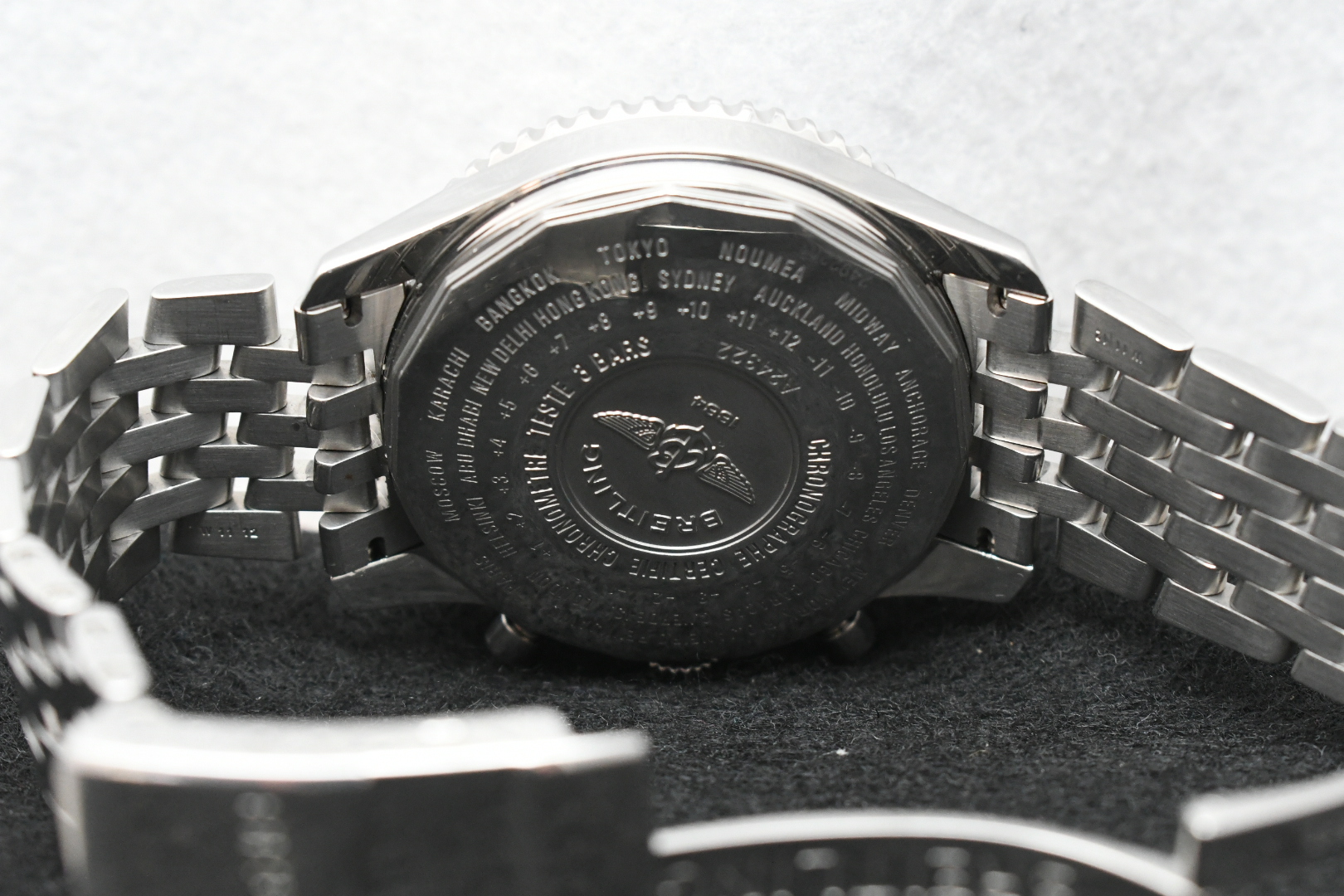 The Navitimer Chronograph GMT 46, with its black dial and effortlessly legible dual timezone system, is designed for the modern traveler. A red-tipped additional central hand can display the time (on a 24-hour scale) at any destination and the caseback is engraved with the time zones of the world’s major cities. The self-winding chronograph movement is housed in the 46mm case, which has a bidirectional rotating bezel and Breitling’s iconic circular slide rule for onboard calculations. Powered by a self-winding Breitling 24 caliber, this sophisticated tool watch is presented on a black alligator or leather strap, or Navitimer stainless steel bracelet.