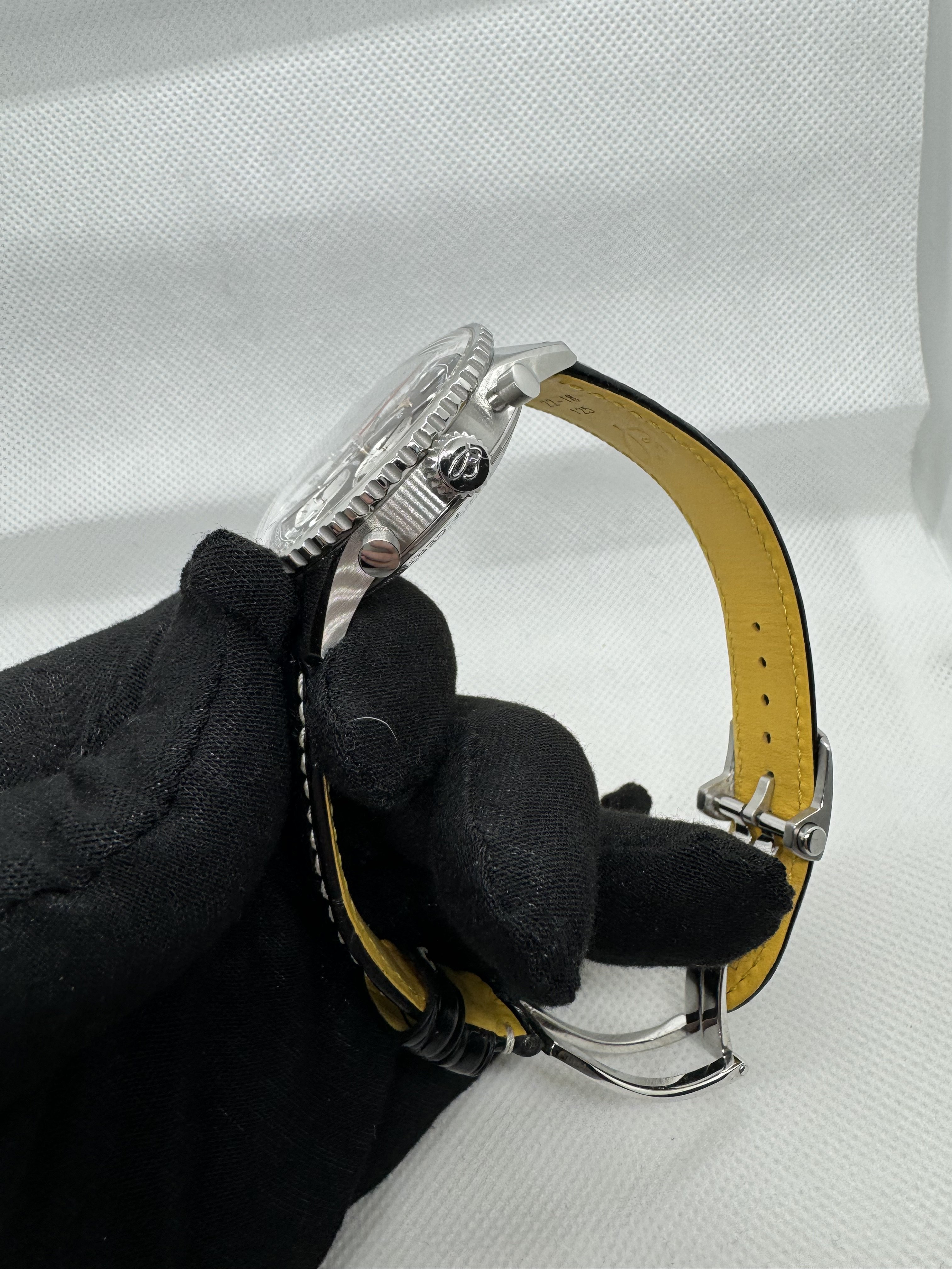 Presented on a black alligator leather strap with contrasting white stitching, this reinvigorated model features a 43mm stainless steel case with a bidirectional, slide rule bezel and two gaskets.