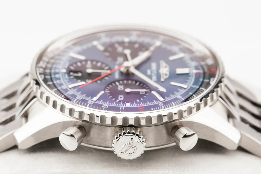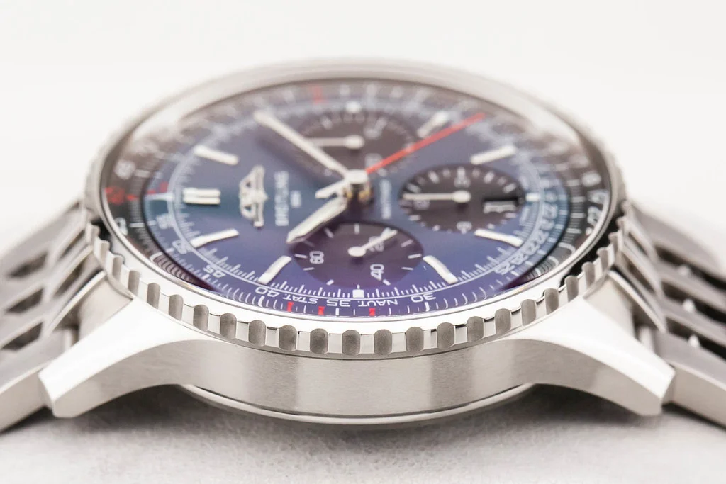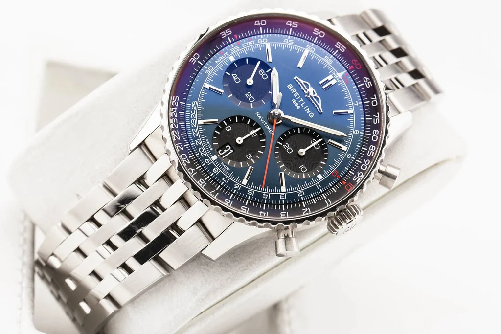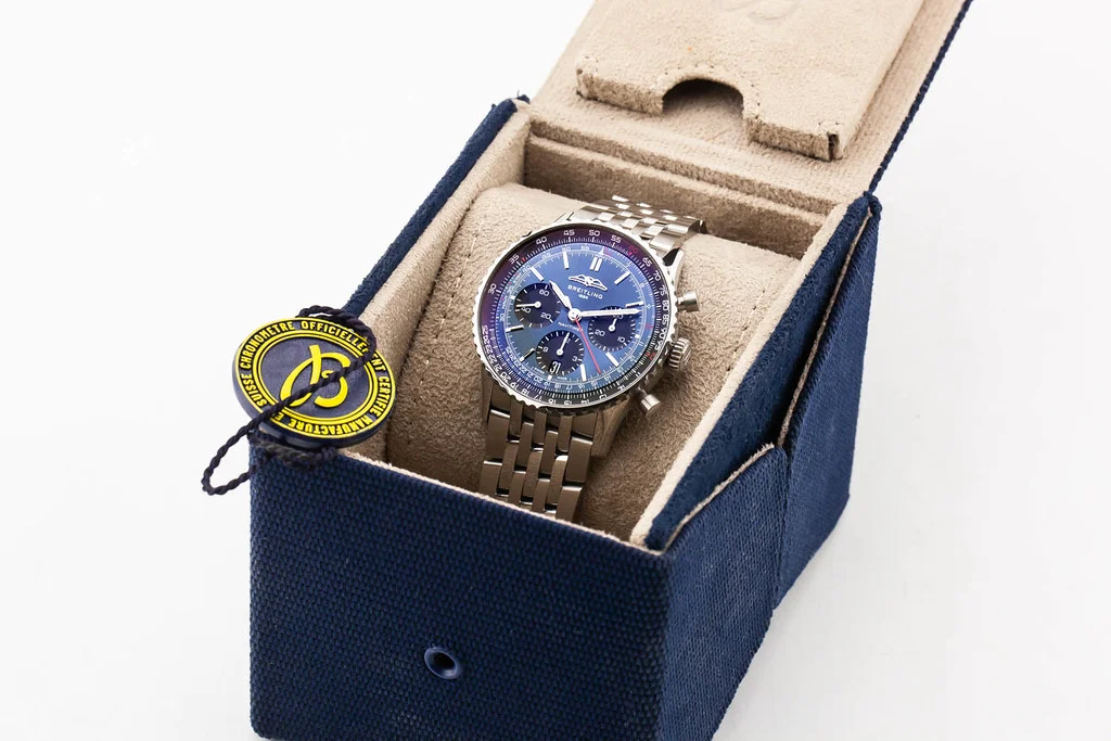 ·Up for sale is an excellent condition Breitling Navitimer B01 Chronograph 41mm Blue Dial on Bracelet, reference # AB0139241C1A1. It comes with everything shown - watch, box and hang tag. No warranty card.