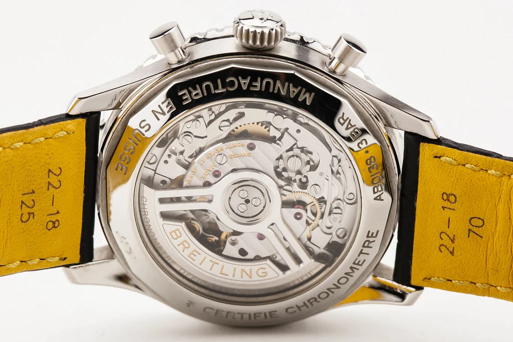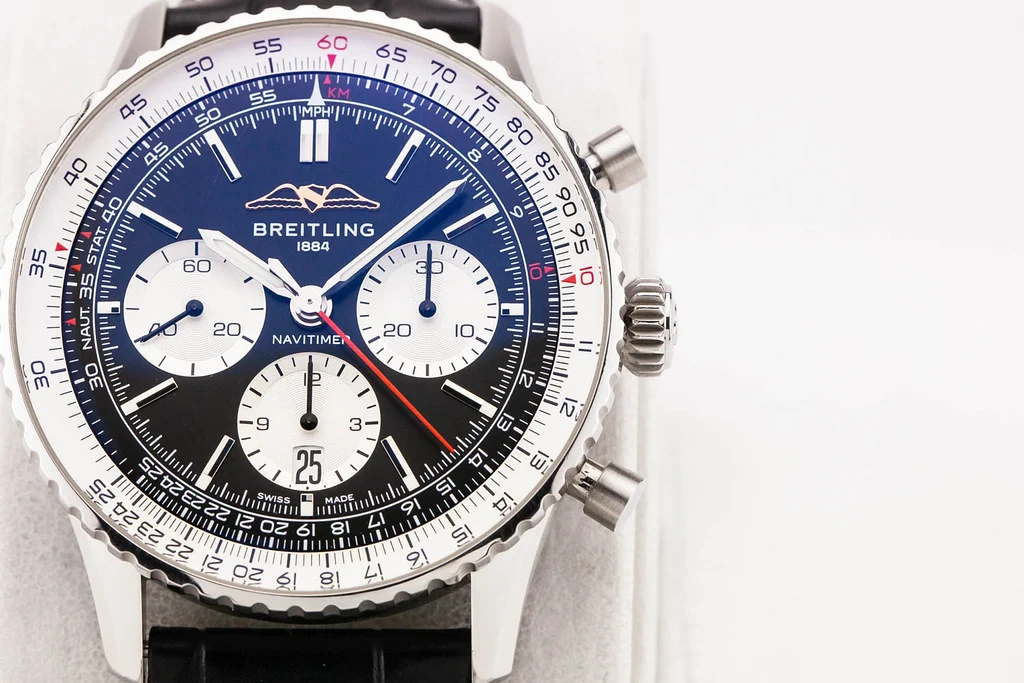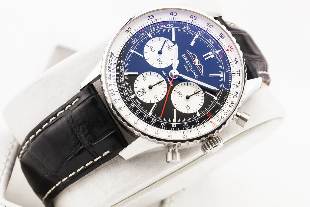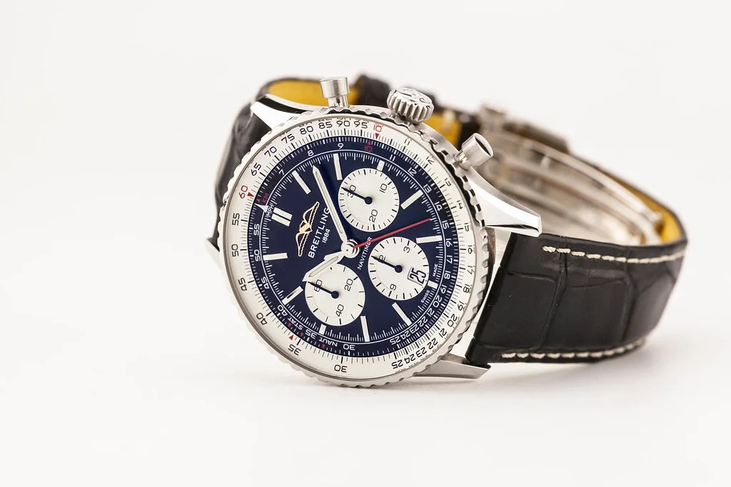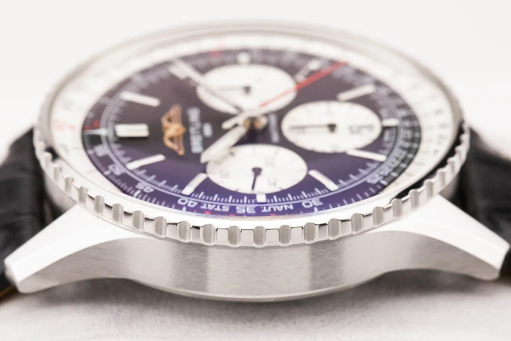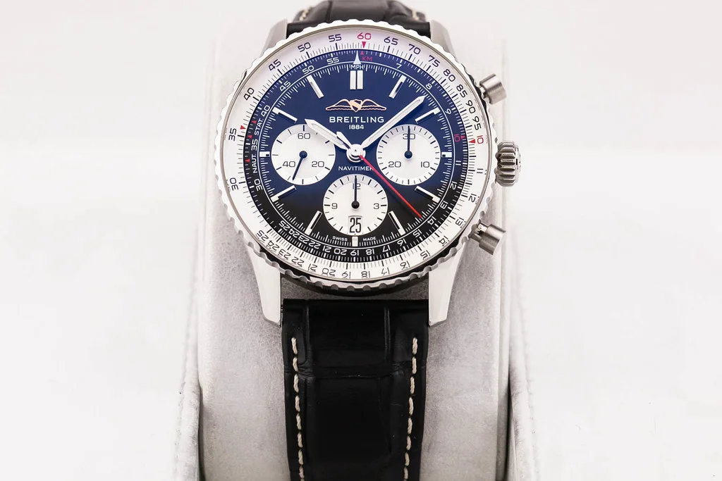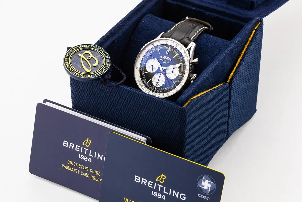 ·Up for sale is an excellent condition Breitling Navitimer B01 Chronograph 43mm Black Dial on Leather Strap, reference # AB0138211B1P1. It comes complete with all boxes, papers, booklets, hang tag and Breitling Warranty Card dated November 2022.