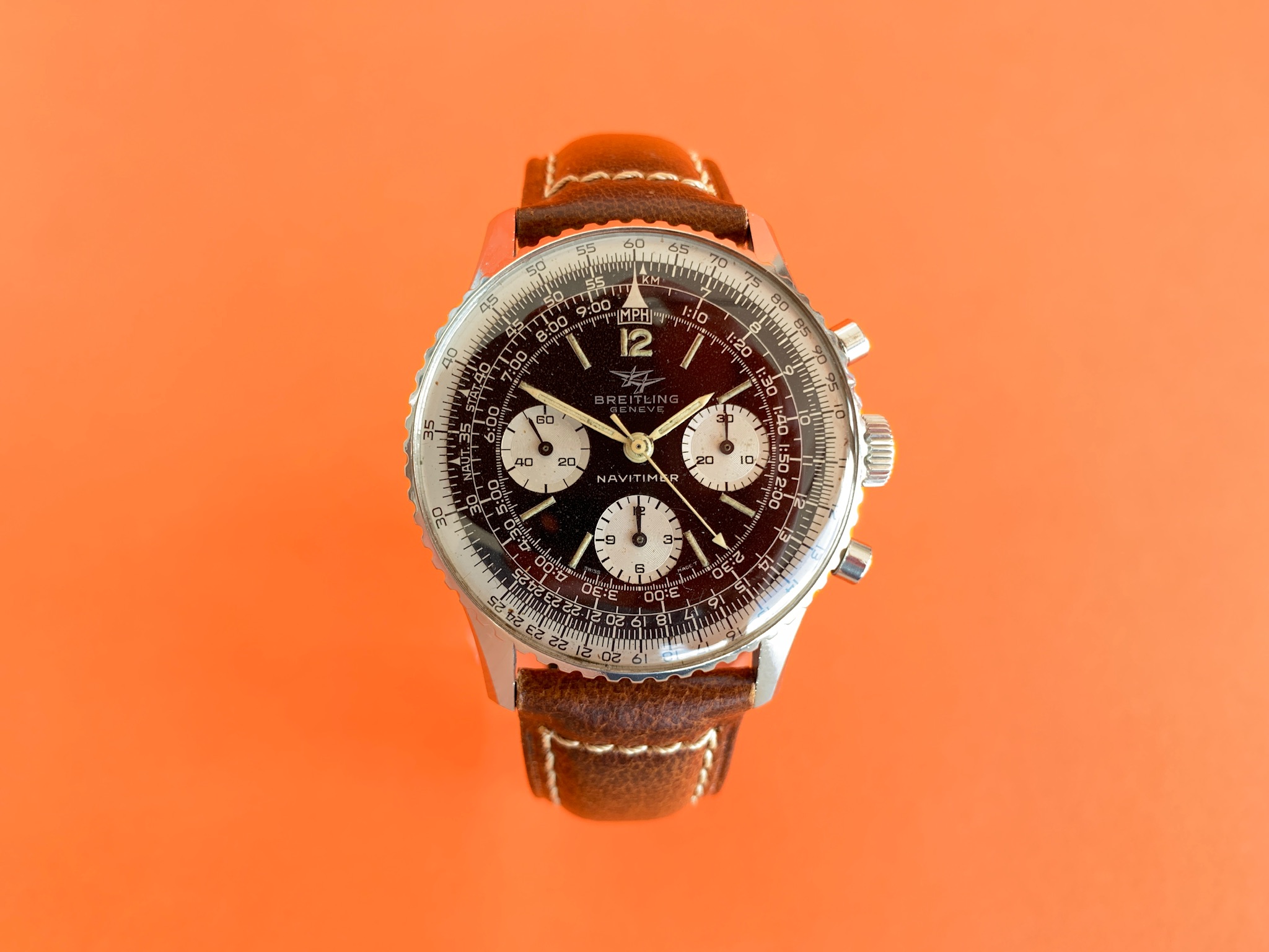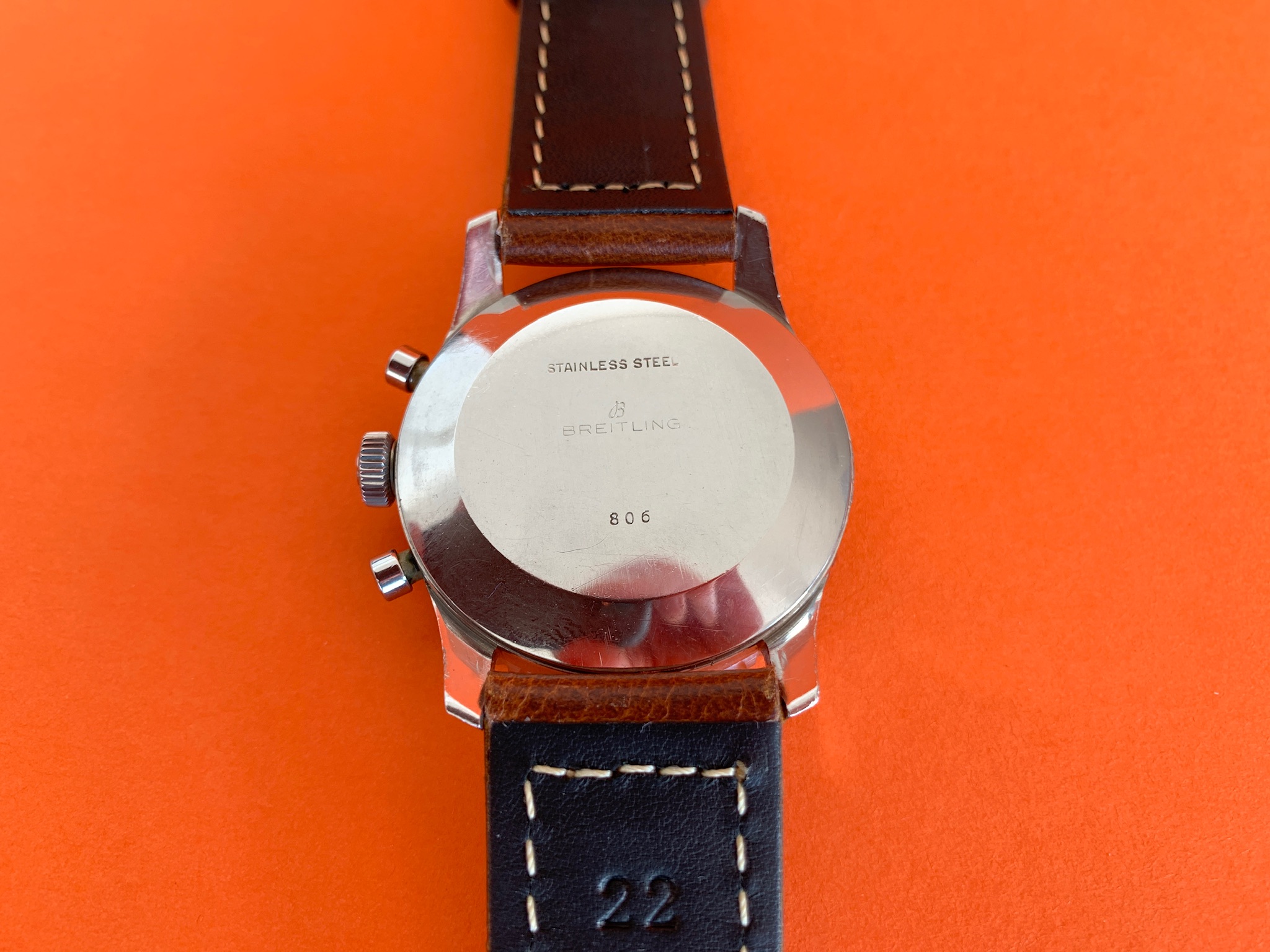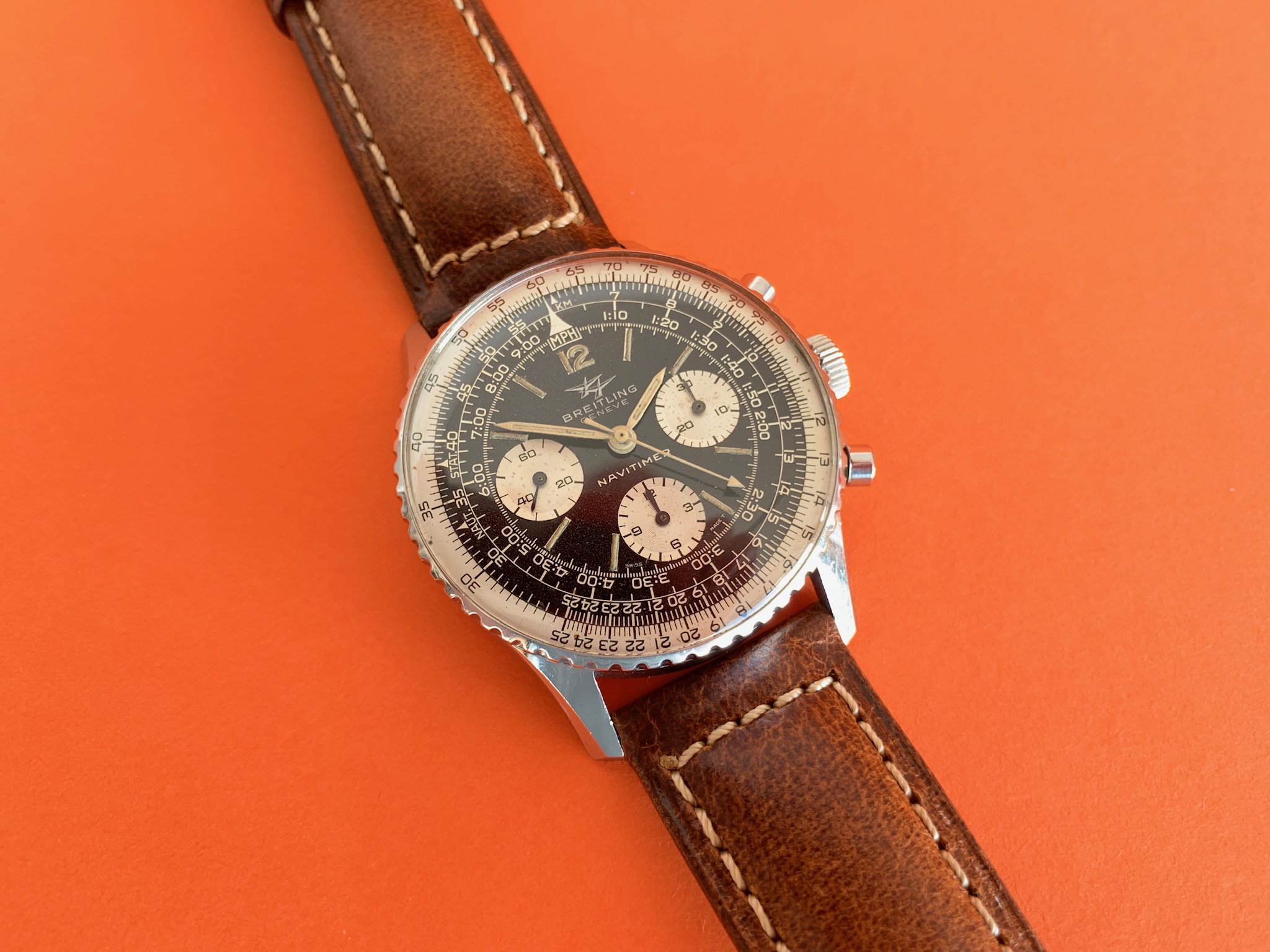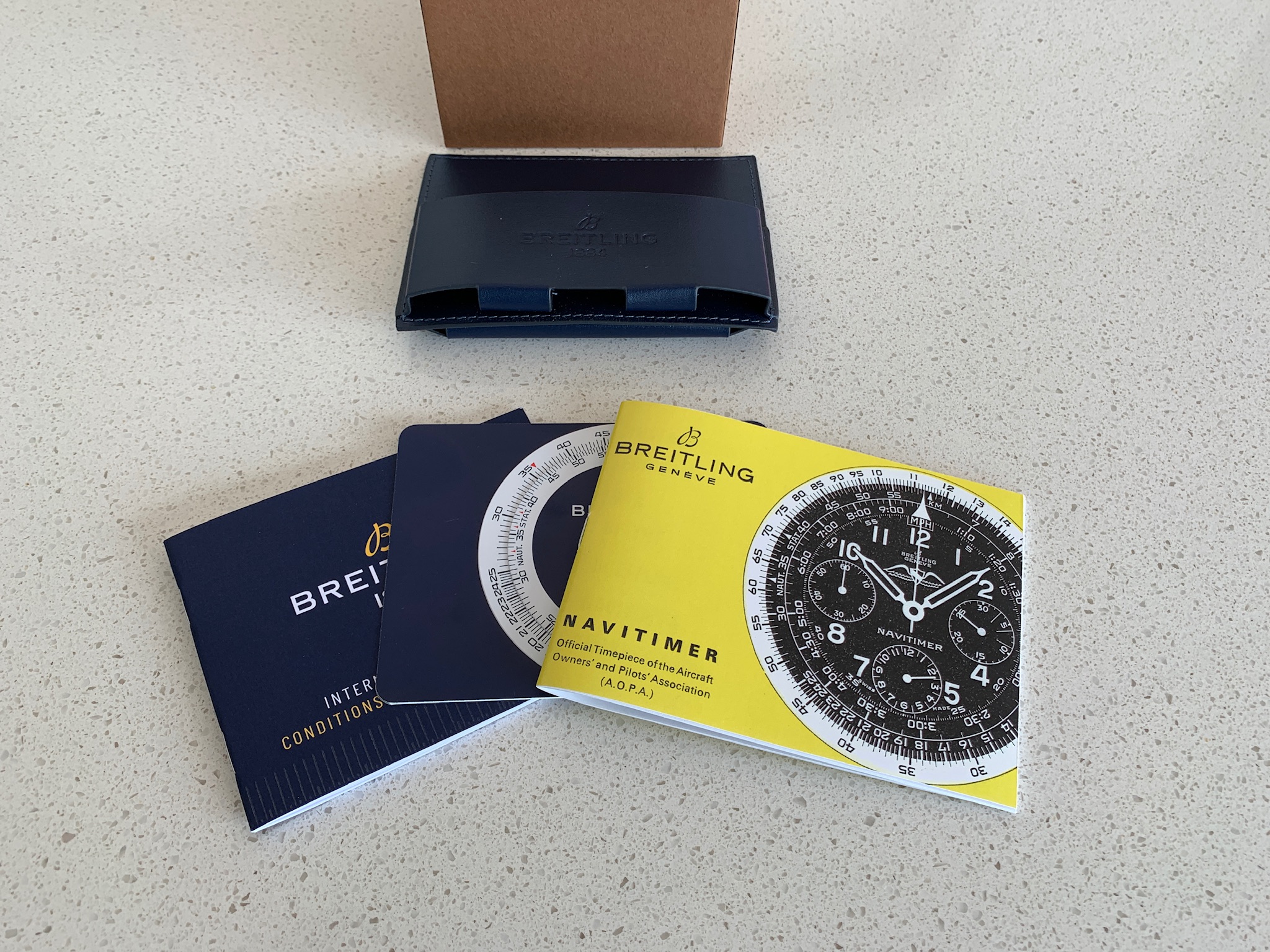 There are no original boxes or papers, but the watch will come in a new modern Breitling box that includes a very nice travel case, with some documents including a practice slide rule and re-print of the original Navitimer manual. I have mounted the watch on the brand new box-stitched strap pictured.