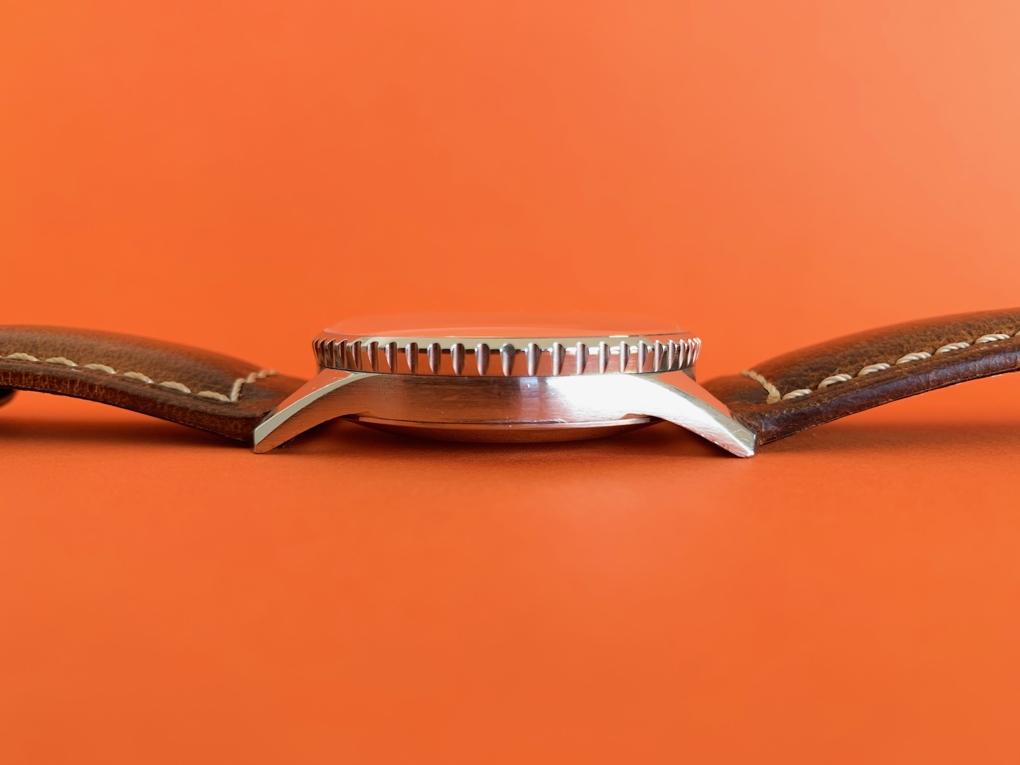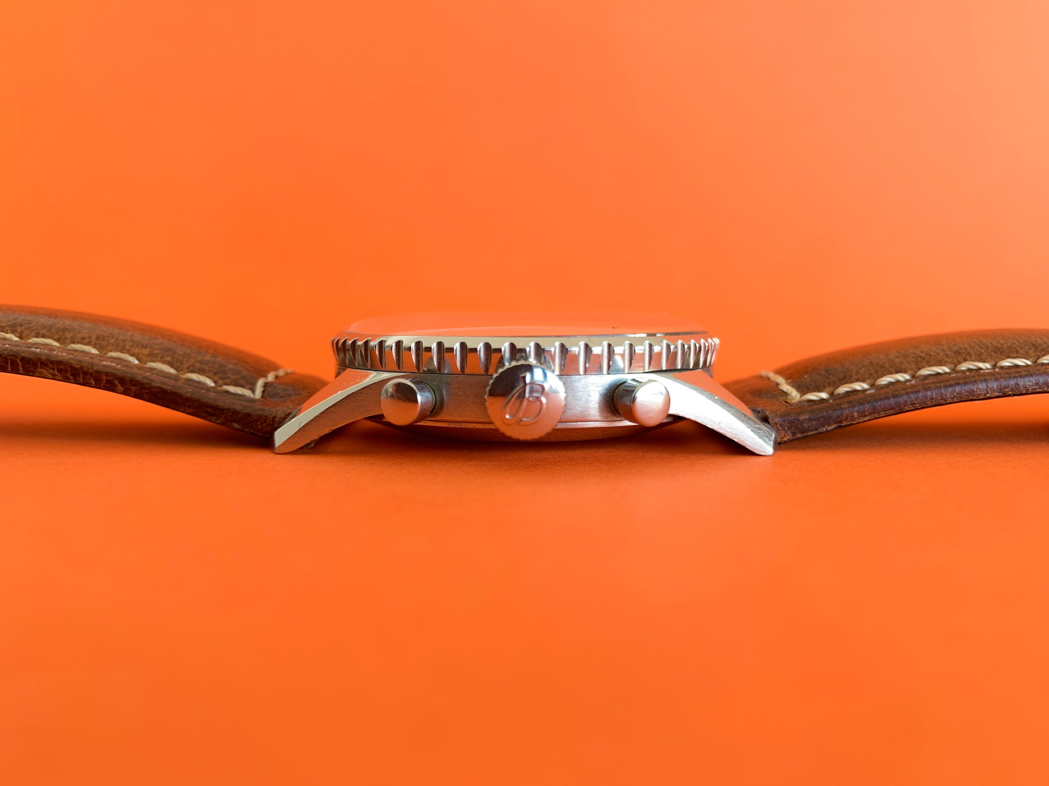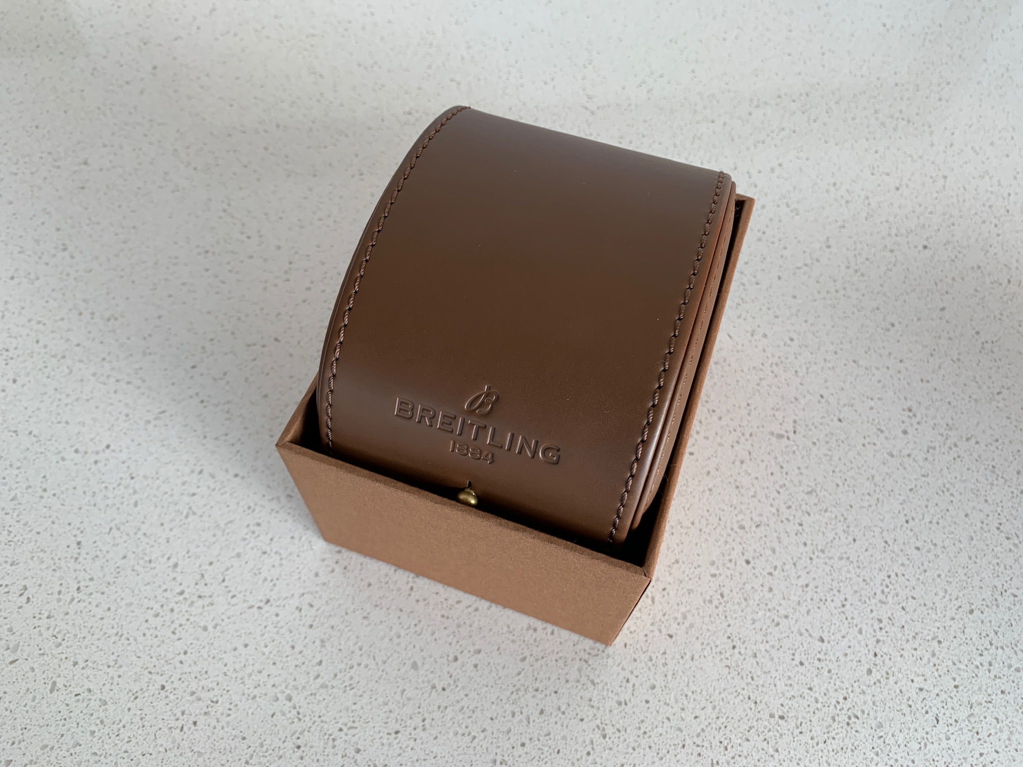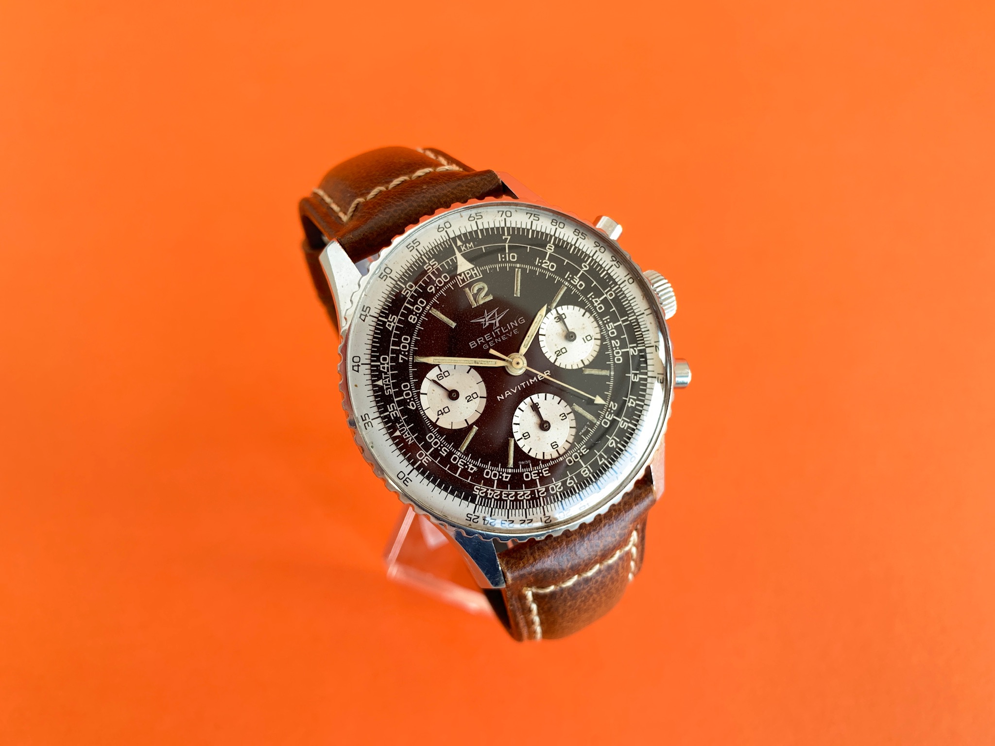 There are no original boxes or papers, but the watch will come in a new modern Breitling box that includes a very nice travel case, with some documents including a practice slide rule and re-print of the original Navitimer manual. I have mounted the watch on the brand new box-stitched strap pictured.