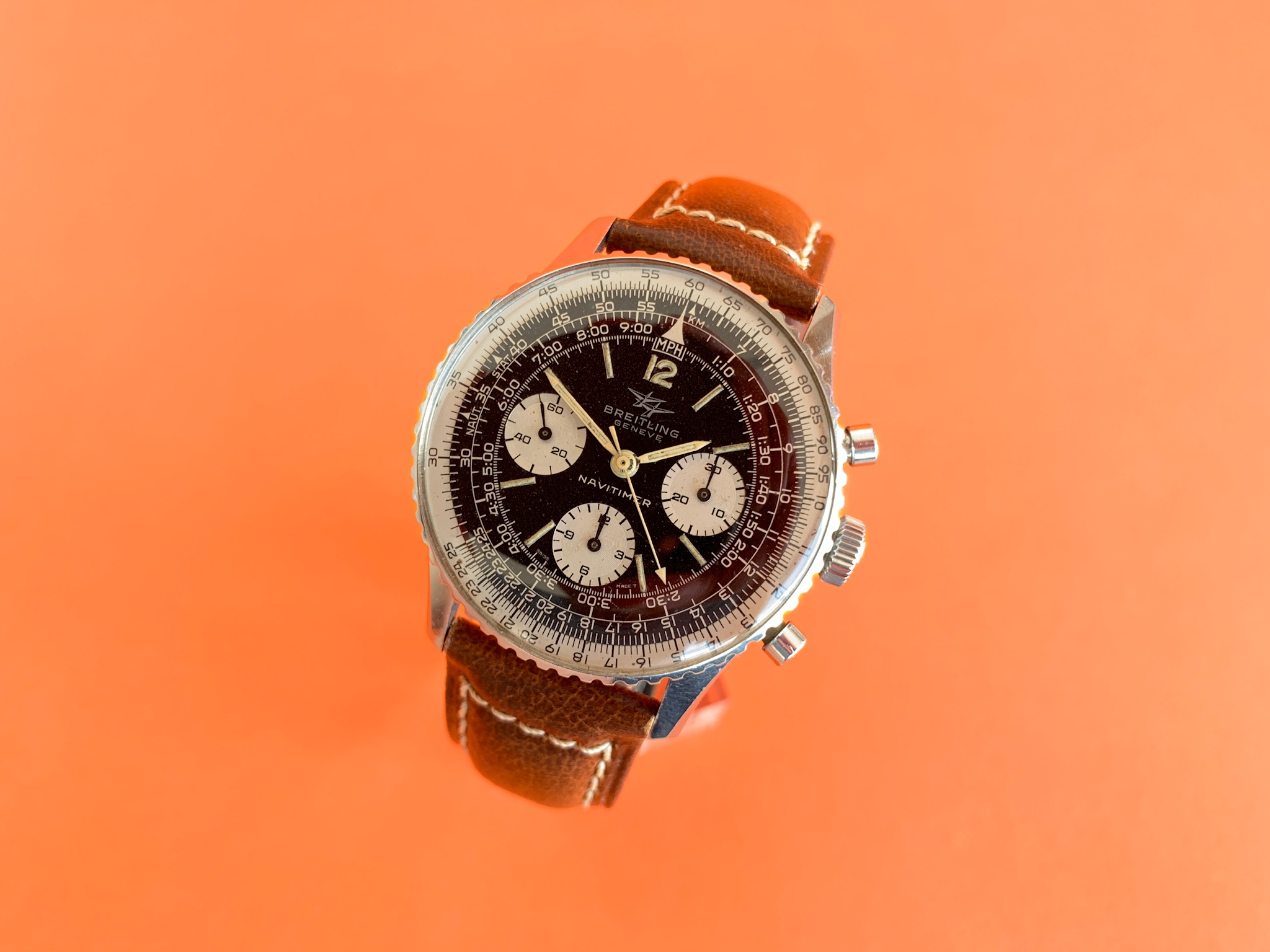 ·On offer is a 1964 Breitling Navitimer Reference 806 with the small reverse-panda sub-dials and "Twin Jets" logo.