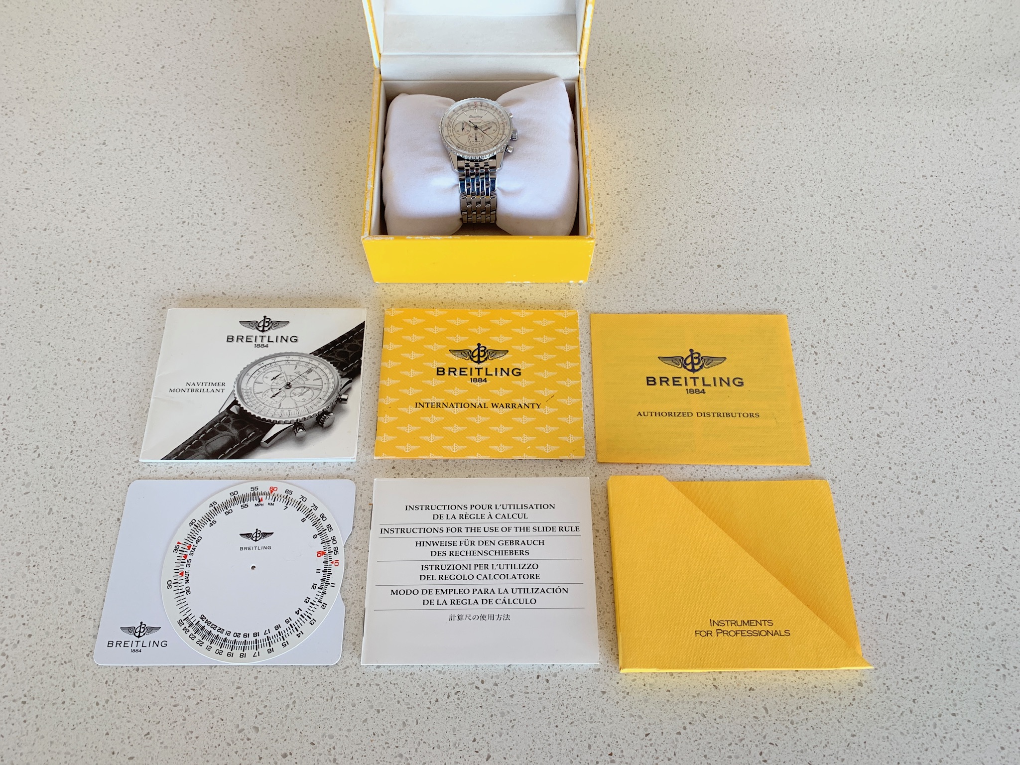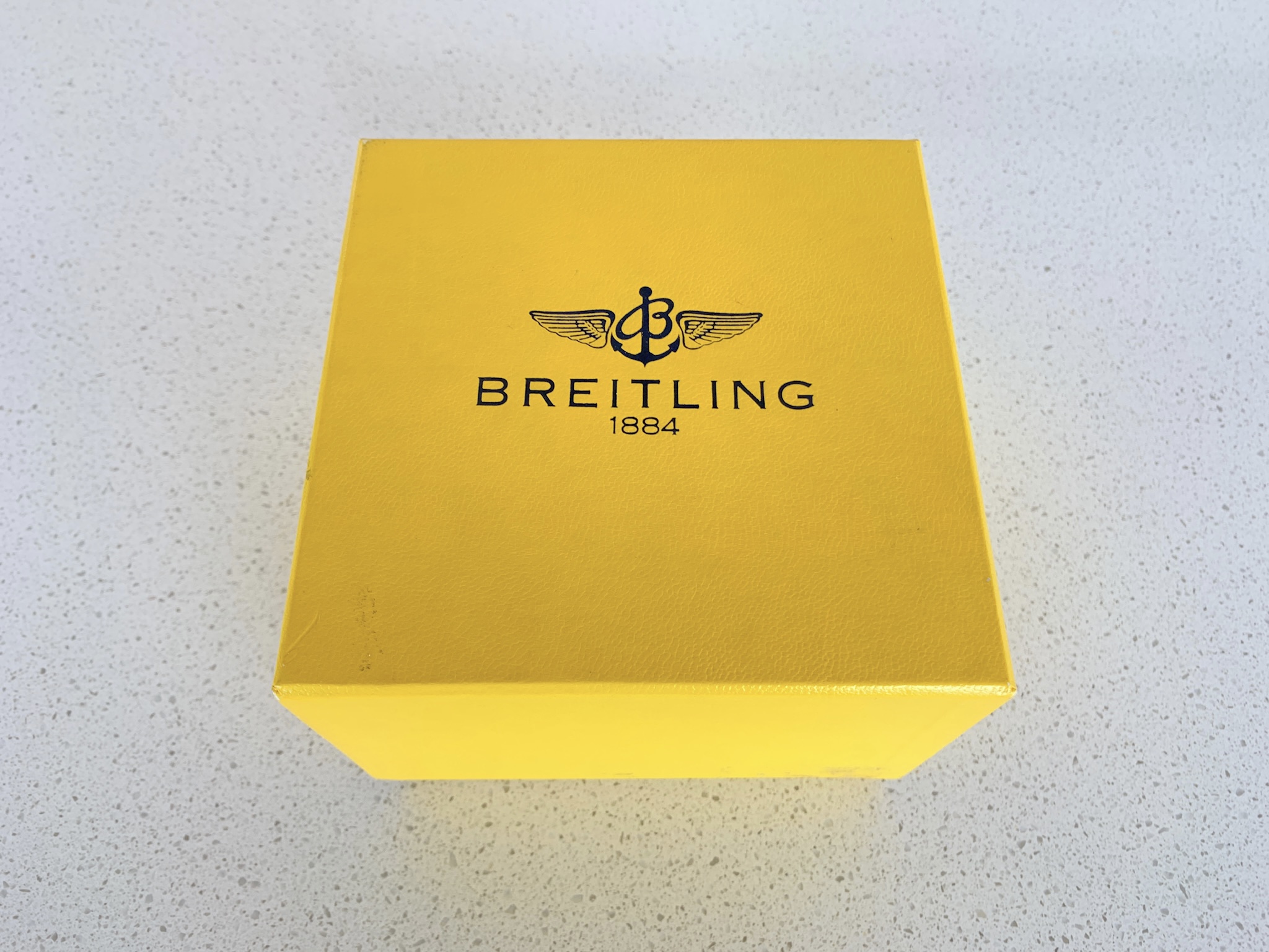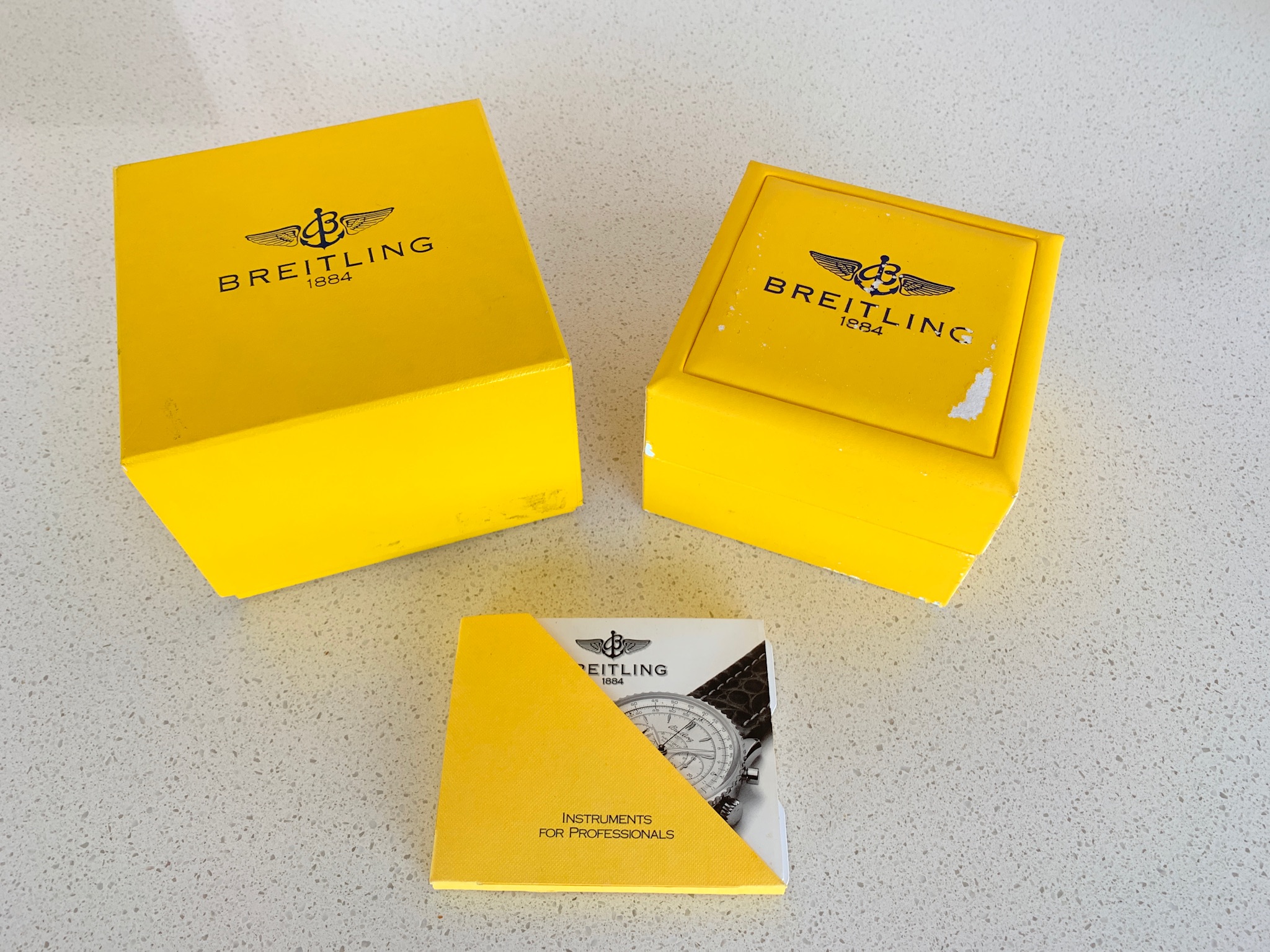 This watch comes with a full collectors set, which is quite rare. It is mounted on an early incarnation of the Navitimer bracelet with a rare D-buckle clasp. The bracelet will fit a wrist up to 17.2cm or 6.75". There are no spare links. The watch also comes with an additional pool-blue Geckota strap. While this reference was made from 1996 to 1998 (hence c. 1998), the warranty card is dated late-1999, and the serial number has not been filled in. The Breitling yellow inner leatherette boxes are notorious for peeling, and unfortunately this one is no different. If the buyer wants me to substitute in a different period correct box set, we can discuss a small additional fee for that.