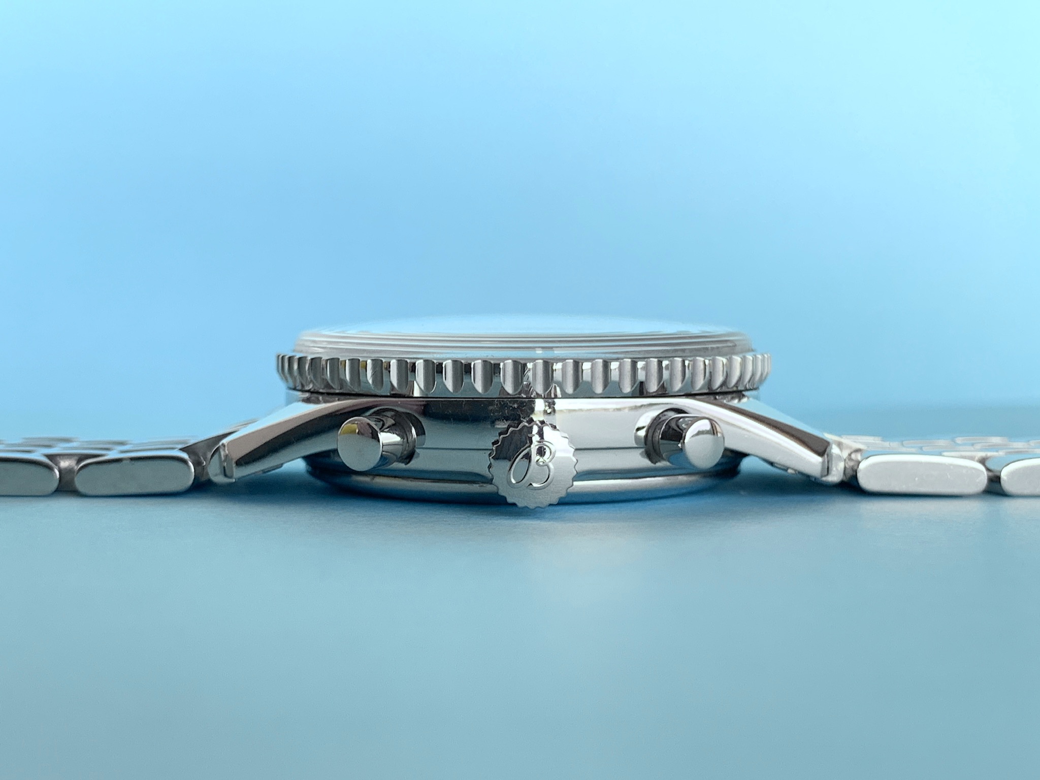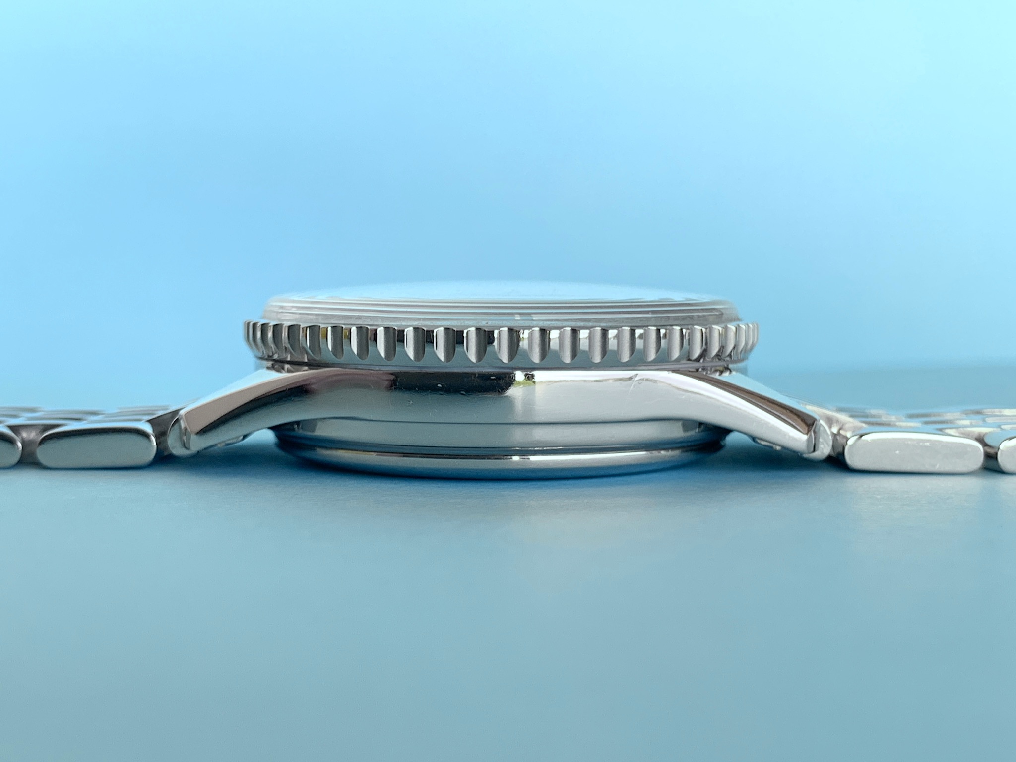 As can be seen from the attached photos, the watch is in excellent condition. The watch was wrongly configured when I acquired it but had "good bones", so I had it rectified. There are light scratches on the steel and a few marks on the slide rule, but the rest of the watch is perfect. The only point of note is that the clasp had incorrectly been brushed at some time in the past, so I had it re-polished. Slight brush marks are still visible.