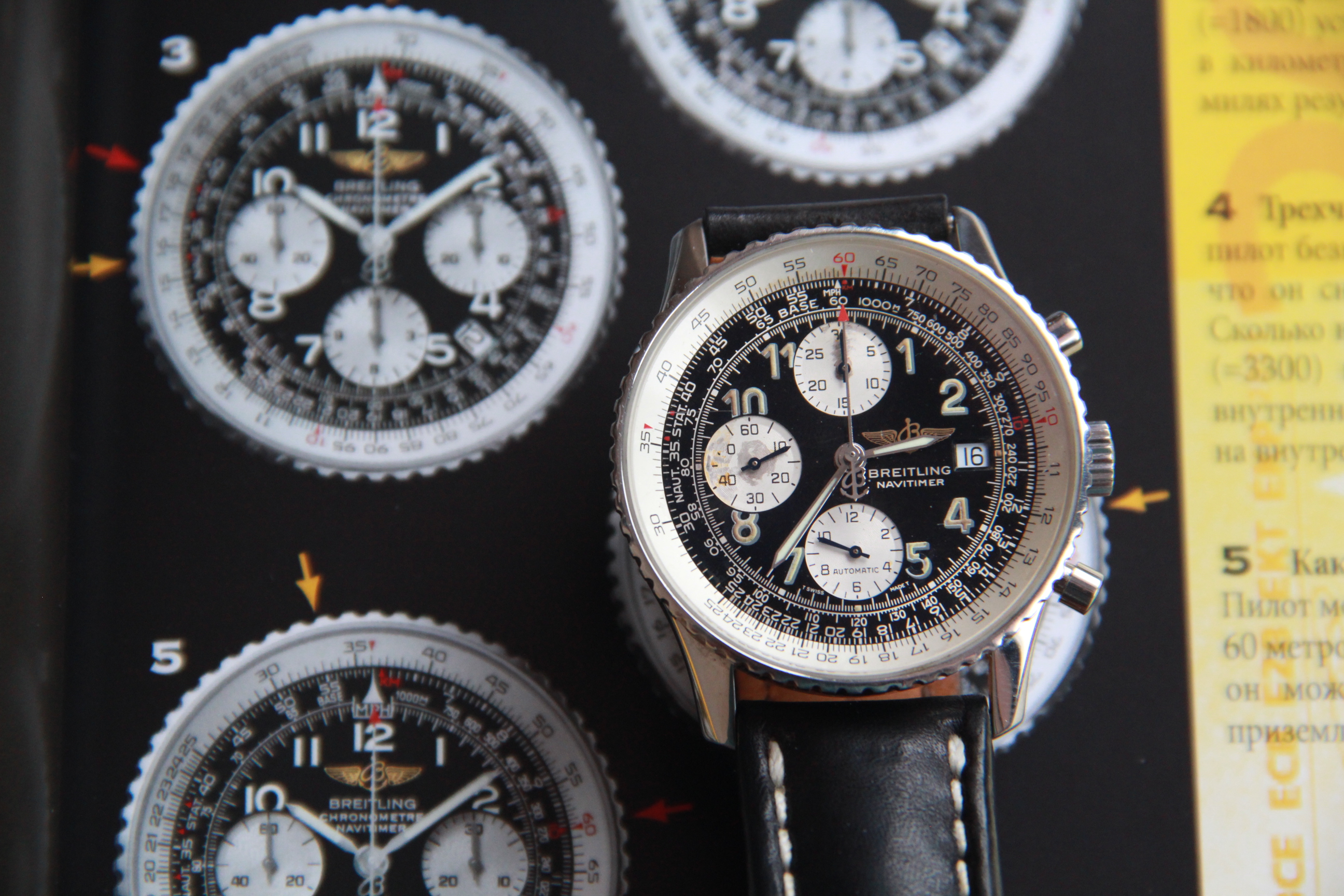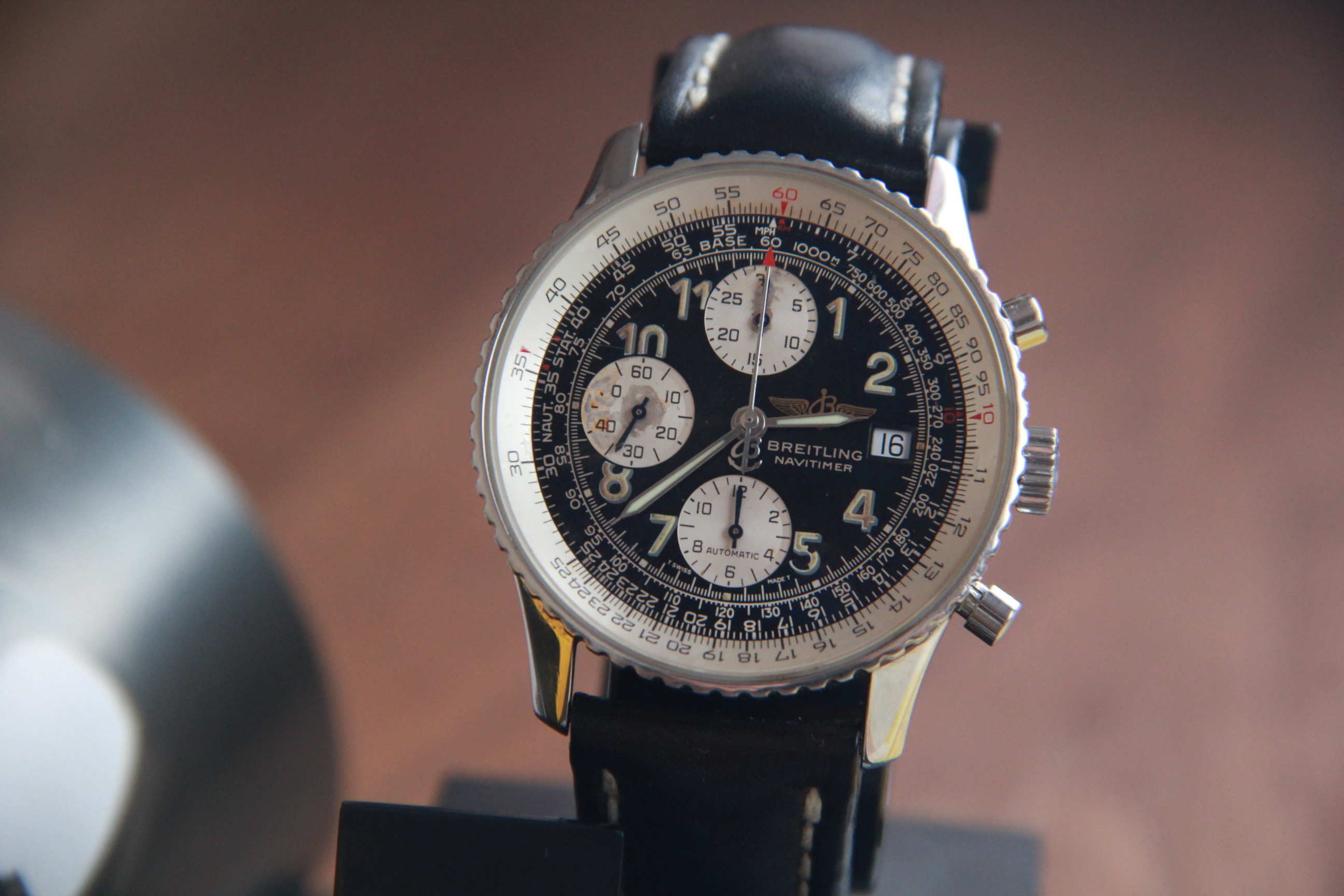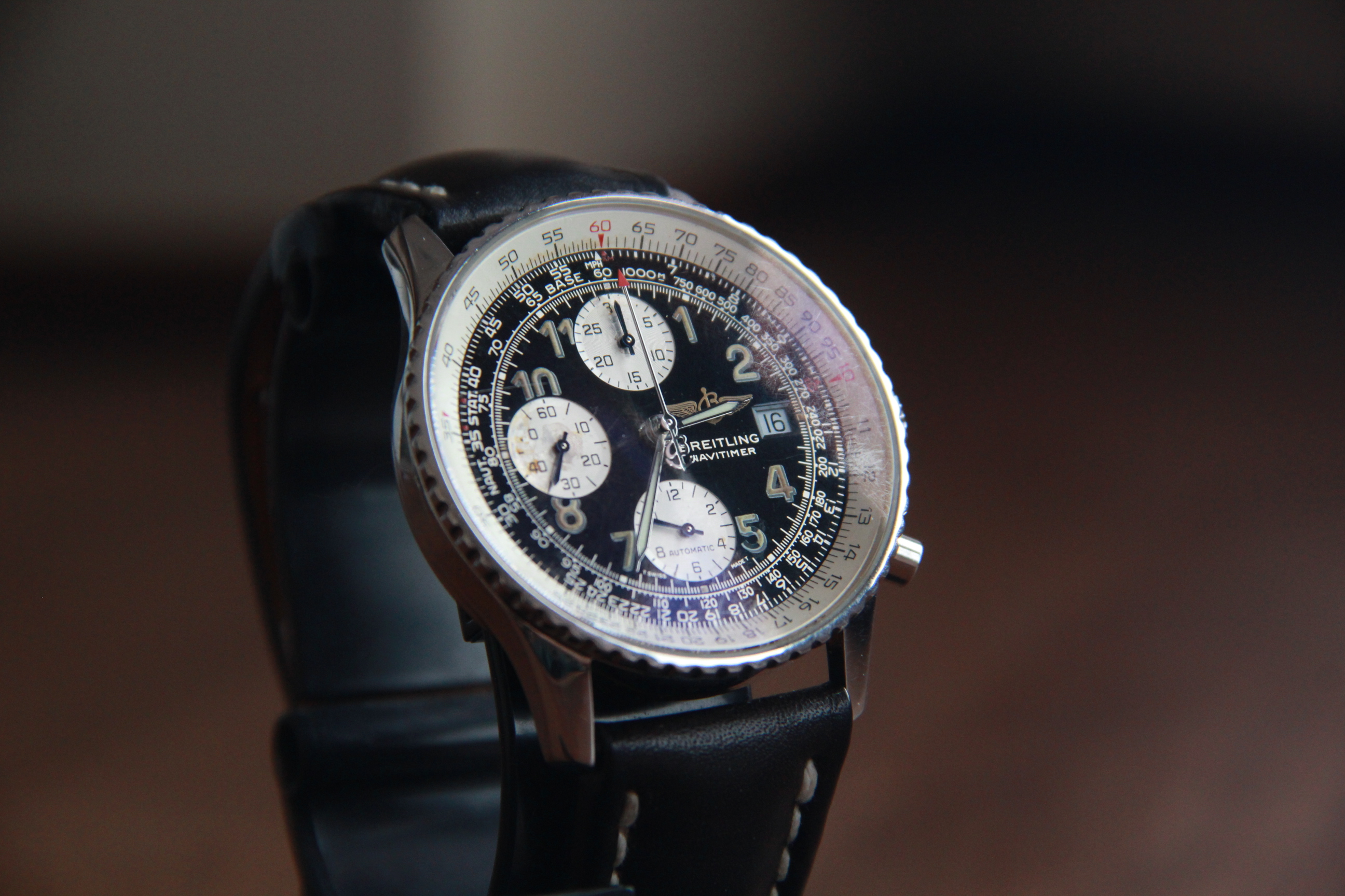 ·For sale Breitling OLD navitimer A 13022. The watch is in normal condition. Dial has traces of time and loss of coverage on the drive around 9 and 12 o'clock. Also, the lum on the number "5" is partially lost. the bezel rotates with tension. The watch keeps a great time . There are no boxes and documents. The original belt is in normal condition. The hand of the chronograph Drive, which is located around 6 o'clock, constantly counts down the time. I put a low price taking into account the above comments.