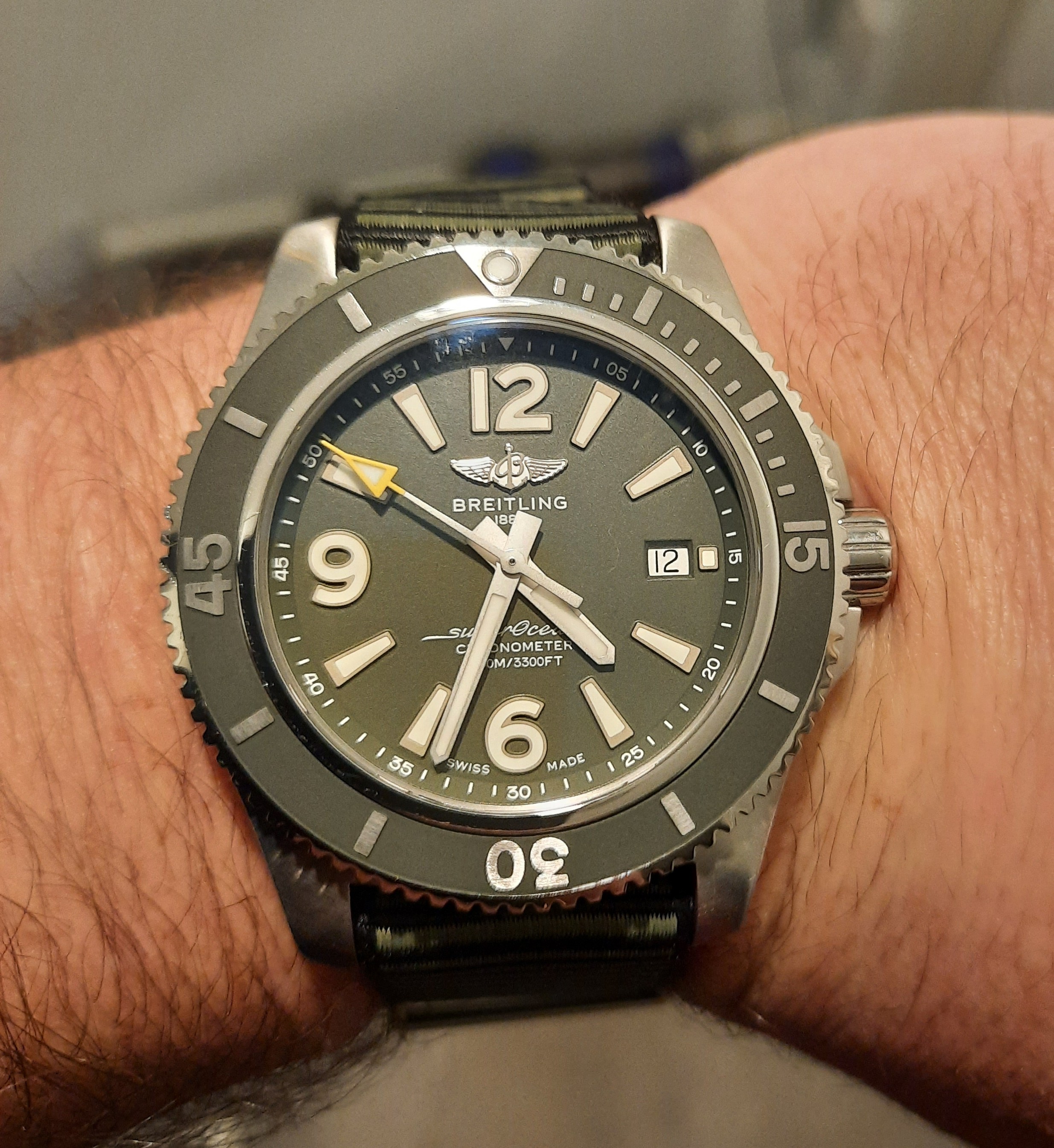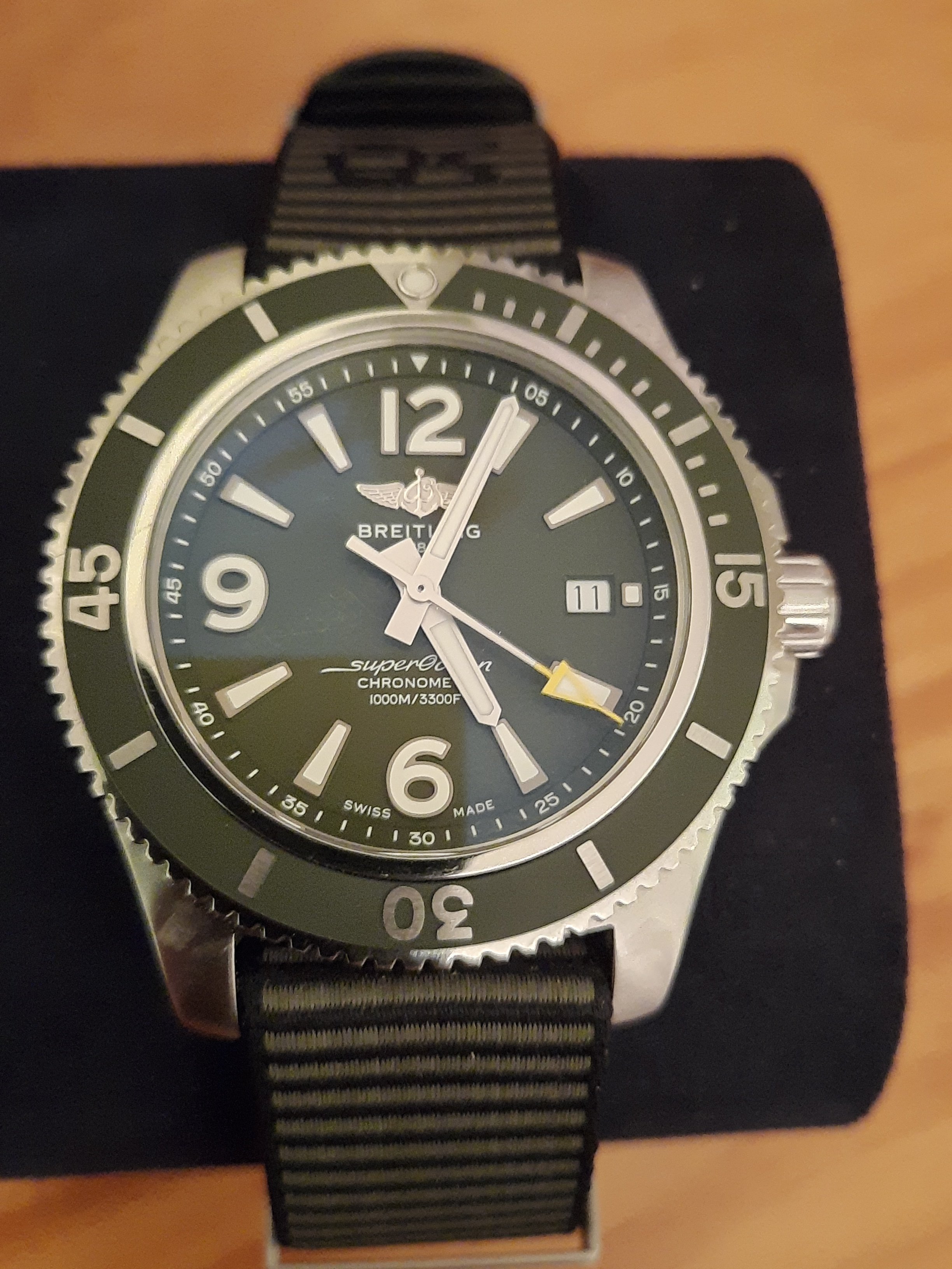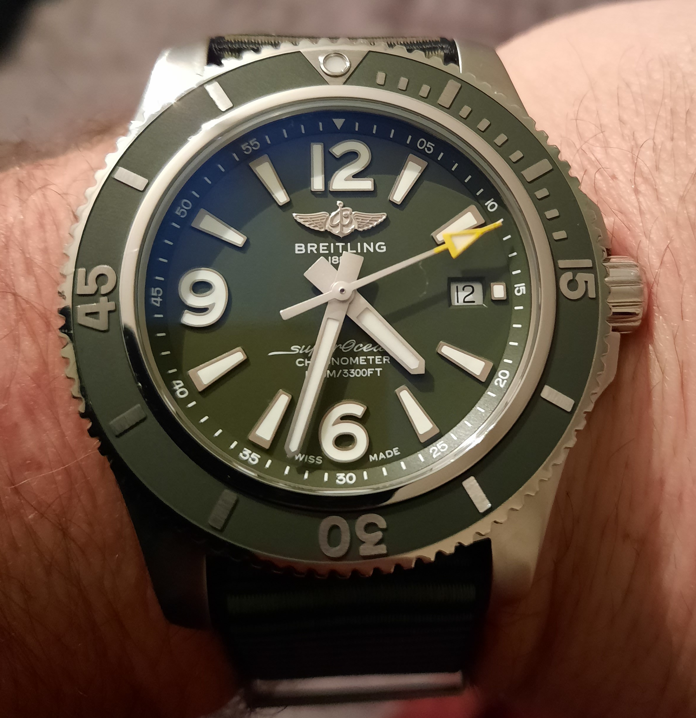 ·I thought I would treat myself to another watch. I did want a new 41mm yellow oyster perpetual but after I realised they are like gold dust unless you pay double retail I decided that I would go for something I can actually buy. I ordered a new monaco with 02 movement but they cancelled my delivery a few times so decided on this breitling as I really liked the colour and although 44mm is bigger than I normally wear I ordered one as obviously cant try on in the shop. It arrived the other day and very happy with it.