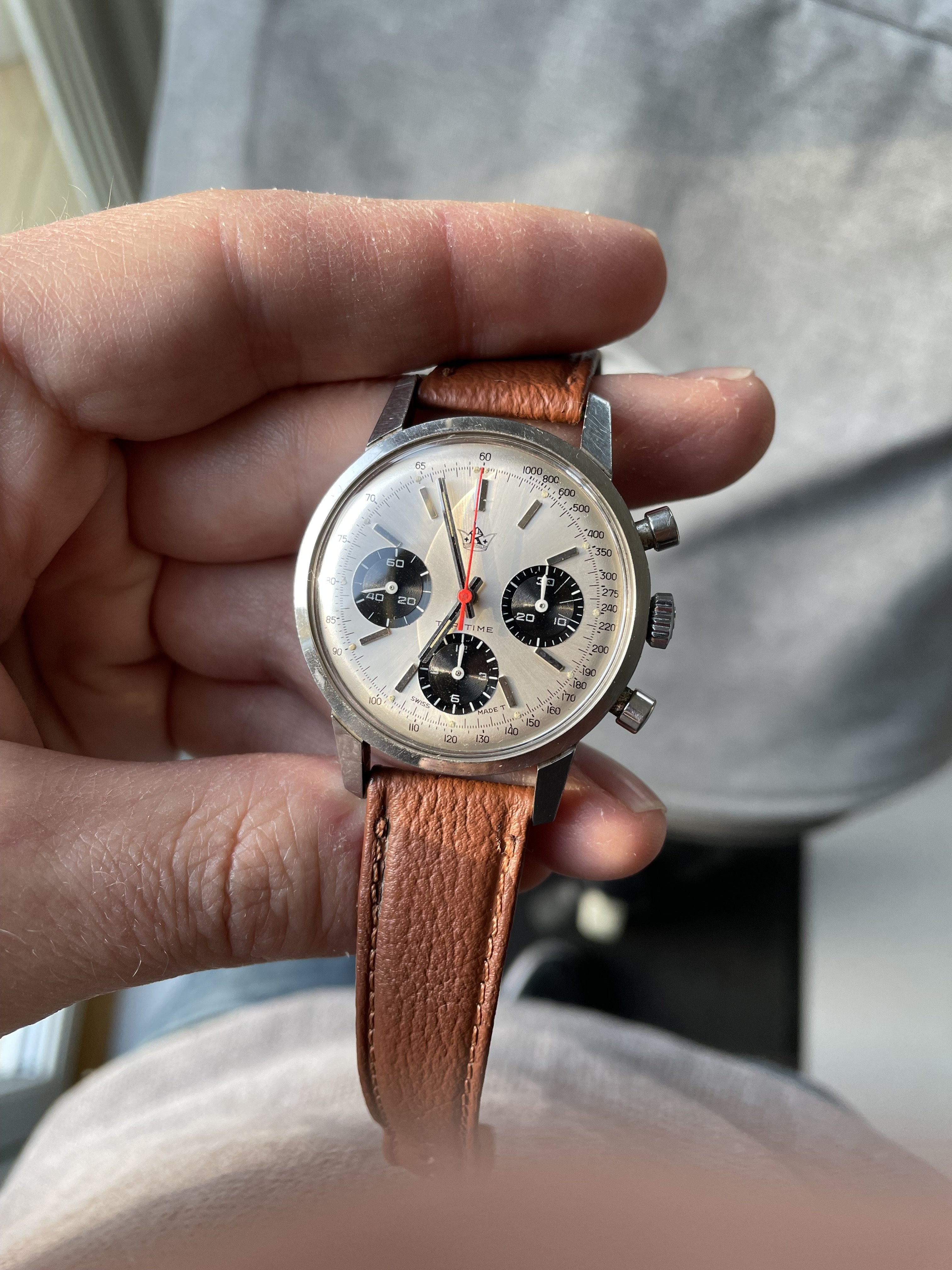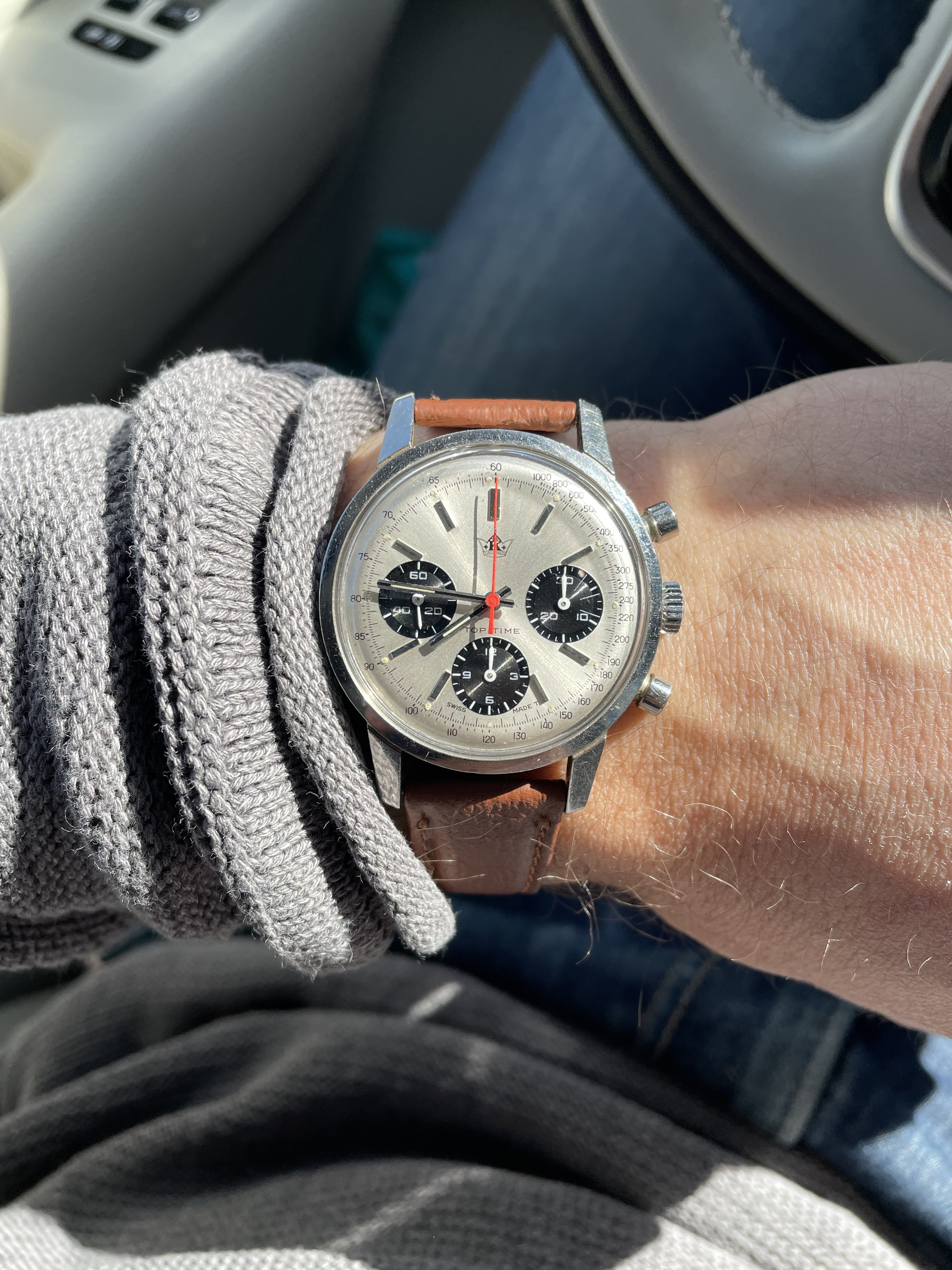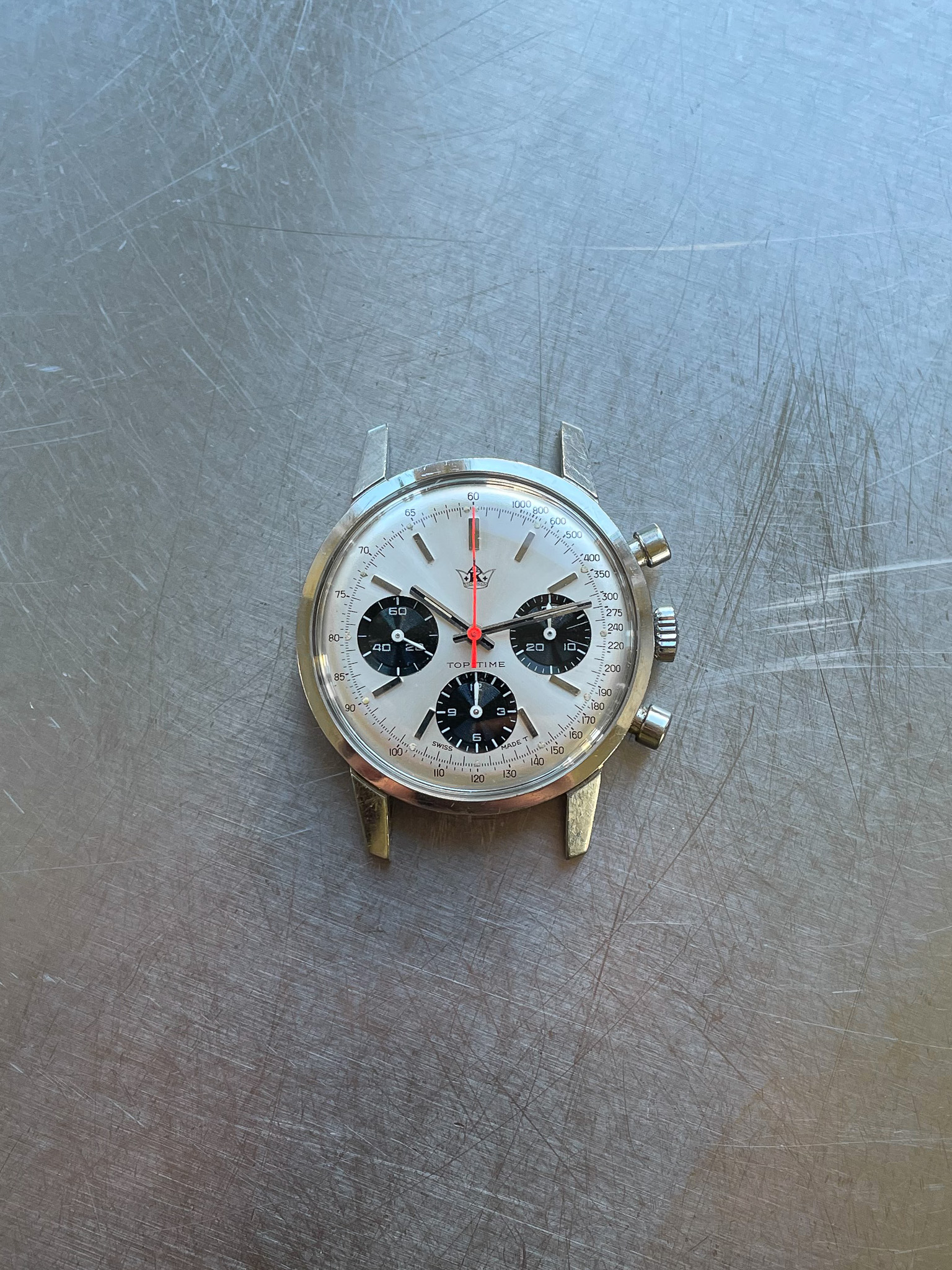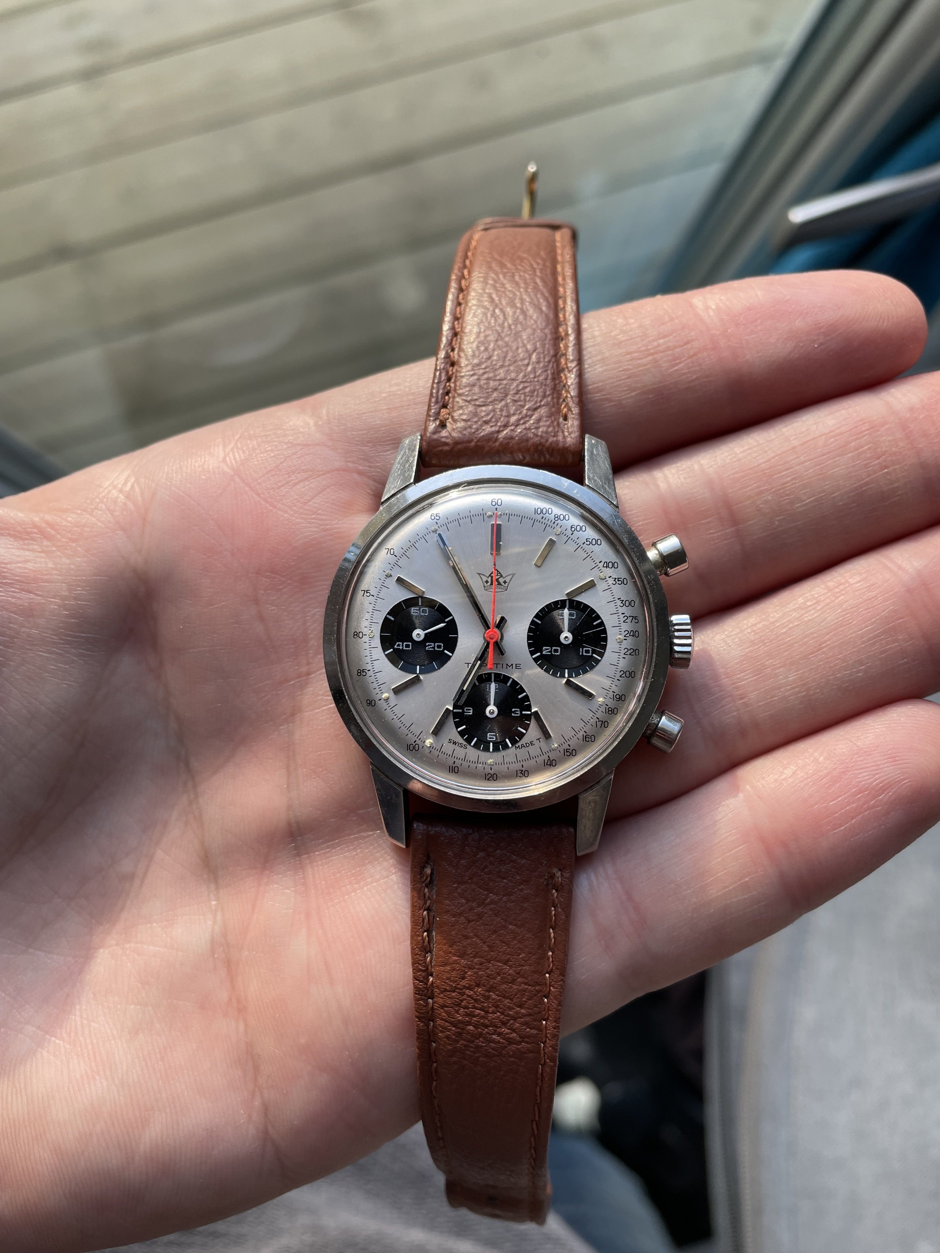 Dial: Sunburst silver panda dial with Kronometer Stockholm logo, original tritium lume.