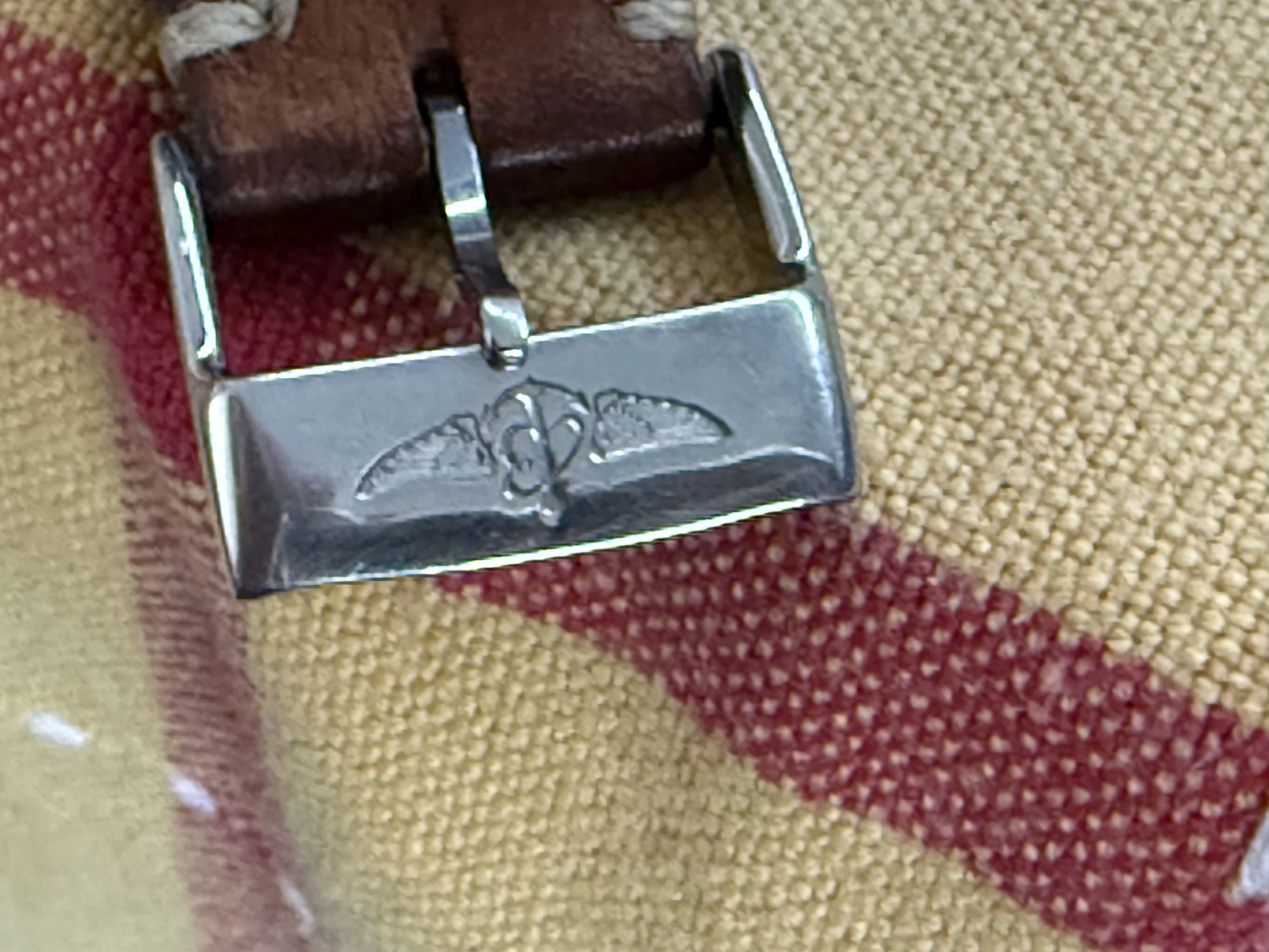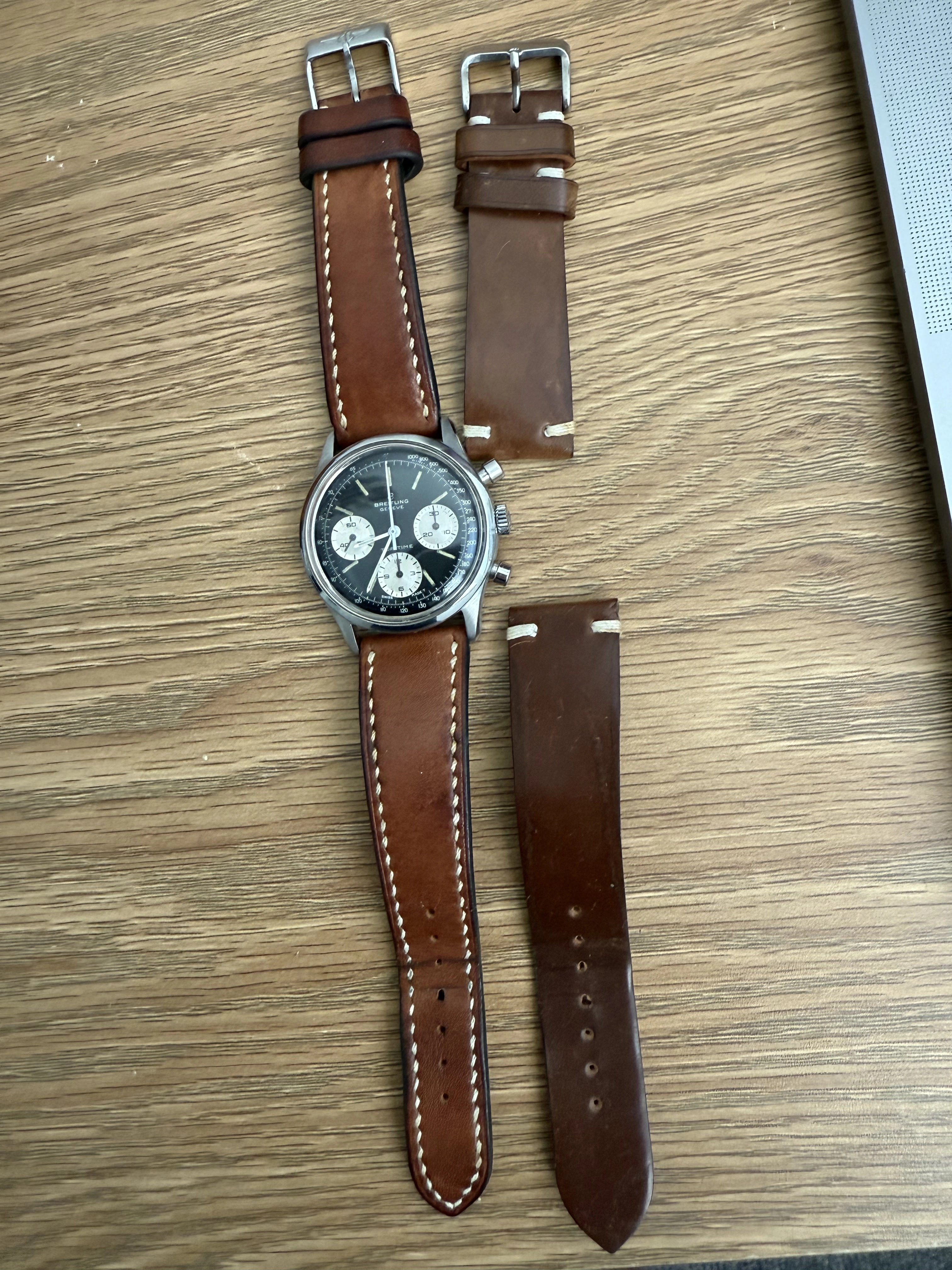 Comes with two hand made leather straps from Jones in Tokyo. Both 21mm width to fit the unusual lug size of the watch. One strap has a Breitling buckle. Not sure if this buckle is original or repro but it has a Breitling logo. Other strap buckle is generic.