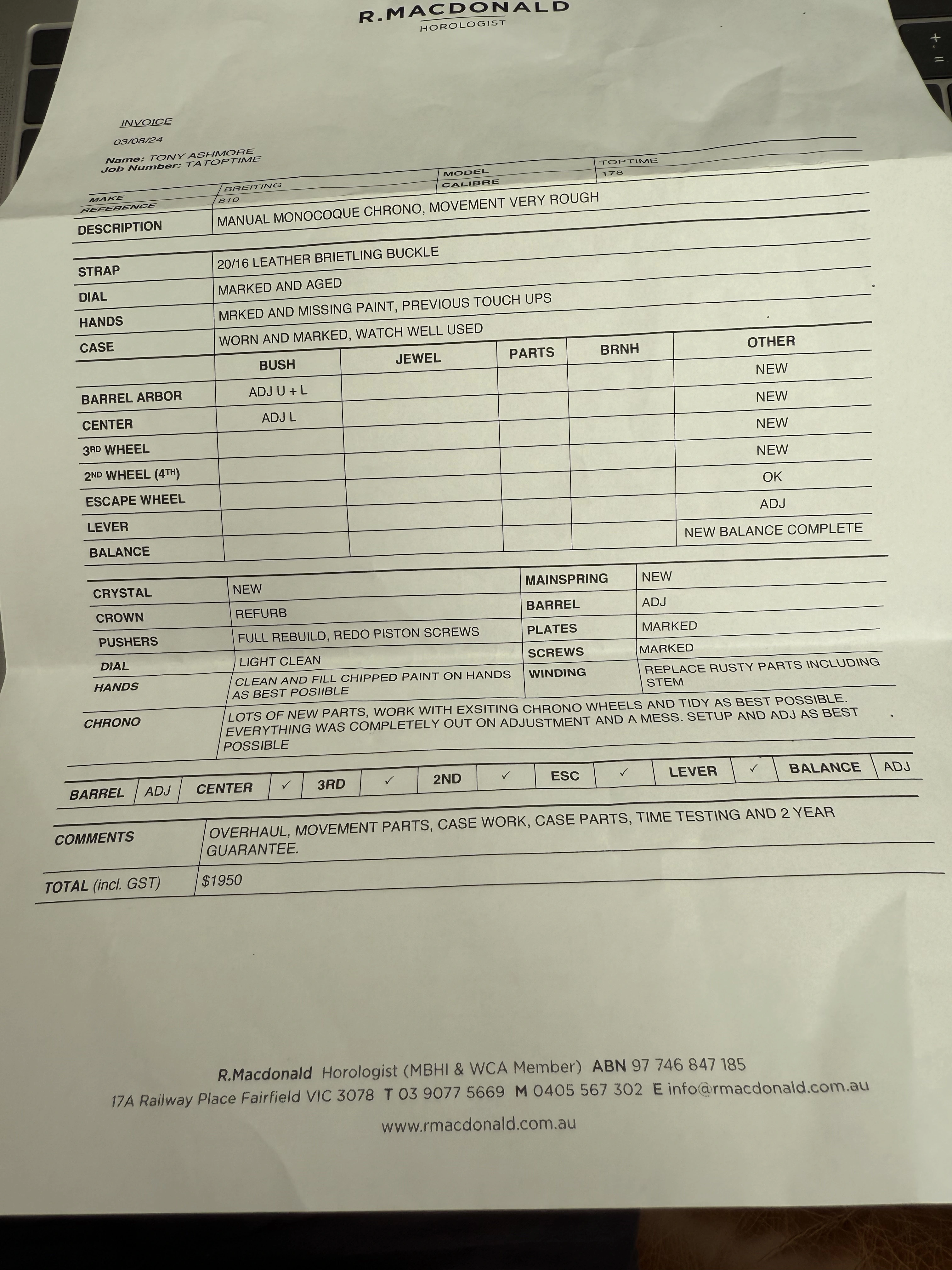 As stated watch was fully serviced in August 2024, at considerable expense. Added a copy of the service receipt in photos. I did this major service because, in all honesty, I thought I would keep the watch but also because I thought it deserved to have some TLC to keep it alive for future generations. The service receipt with balance of warranty will be included in the sale.
