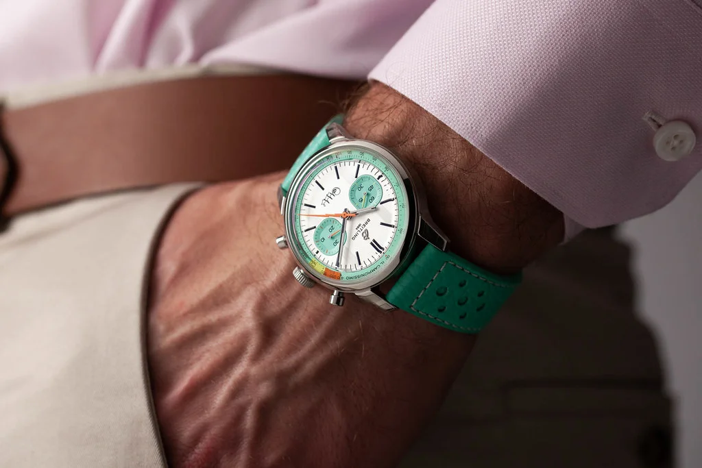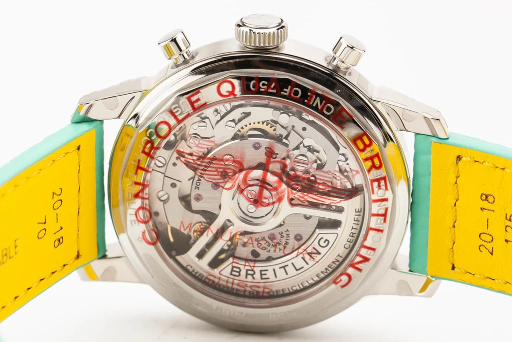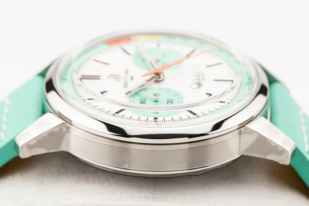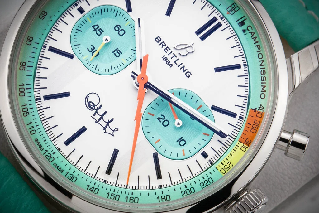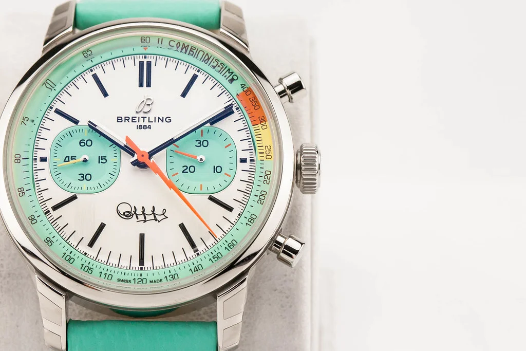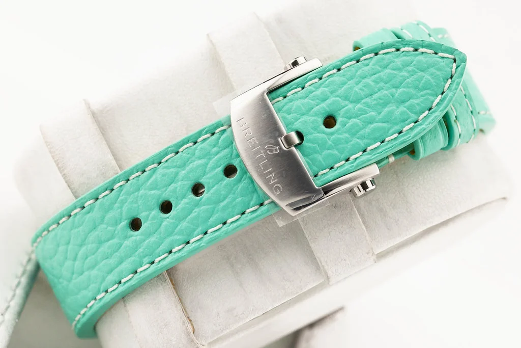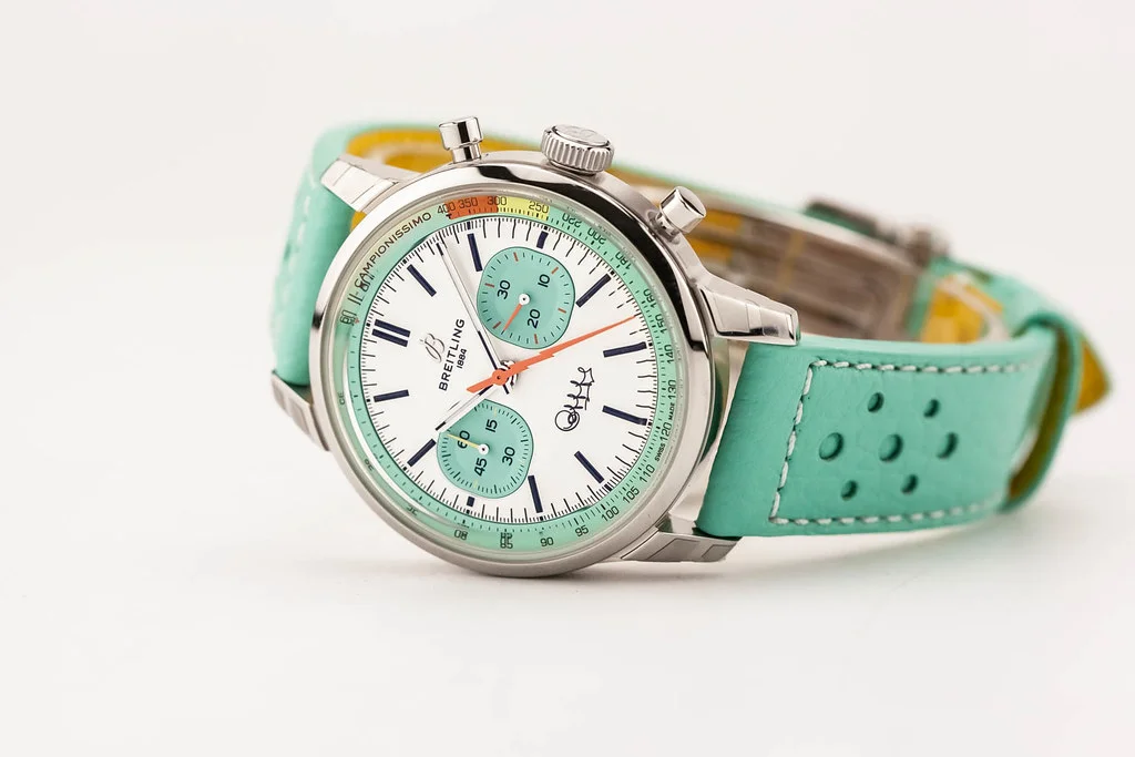 ·Up for sale is an unworn condition Breitling Top Time B01 Fausto Coppi 41mm White Dial on Turquoise Leather Strap, reference # AB01768A1A1X1. It comes complete with all boxes, papers, booklet, hang tag and Breitling Warranty Card dated July 2025. One of 750 pieces.