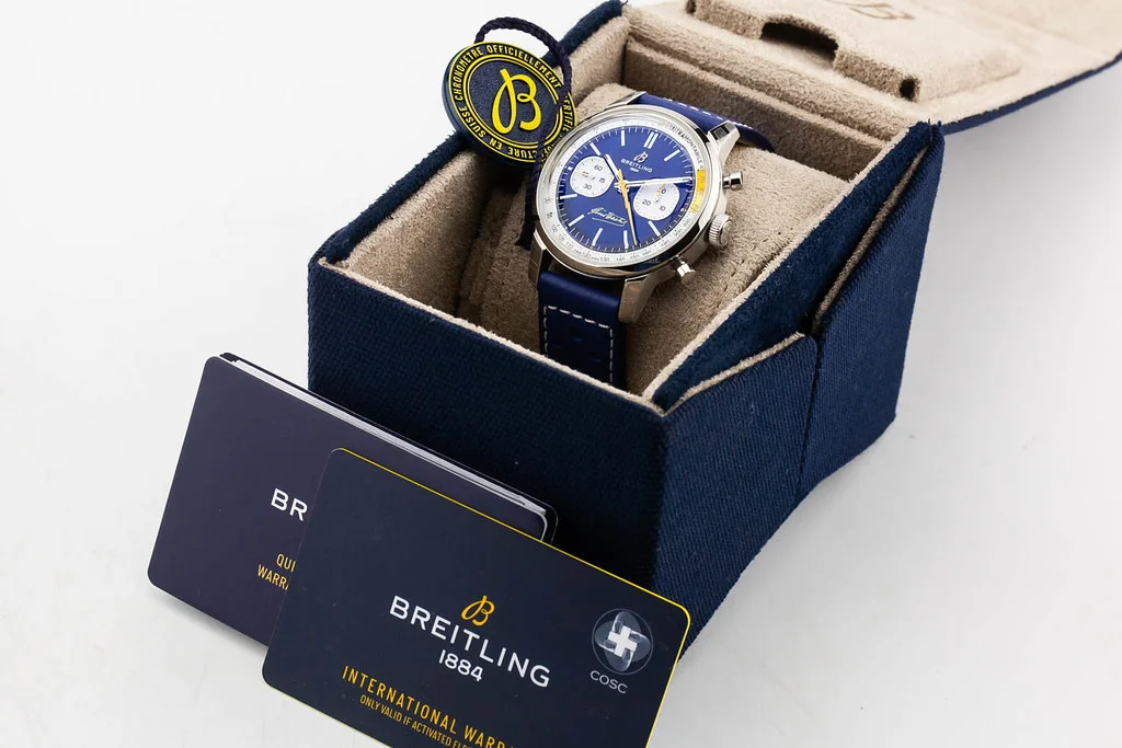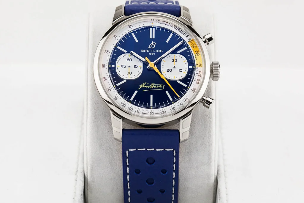 ·Up for sale is an unworn condition Breitling Top Time B01 Gino Bartali 41mm Blue Dial on Leather Strap, reference # AB01767A1C1X1. It comes complete with all boxes, papers, booklet, hang tag and Breitling Warranty Card dated May 2025. One of 750 pieces.