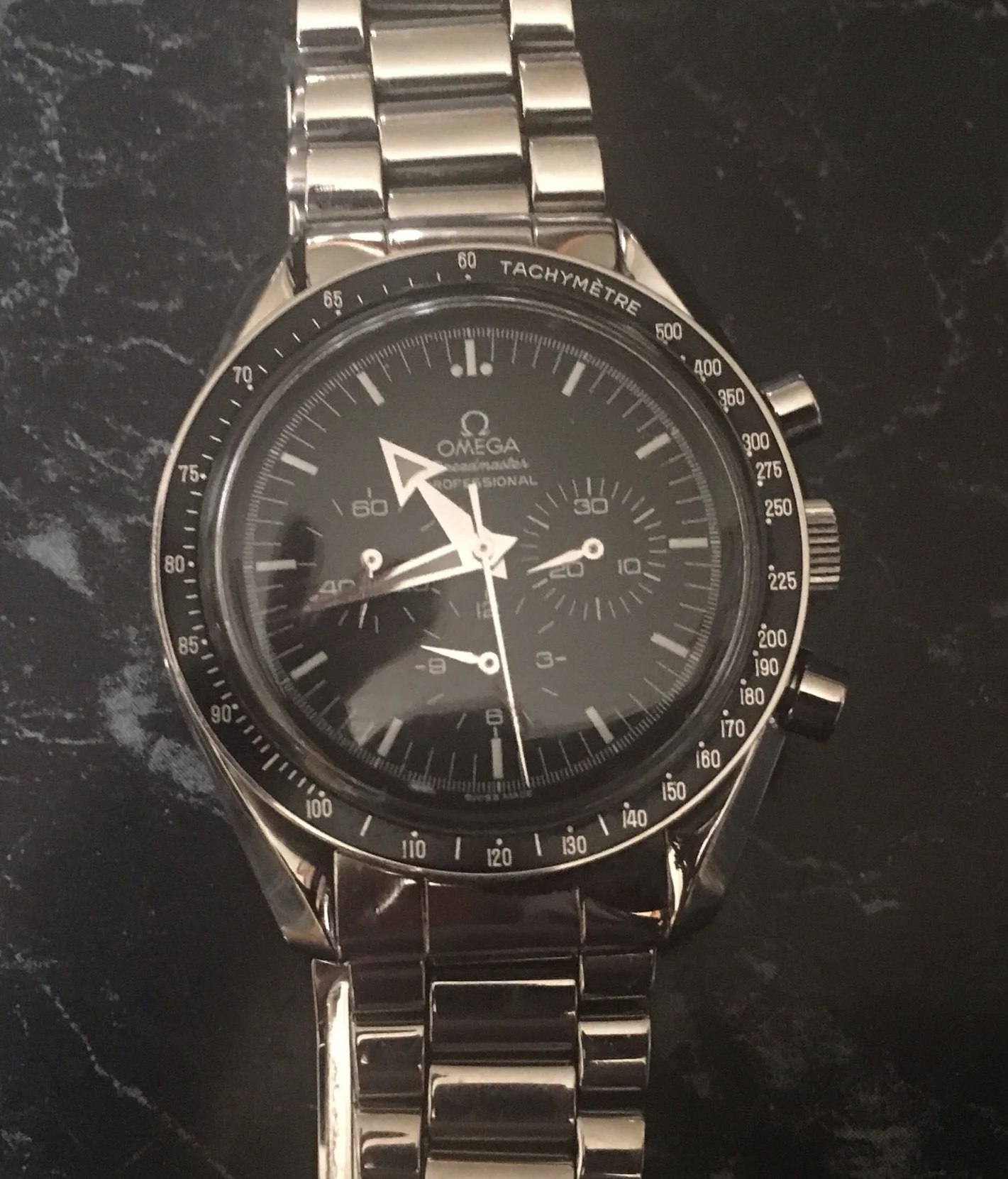 ·A friend has sent me a photo of a Speedmaster that he bought at a second hand store. My knowledge of Speedmasters is severely limited, but I have never seen that combination of hands, dial and bezel before. Is it just my limited knowledge or has a baton handset been replaced by broad arrow (assuming the dial, bezel and case are correct)? Unfortunately he hasn't yet come good with any more photos, so I can't show the caseback or movement. I have no idea what he paid for the watch.