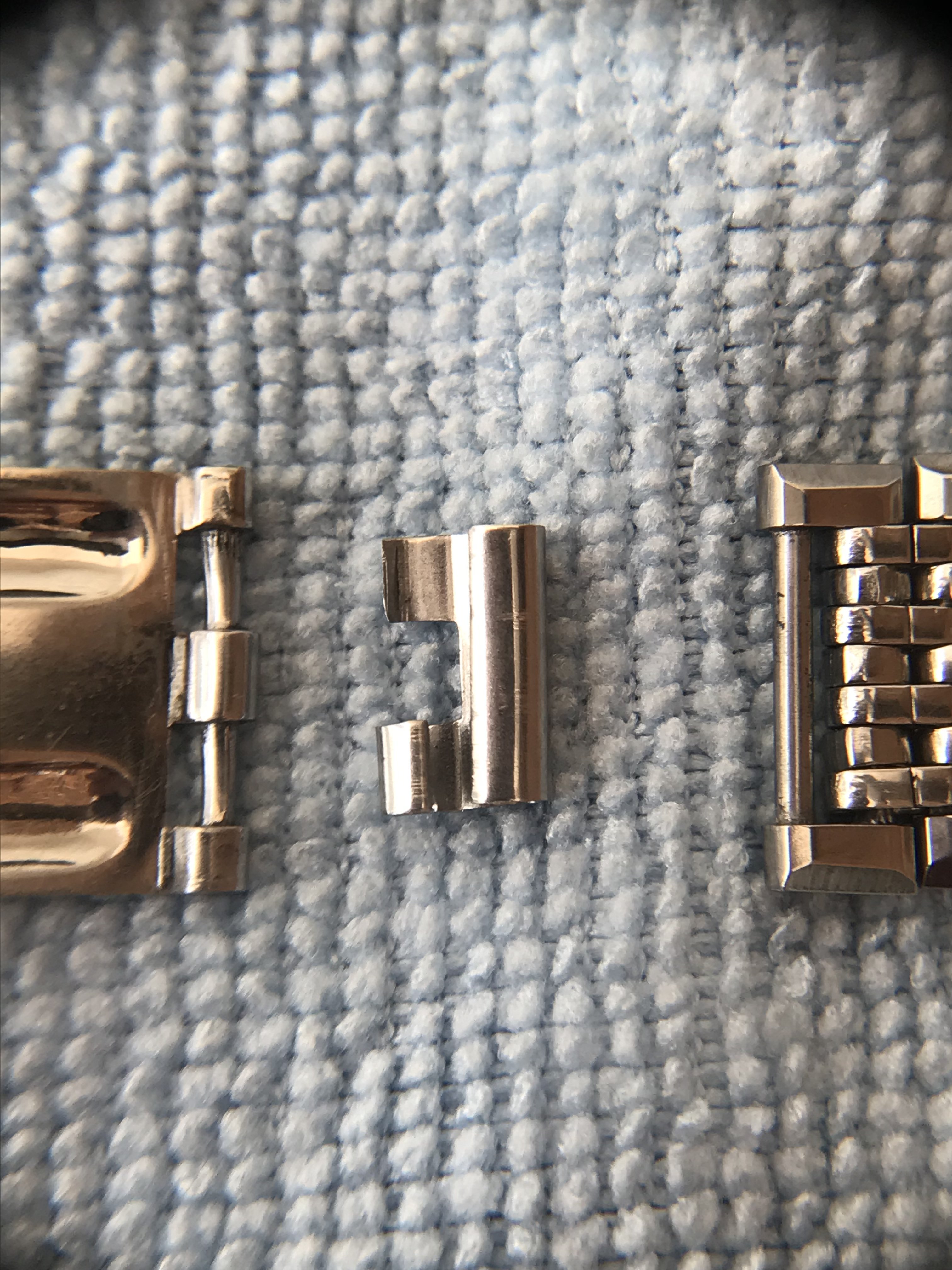 I am new to the site so apologies if I have not listed this correctly. I have my father’s old Seamaster up and running again and would like to refit the original bracelet but have found the link (in the middle of the photo) is broken on one side. Have trolled the net but am unable to find this part (not sure what you call it). Any help advice would be much appreciated.