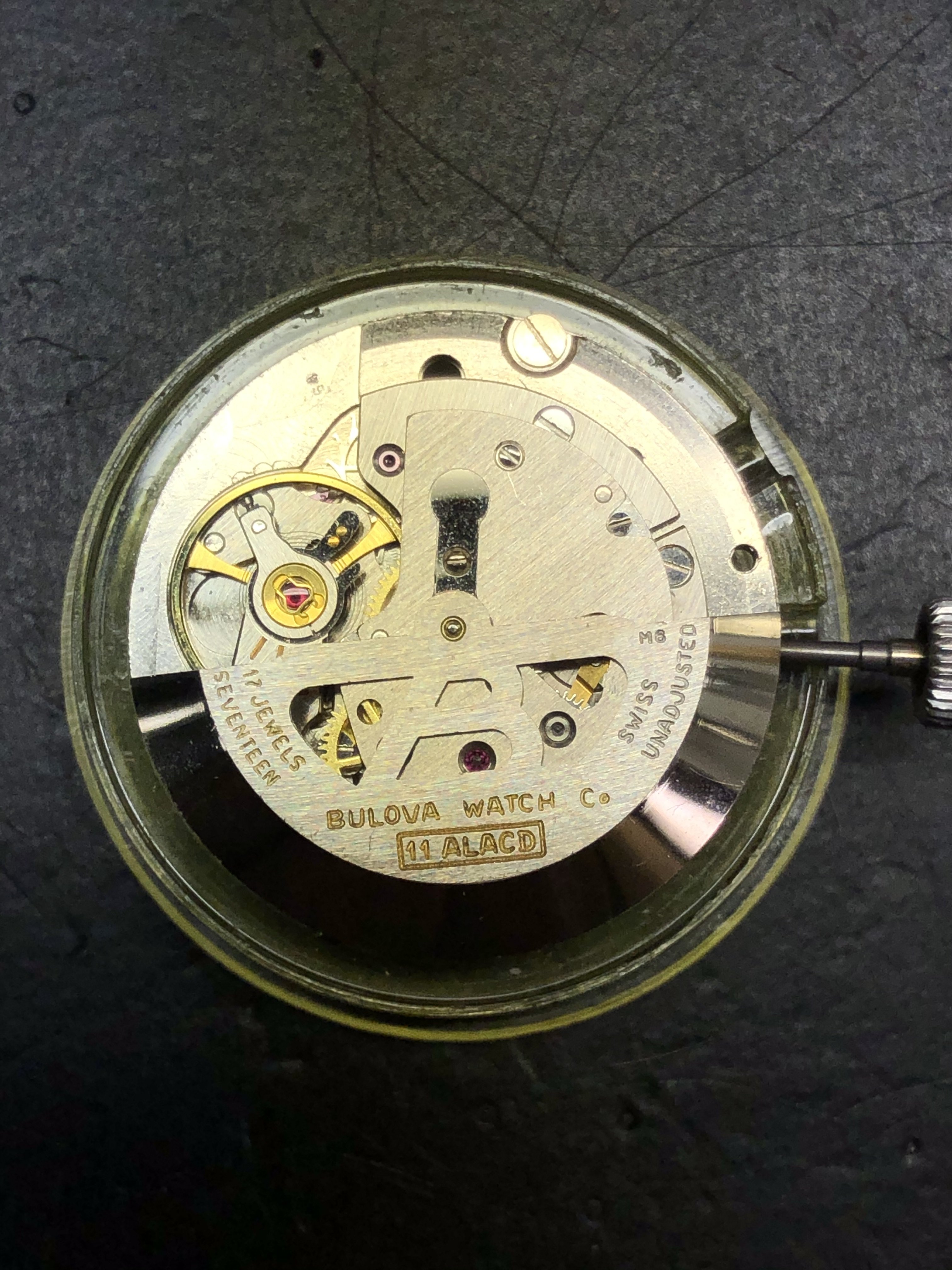 What I am trying to figure out is if the previous watchmaker used a date wheel from a different model of Bulova and just "made it work", or if he swapped an entire movement from another model and the date wheel didn't line up with the dial (hence the painted area under the date wheel to make is less noticeable through the window). I don't want to buy another 11ALACD and have the same issue. Is it possible that the date wheels on these early 386's were specific to the case reference and not the movement?