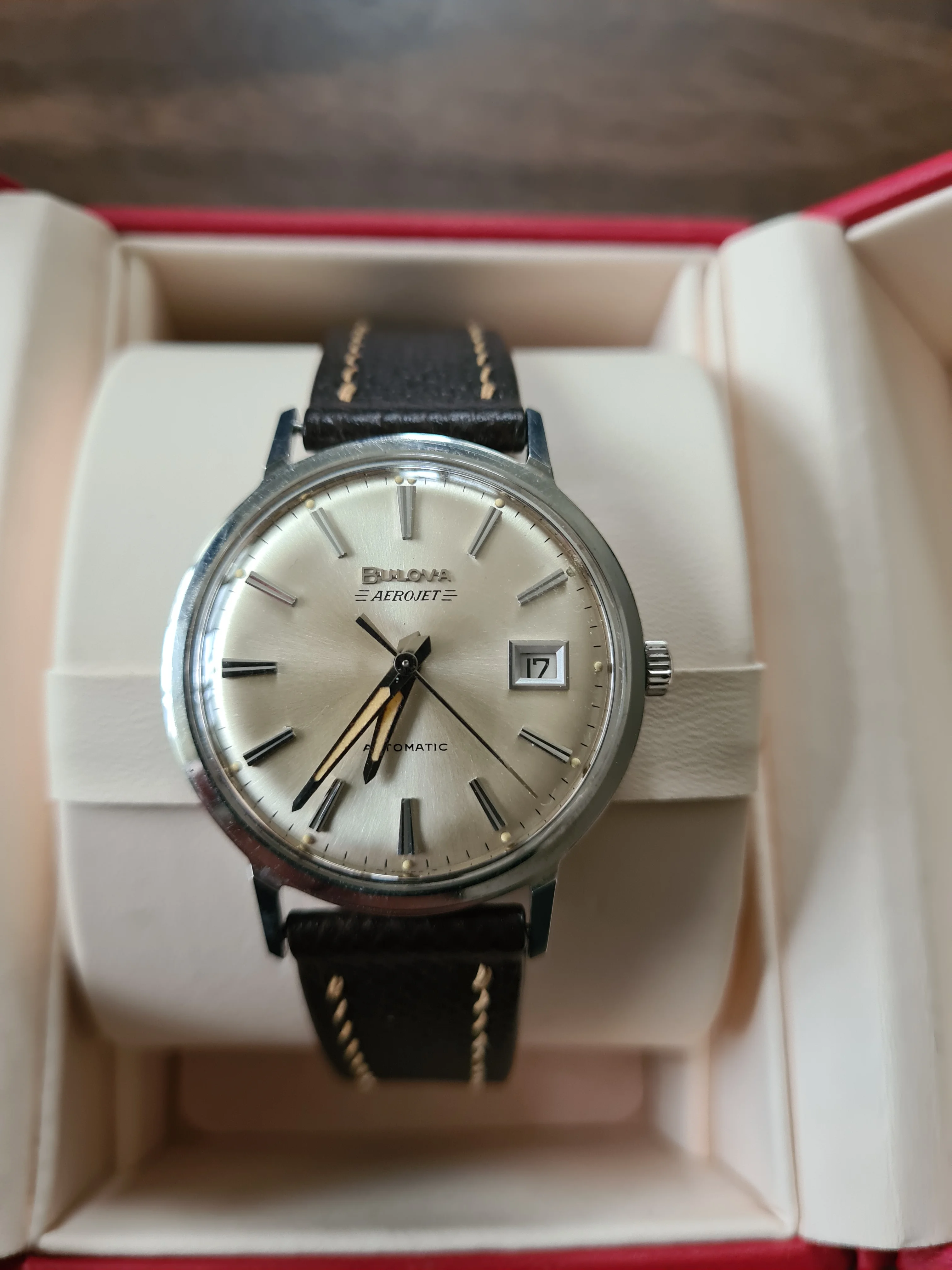 ·On offer from my personal collection absolutely fantastic example of a classic 1960s Bulova dress watch. This is very much evocative of the slim, graceful lines and art deco aesthetic of the Longines and Omegas of the same era. All steel, all original and unrevised. To my knowledge, this is the best example of an Aerojet on the market, and the most pristine one I have ever encountered.