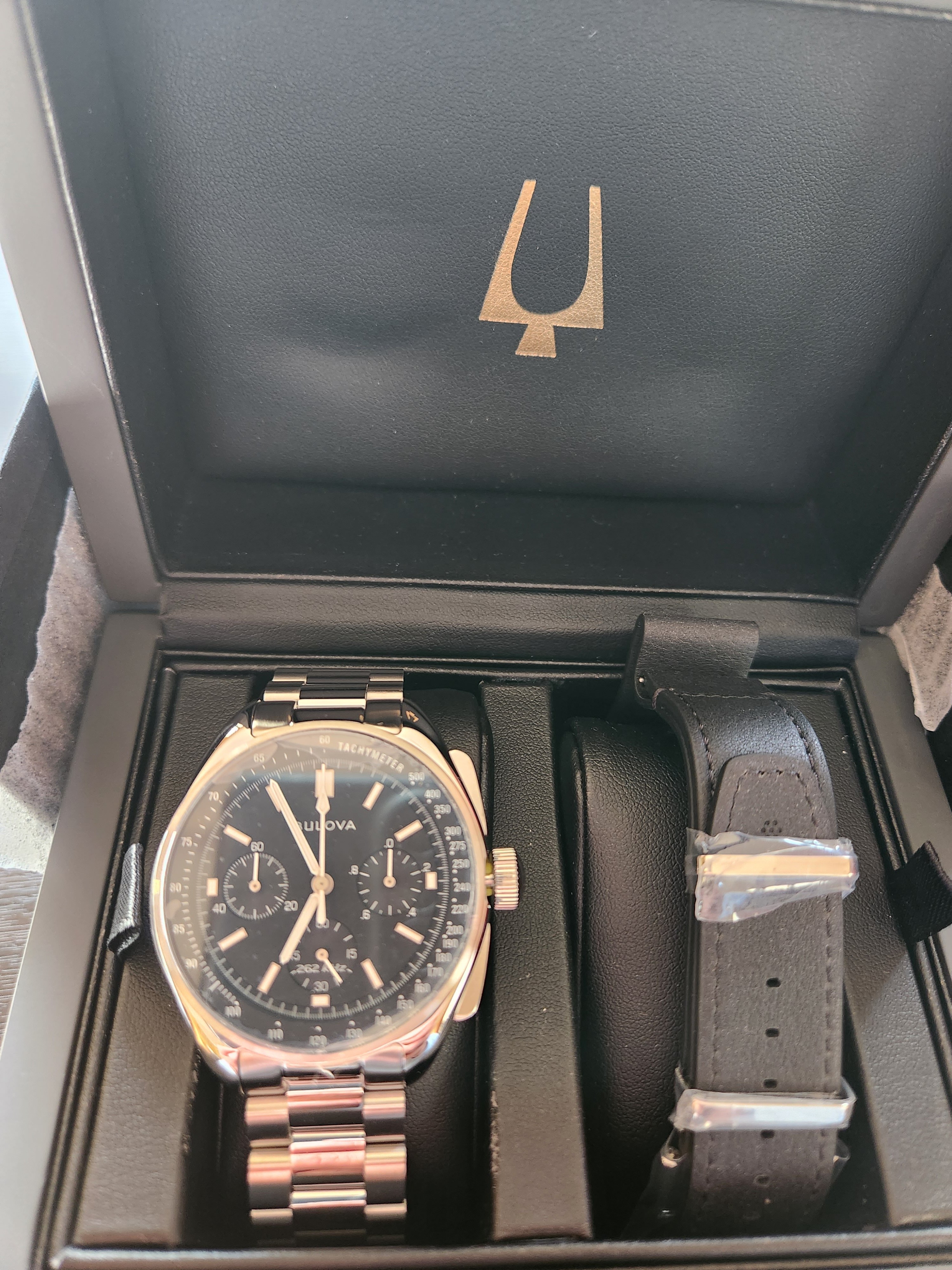 ·Black dial, reference 96K111 from Bulova's Archive series. Never been worn. Includes original box, bonus leather strap, instructions and warranty card and certificate of authenticity.