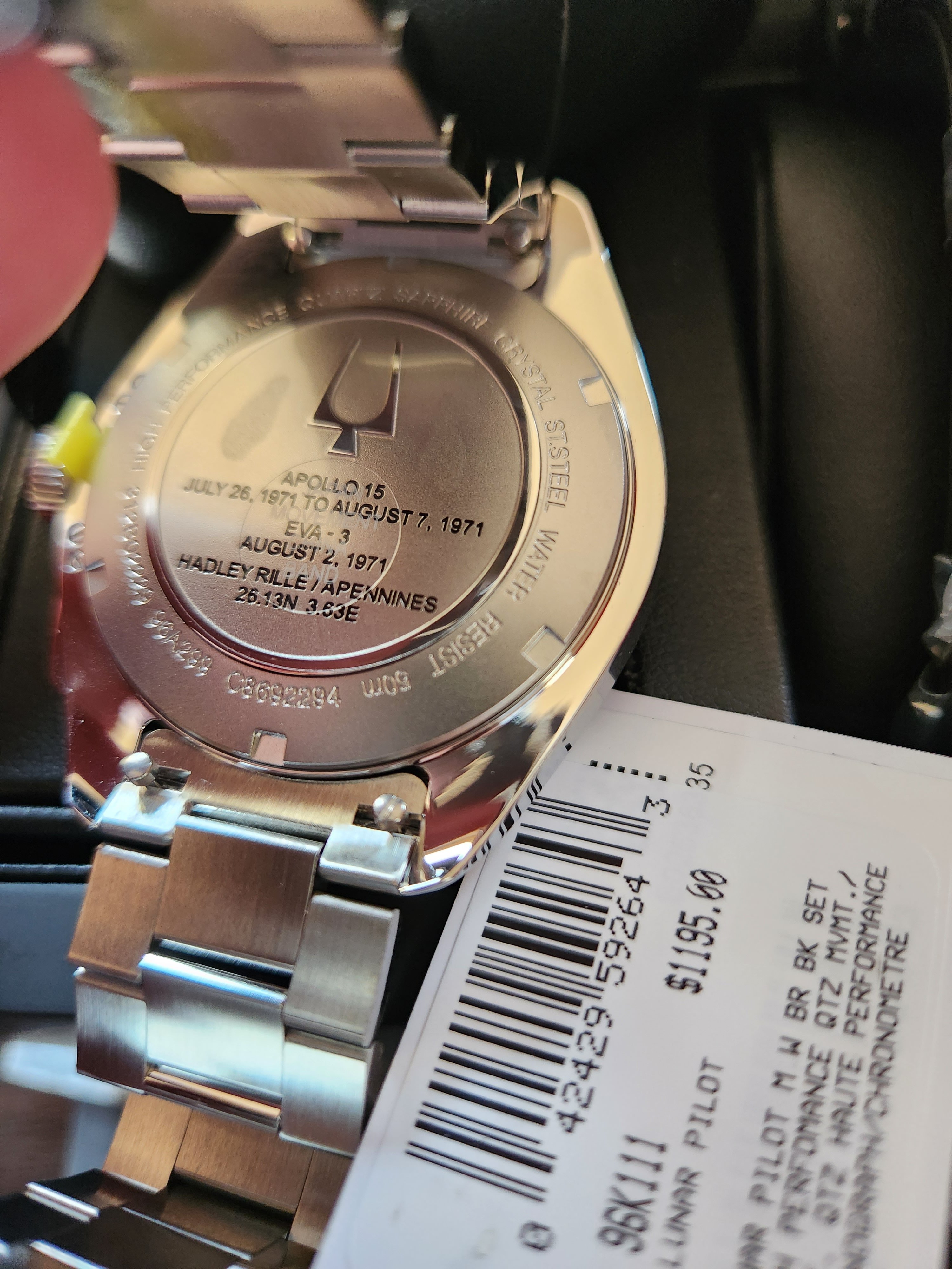 The caseback is engraved with a commemoration of the Apollo 15 mission including the dates and length of the mission, the date of the EVA3 spacewalk and the coordinates of landing spot on the Hadley Rille Gorge.