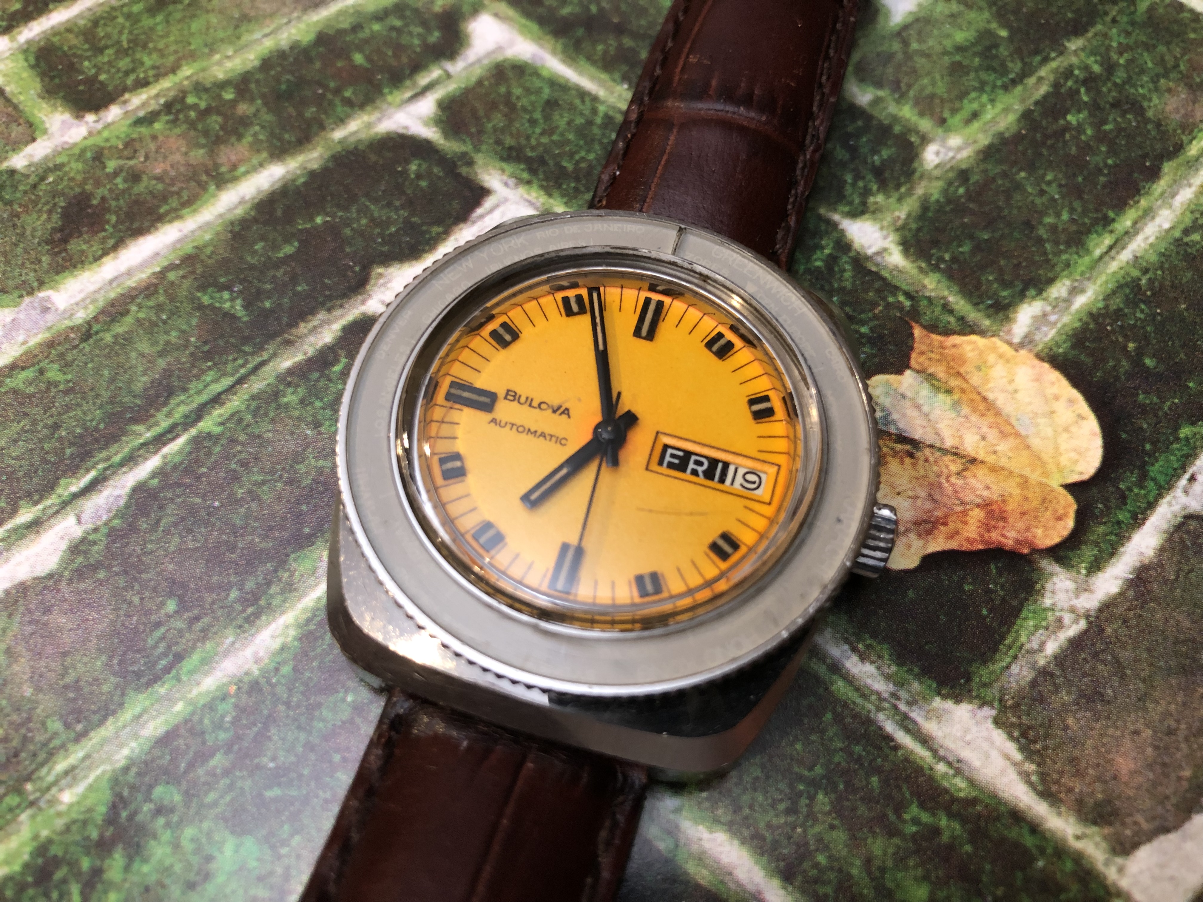 That said, he did open the case to show me the movement, which looked clean to my non-Bulova trained eyes. A minute timed against my digital chrono was perfect; I know that is hardly a few days on the timer but was somewhat reassuring. The dial looks untouched, with moderate fading to the bezel.