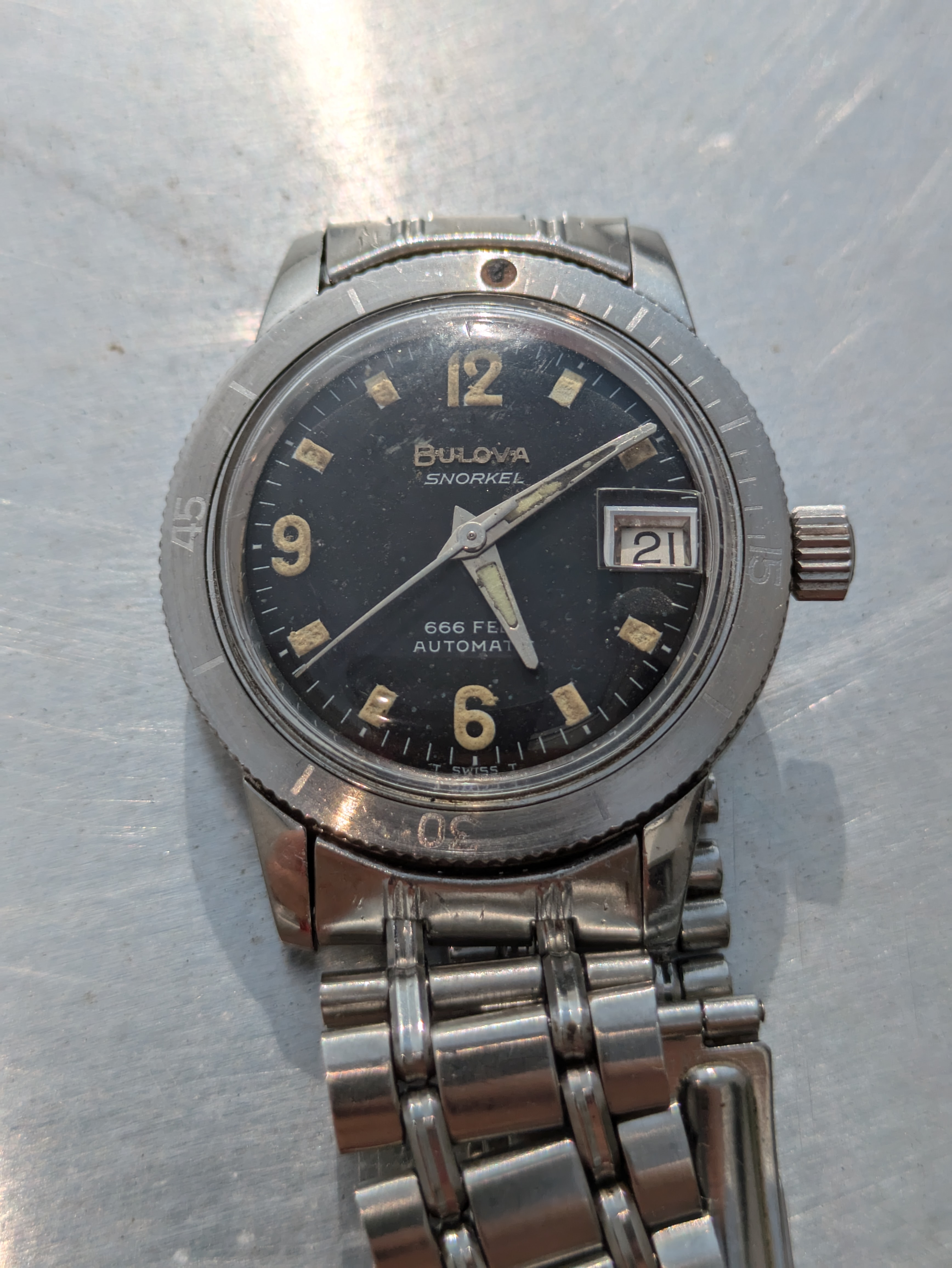 ·Found one in better condition, so this one has to go. All stainless steel screw back case, signed crown and original cyclops crystal. Bezel still rotates and clicks firmly. Nicely aged original dial with decent lume. The watch is 35mm not including the crown and 43.3-mm lug tip to lug tip.