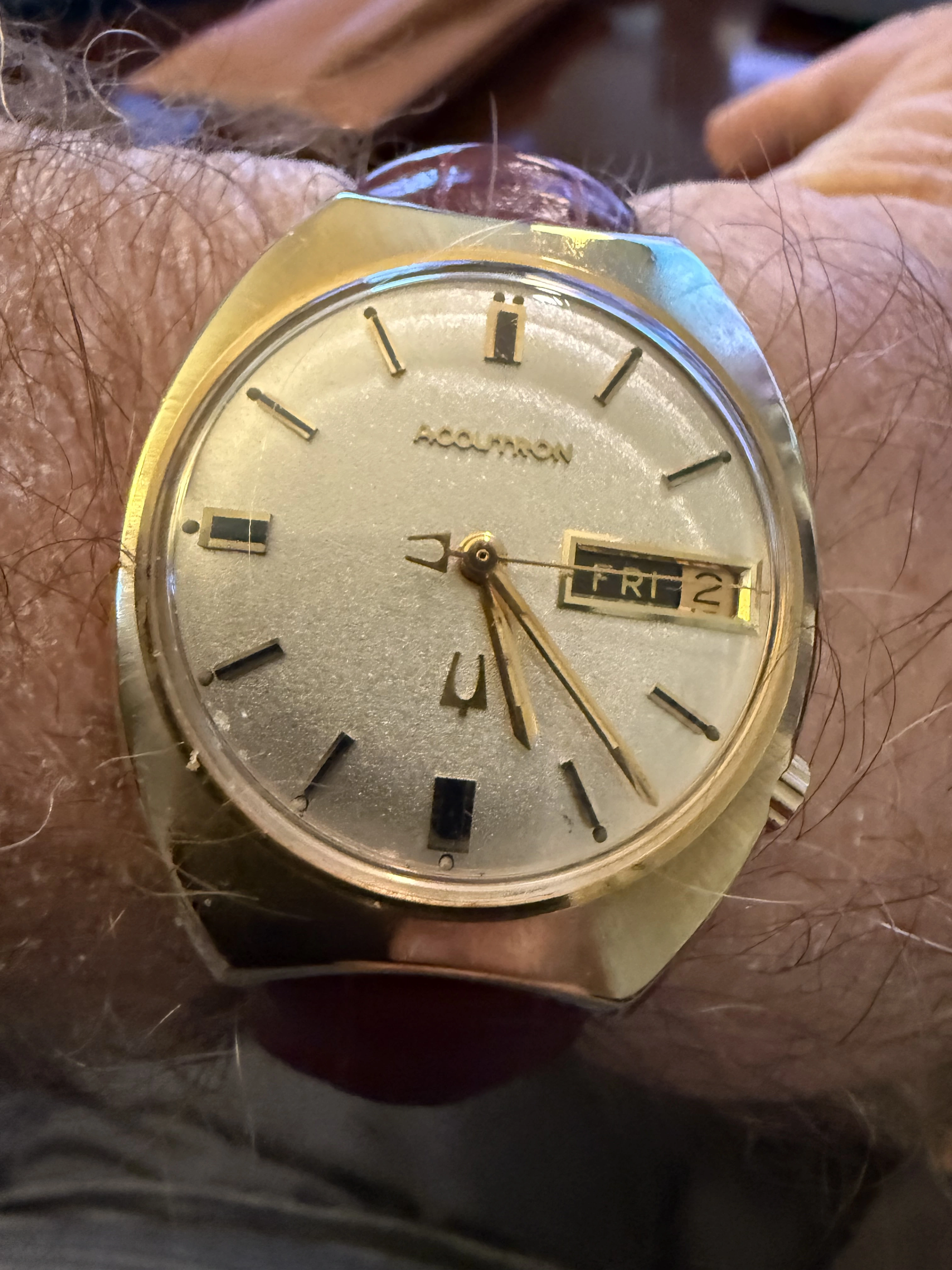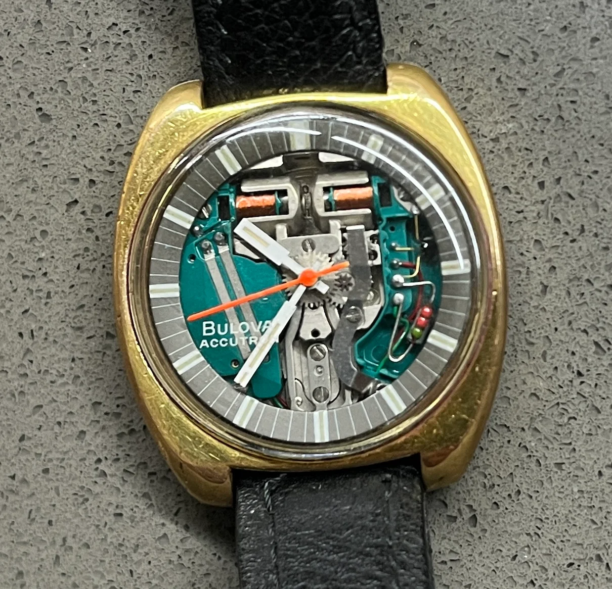 The Spaceview models can have a problem, primarily because there is no dial. If the clearance between the top of the hour wheel and the underside of the minute hand is too great, the hour wheel can lift, become disengaged with the pinion on the minute wheel, rotating a bit, re-engaging, the result being the hour hand alignment is lost. If a watch has a dial, a dial washer can be placed over the hour wheel, preventing this problem by holding the hour wheel in engagement. Can’t use a dial washer on a Spaceview. This is not a difficult problem to solve, but most in this trade today are gun shy with Accutrons. Re-calibrate the hands, and make certain the minute hand is low enough to prevent the hour wheel lifting, once the hands are back on.