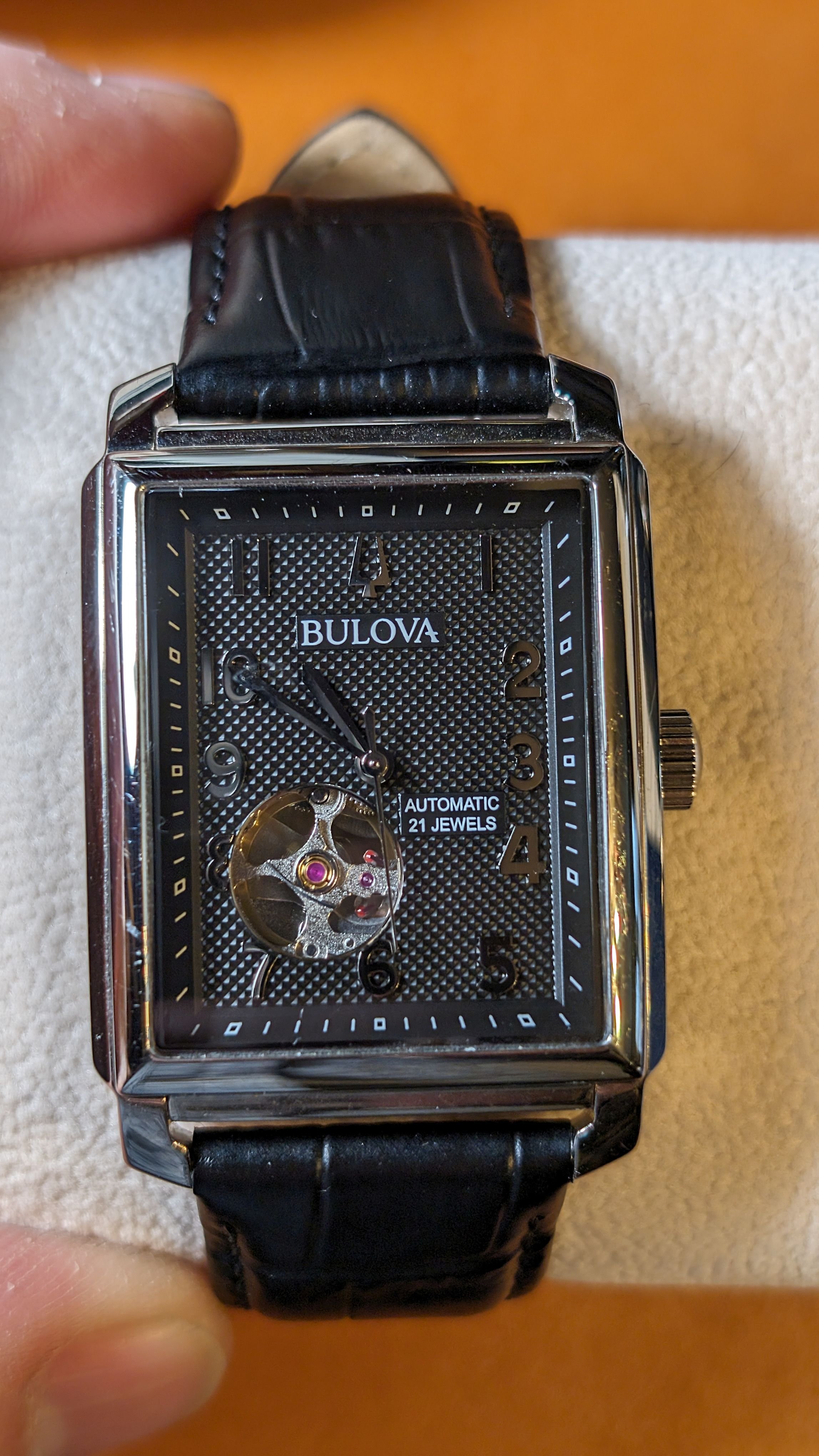 Dial: Black textured face with silver-tone accents with open aperture to view the balance wheel