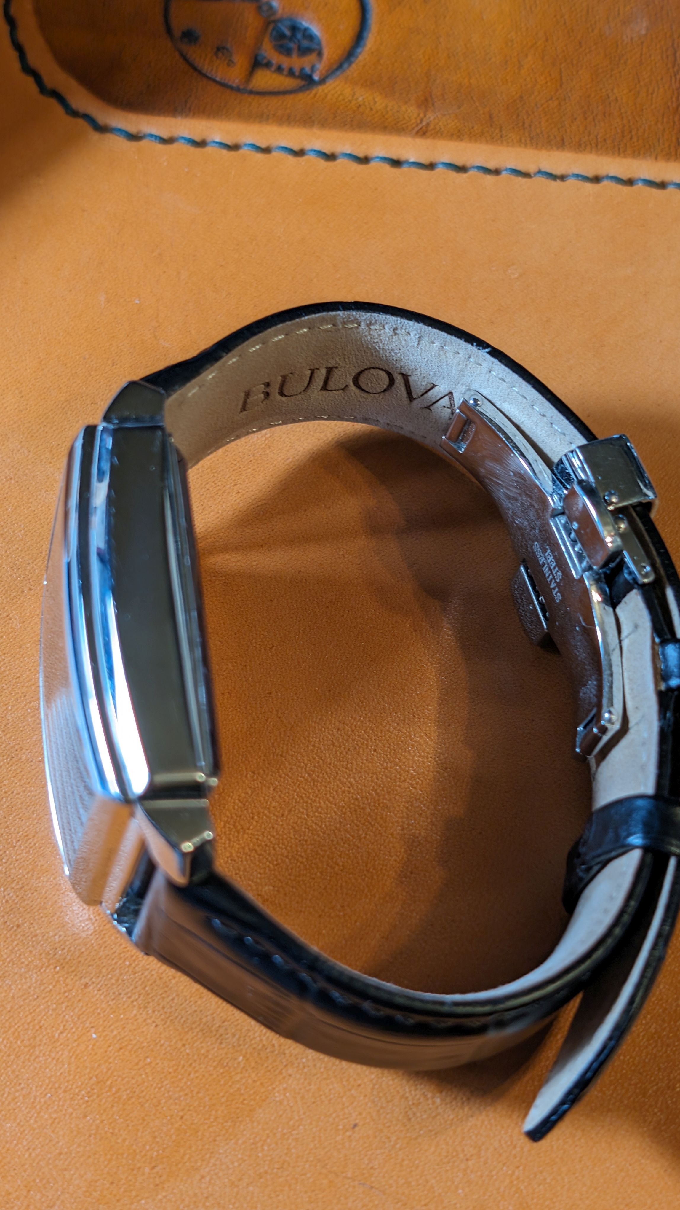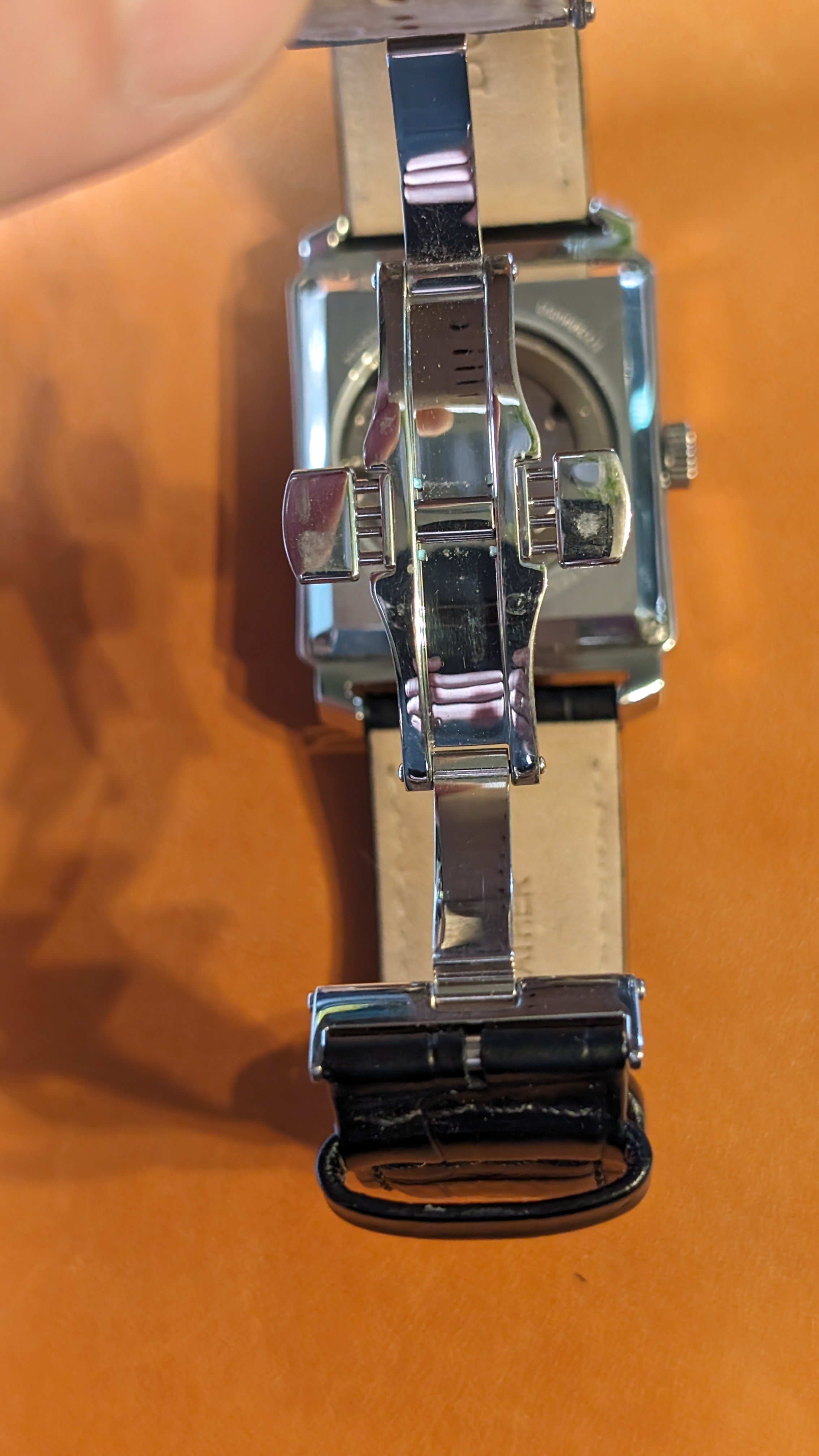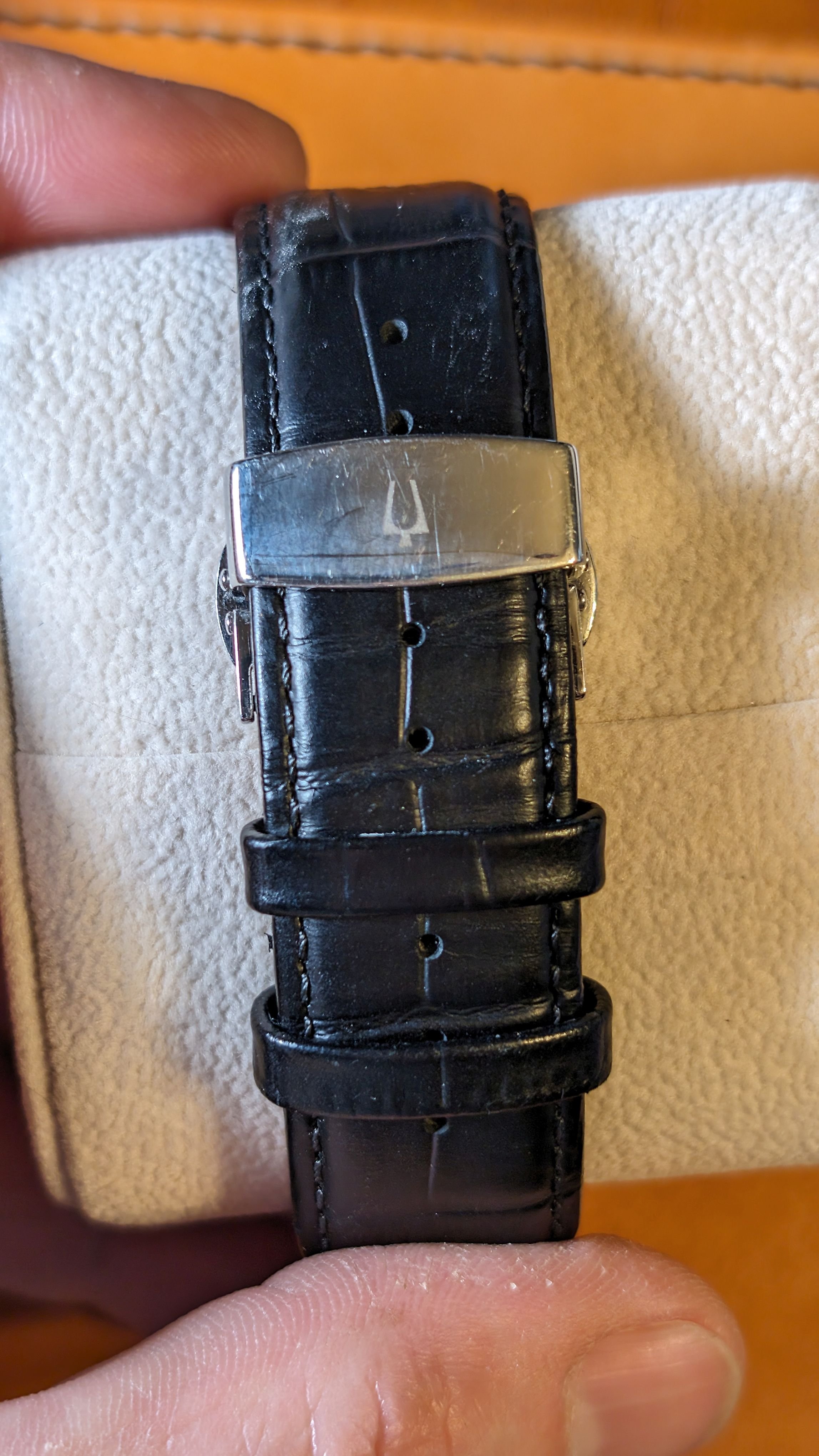 Strap: Original 22mm alligator-grain leather strap with rare, signed deployant clasp that I sourced myself (original pin buckle included)