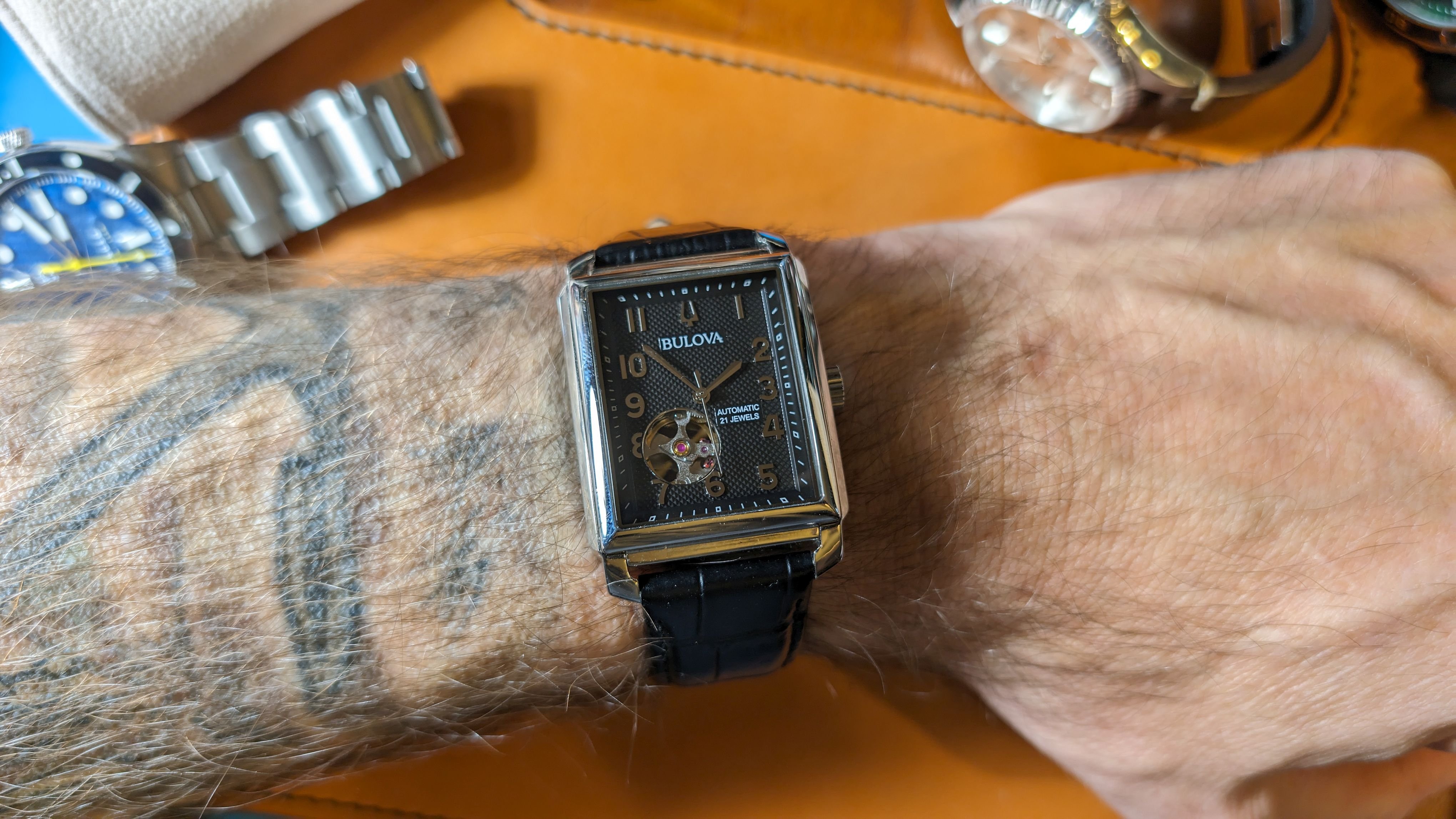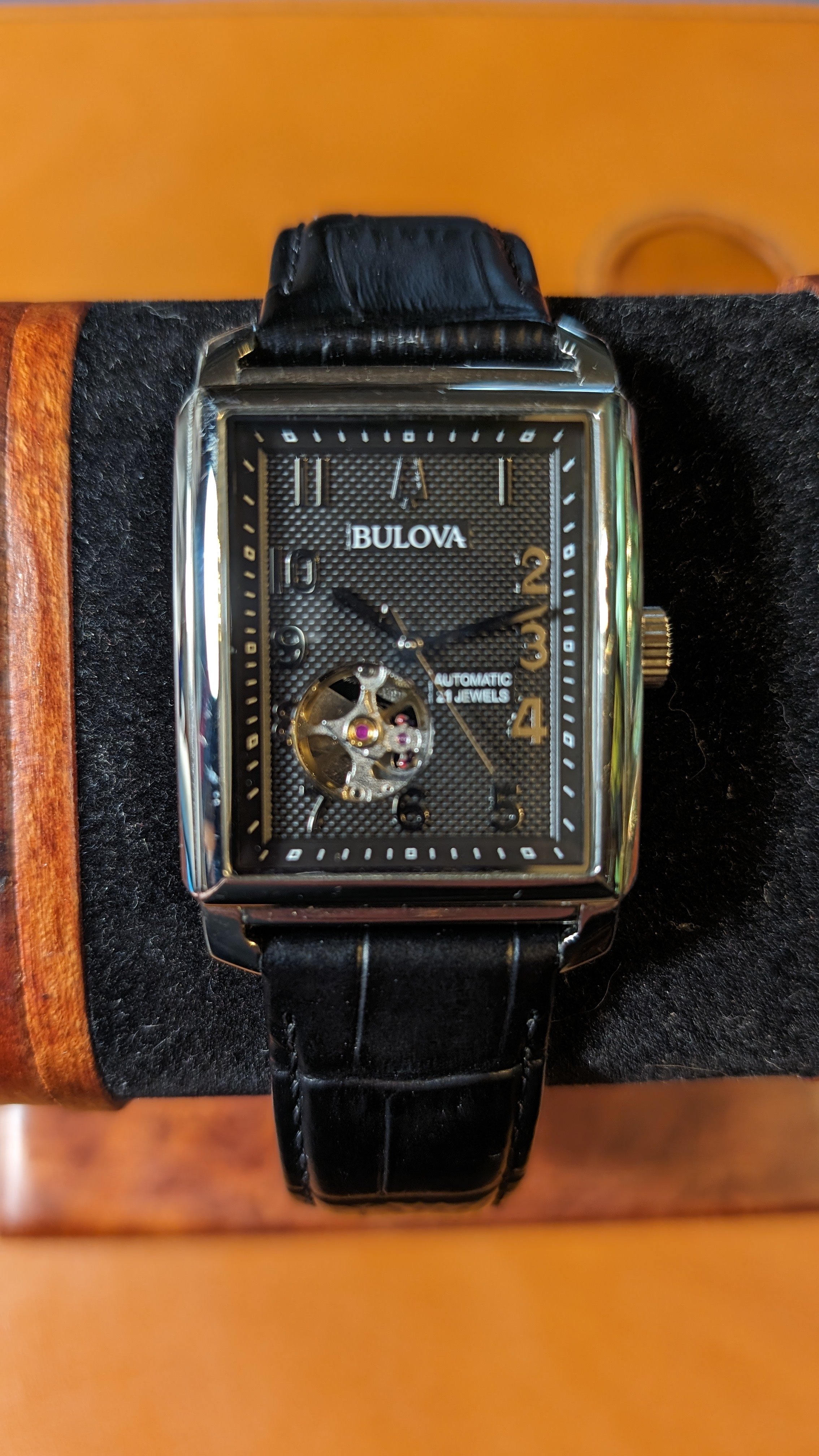 The new Sutton Automatic from Bulova introduces a fresh new shape to this classic watch. Inspired by the 1948 Presidentl style, the rectangular stainless steel case has a black textured face with silver-tone accents, with a subtle texture and an open aperture to view the balance wheel of the movement. The case back features a mineral crystal exhibition window, to showcase the automatic movement powering this luxury watch. The case is paired with a rich black alligator-grain leather strap for an elegant statement. For anyone seeking a classic timepiece with a distinct personality, this is a piece that can’t be overlooked.