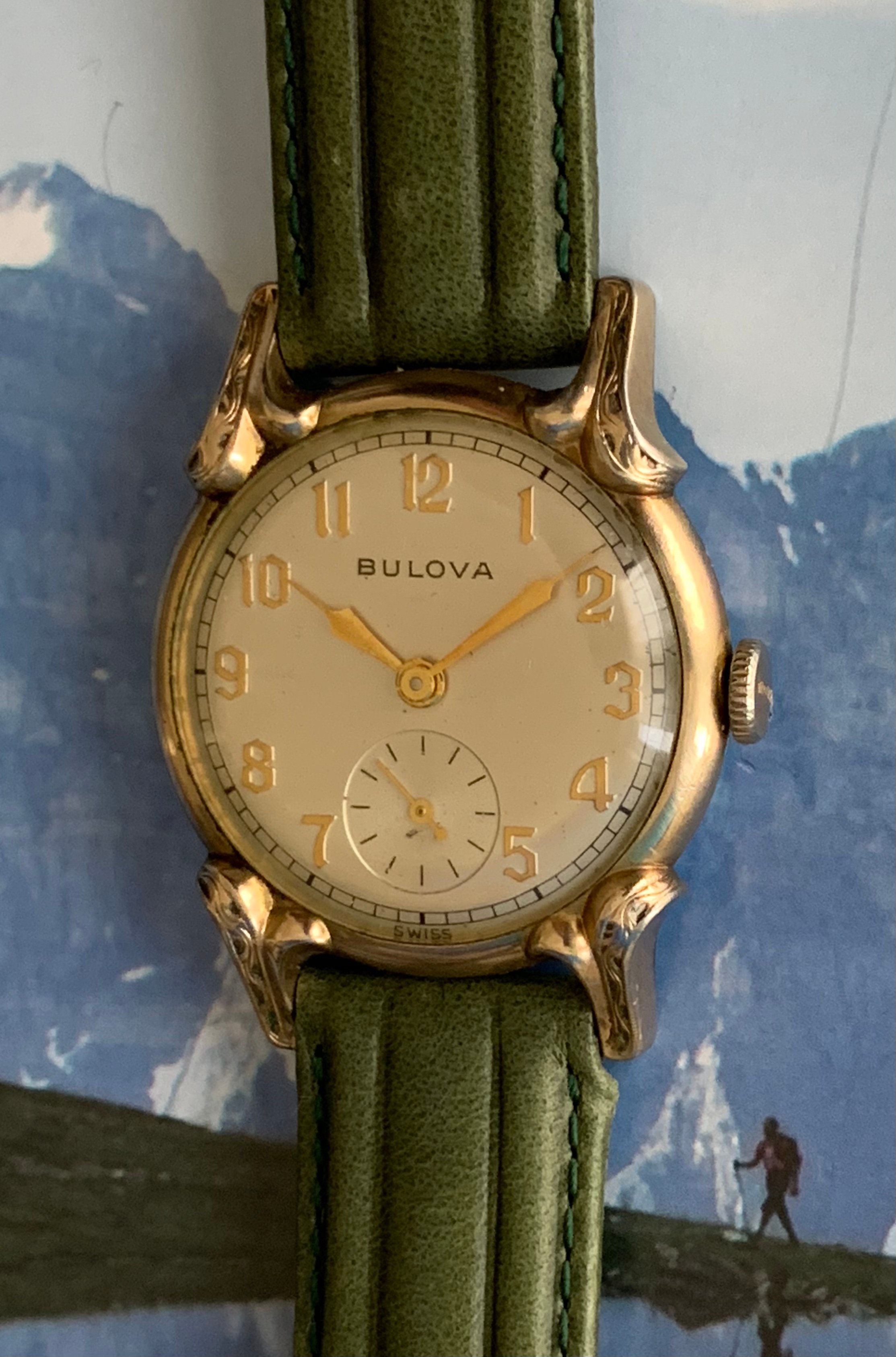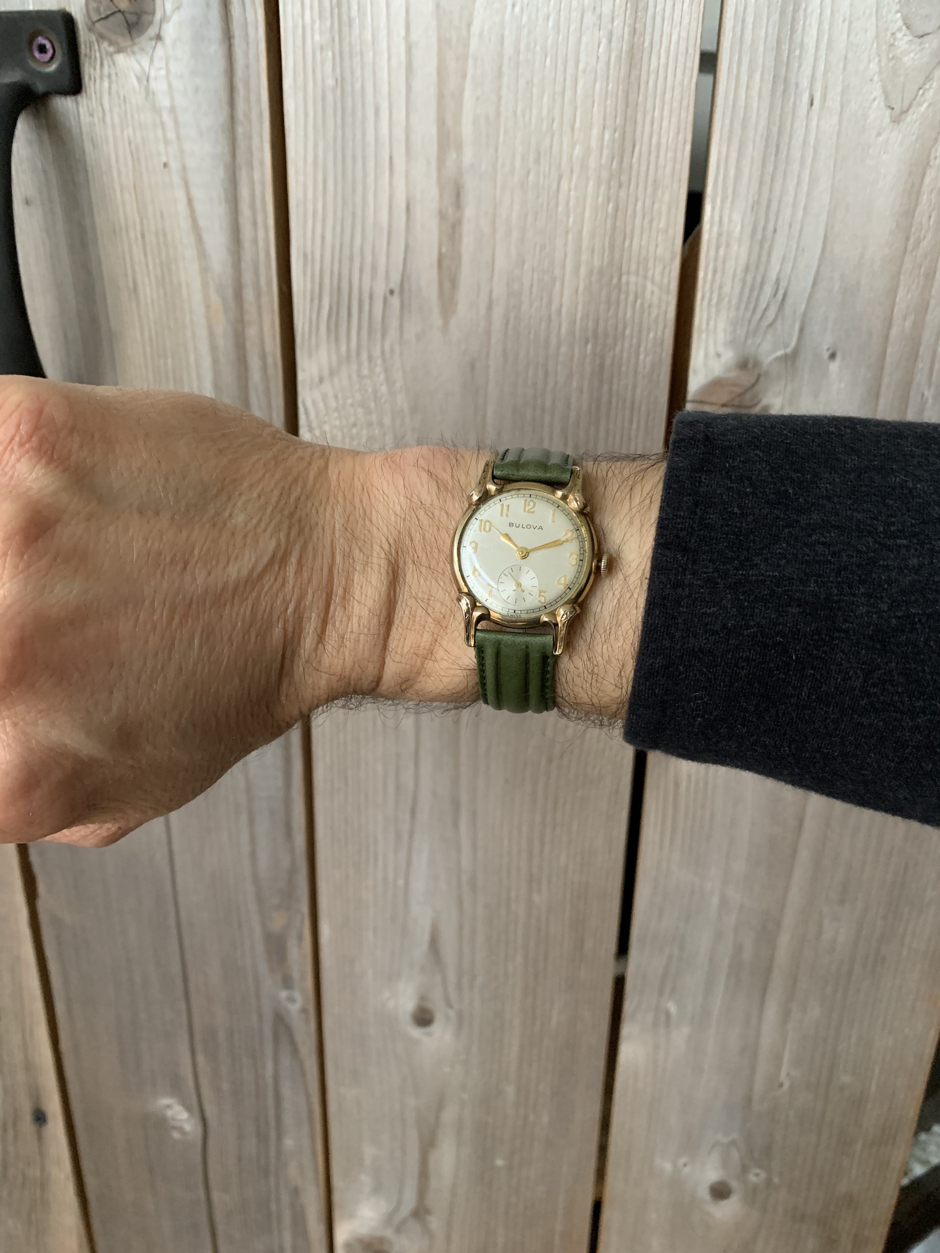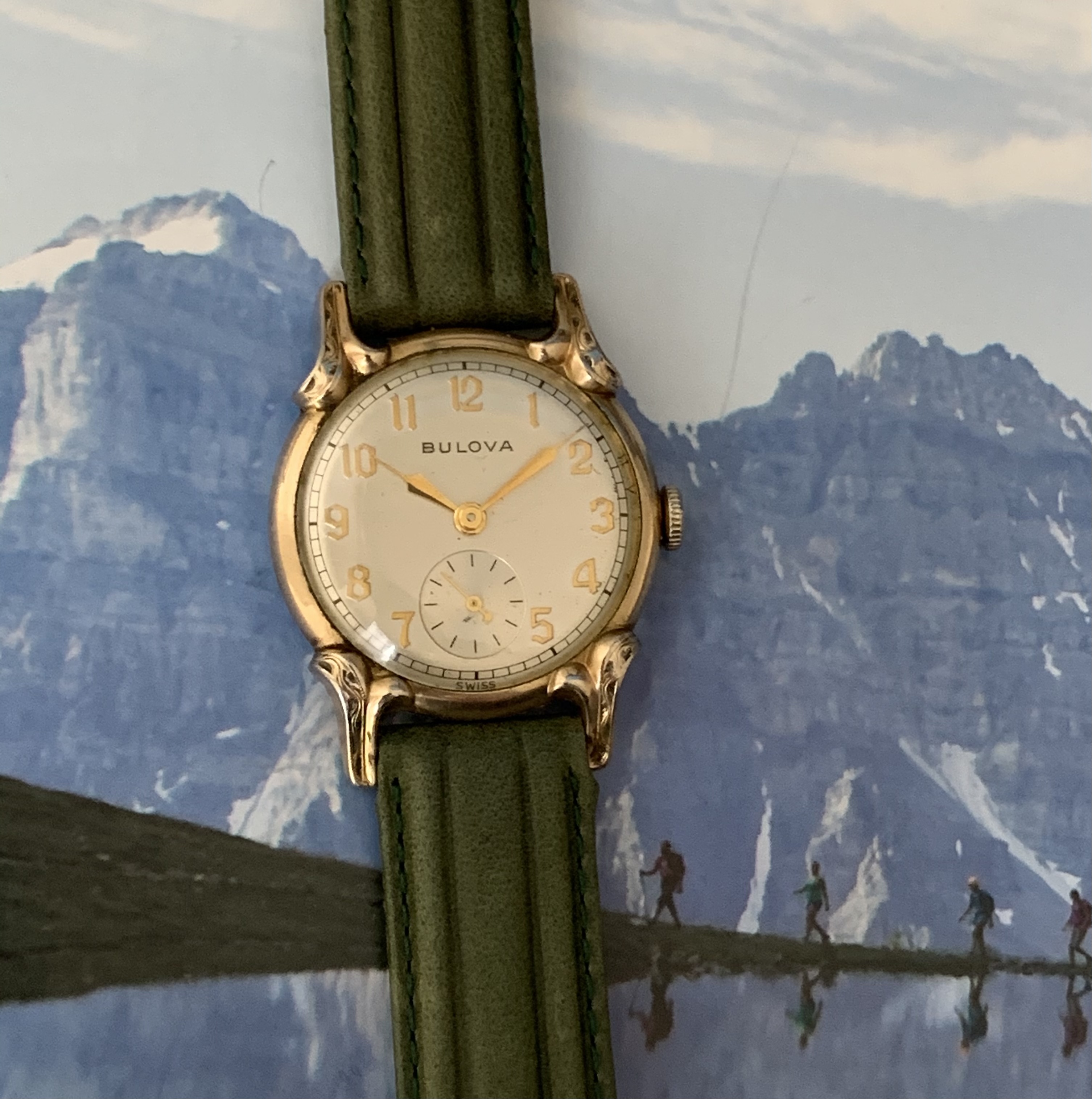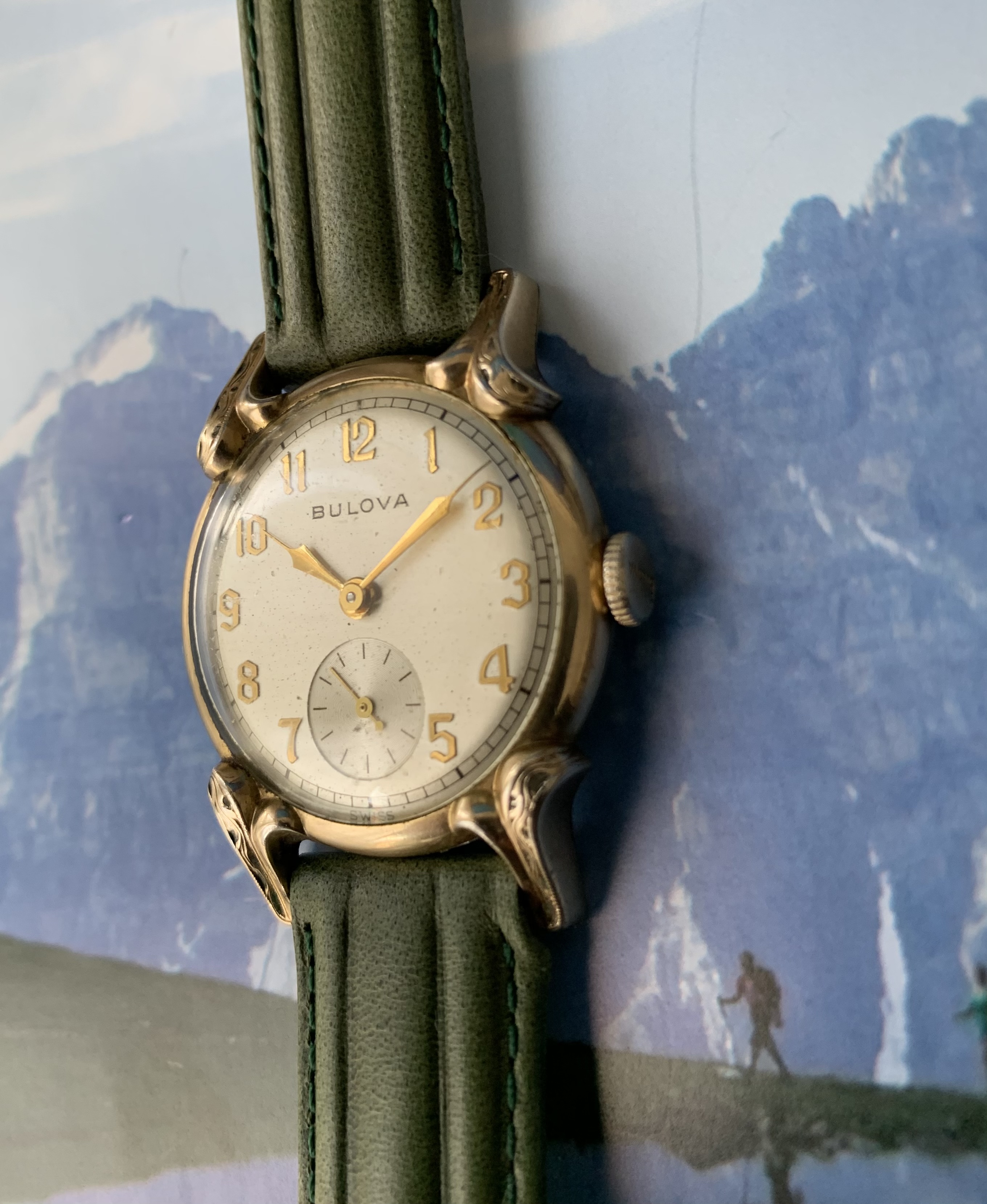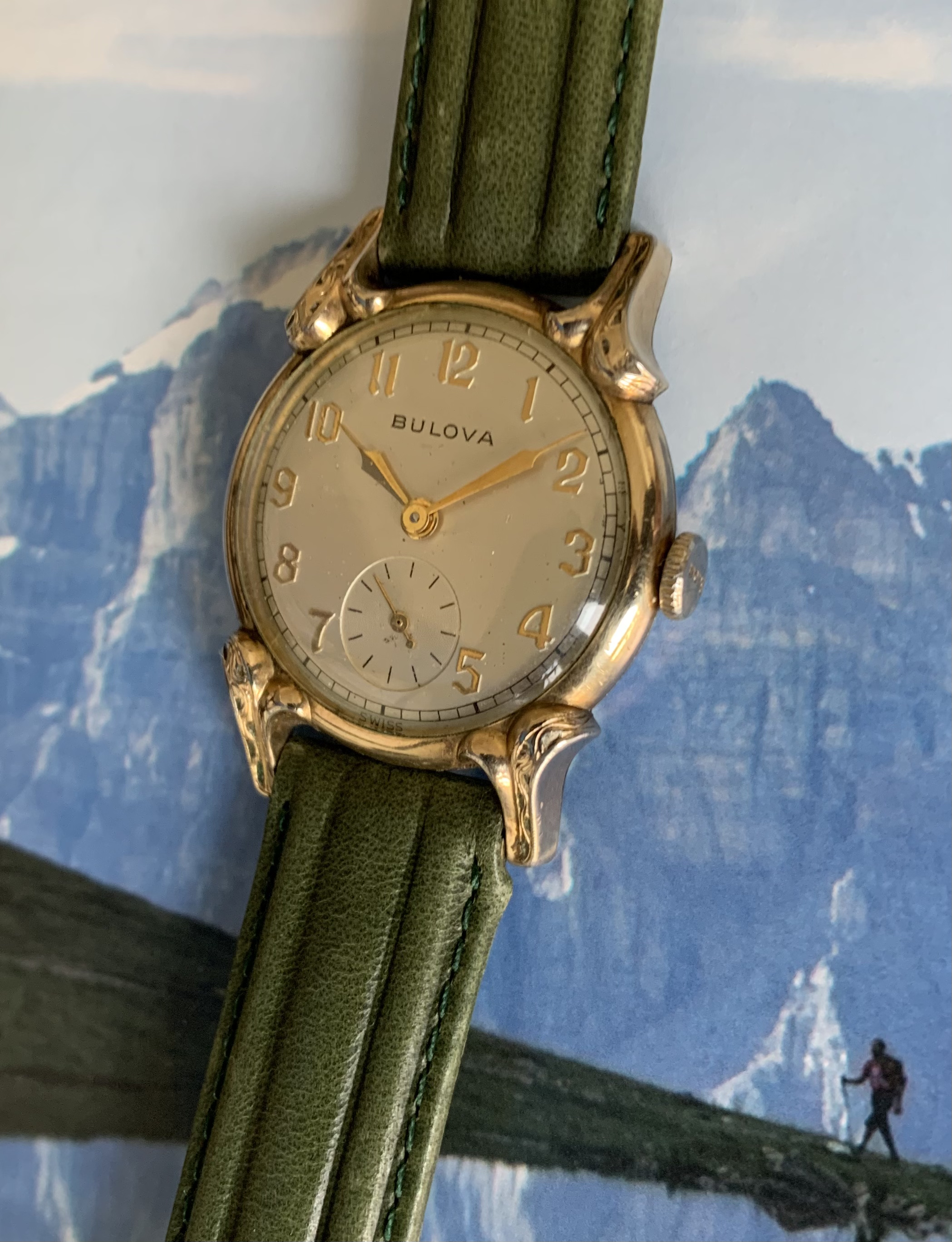 What we have is this handsome 1950 Bulova “Windsor”. The 30mm case is small by today's standards, but it was marketed as a man’s watch. This is an uncommon model, with a super attractive design that (IMO) marries 1930s styling with the 50s