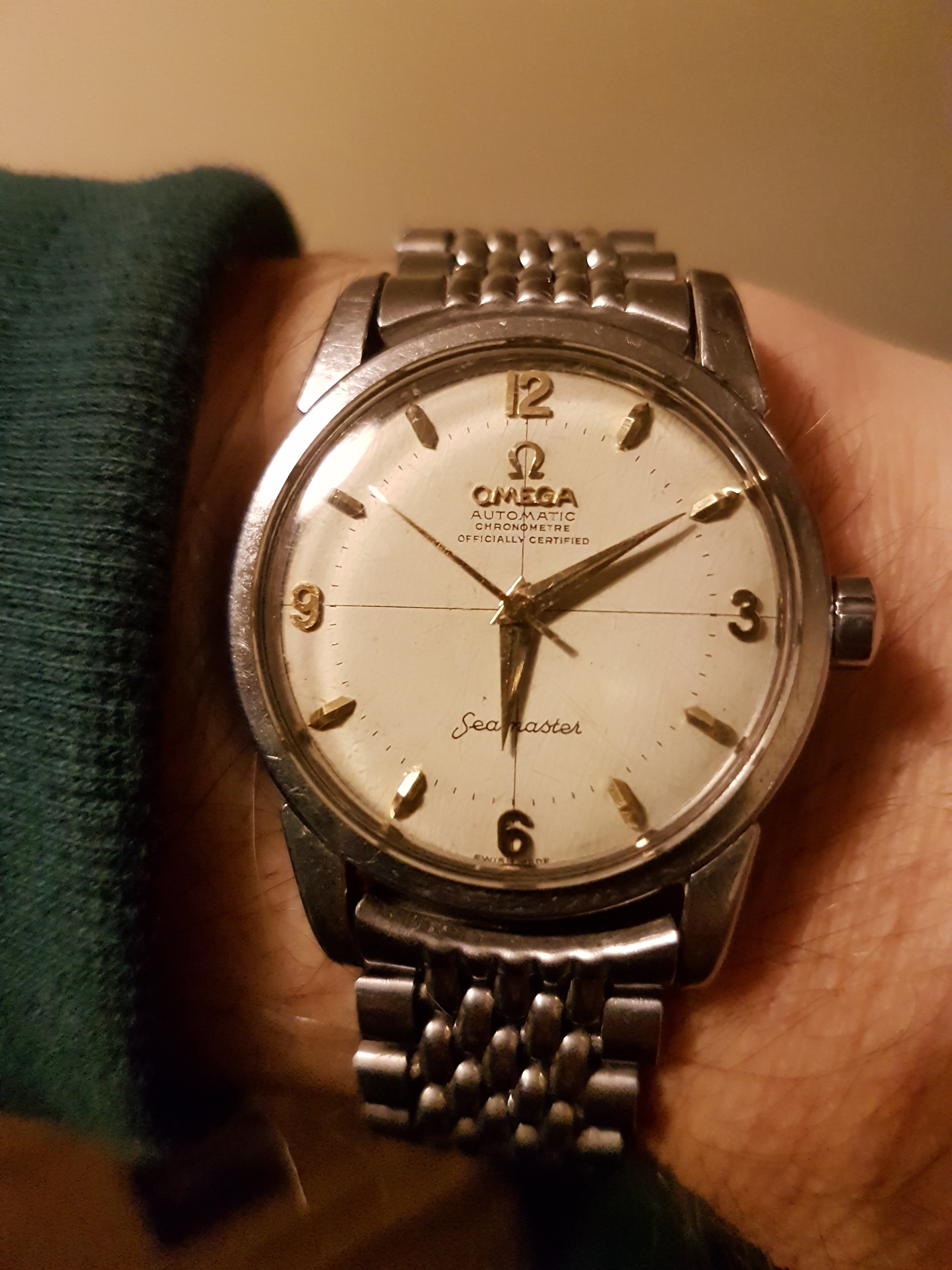 ·I am selling my stainless steel Omega Seamaster chronometre with bumper 354 movement 14766233 circa 1955, case reference 2767-5C. I have had this watch since 2013 and had it serviced that year, so although it seems to be running fine it’s well due for another service. The cream crosshair dial is original and near flawless with one or two tiny spots only visible on close examination and no staining or discoloration. There are radium lume dots on the baton markers but there has never been lume on the quarter markers, which is correct for this dial variant.
