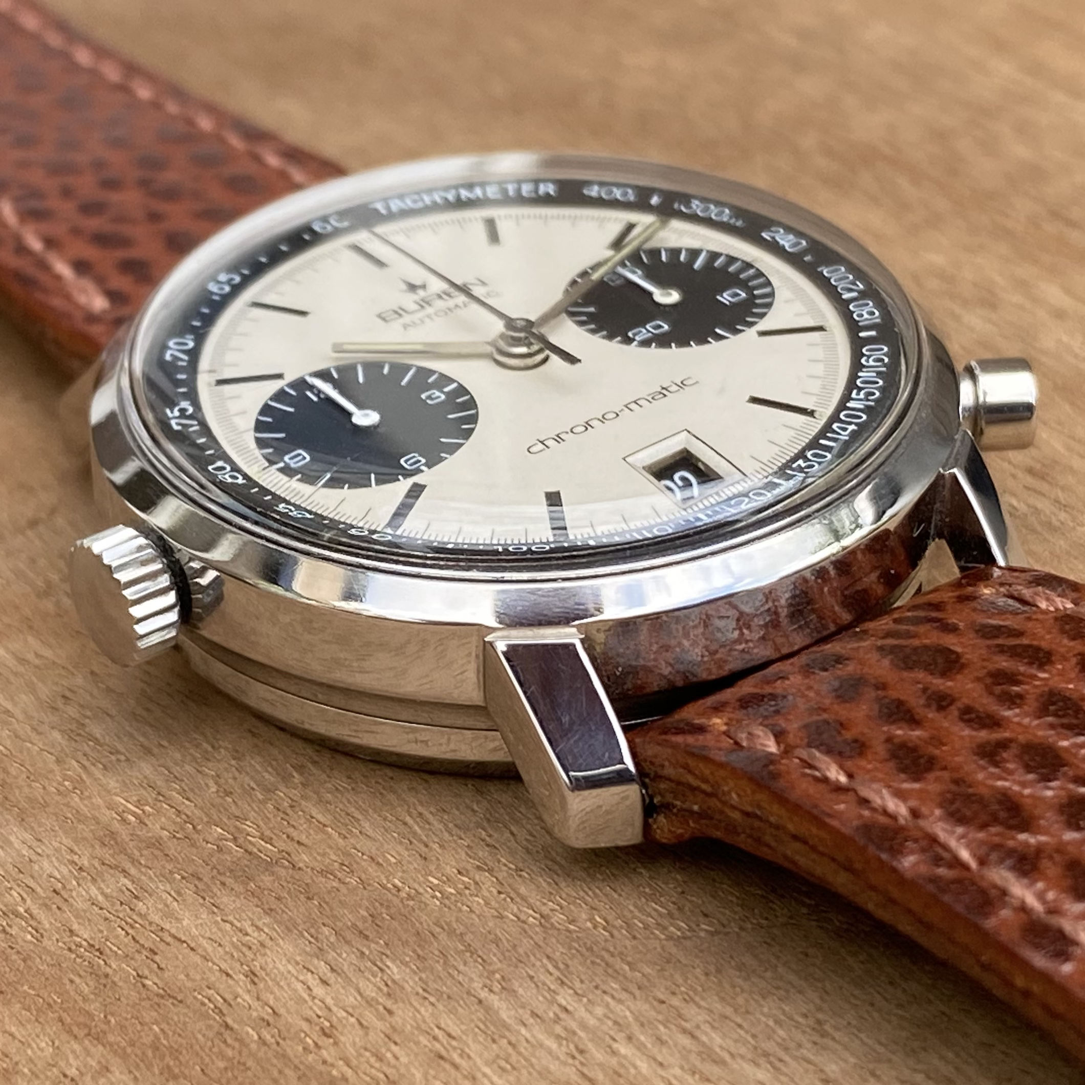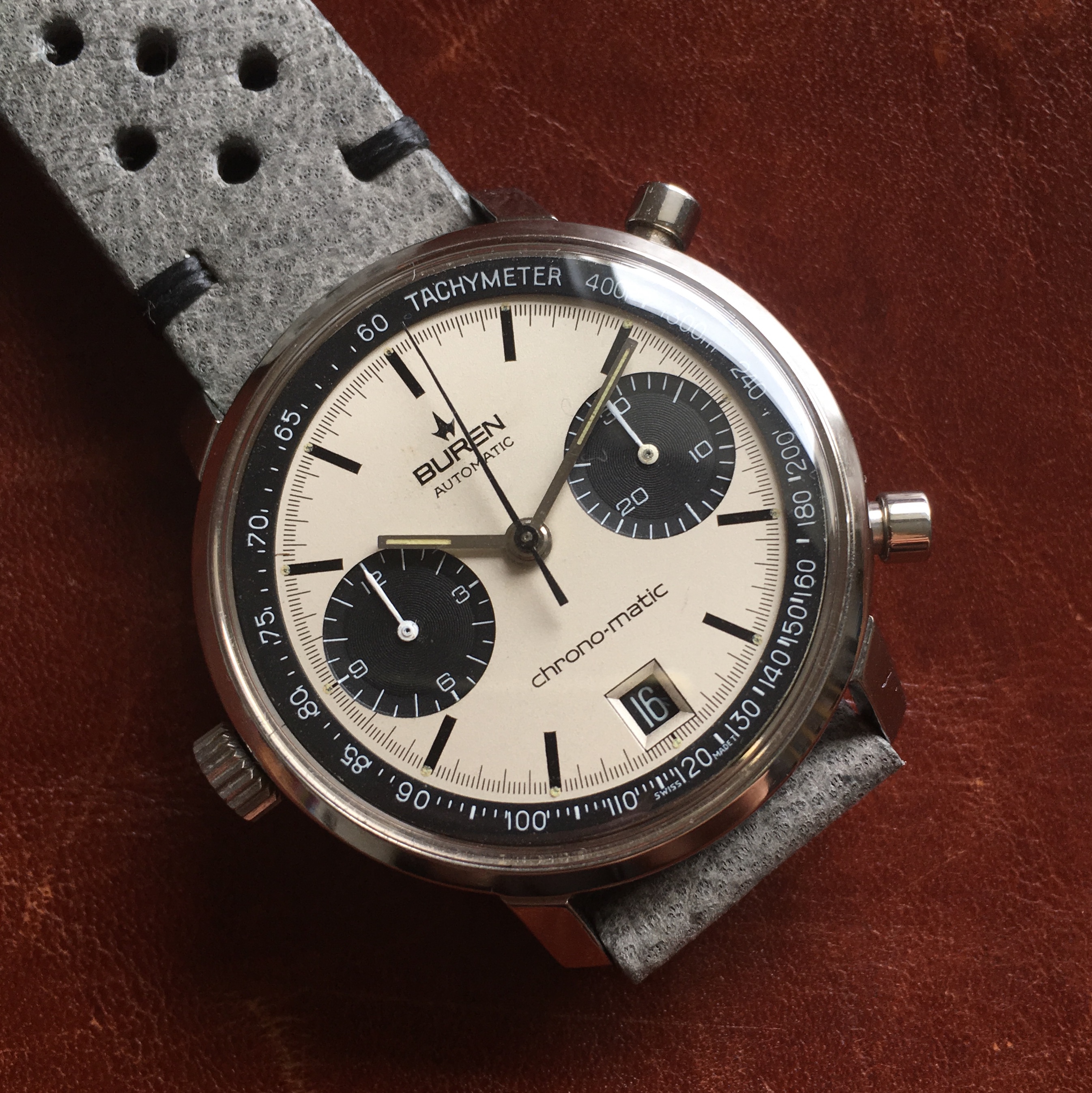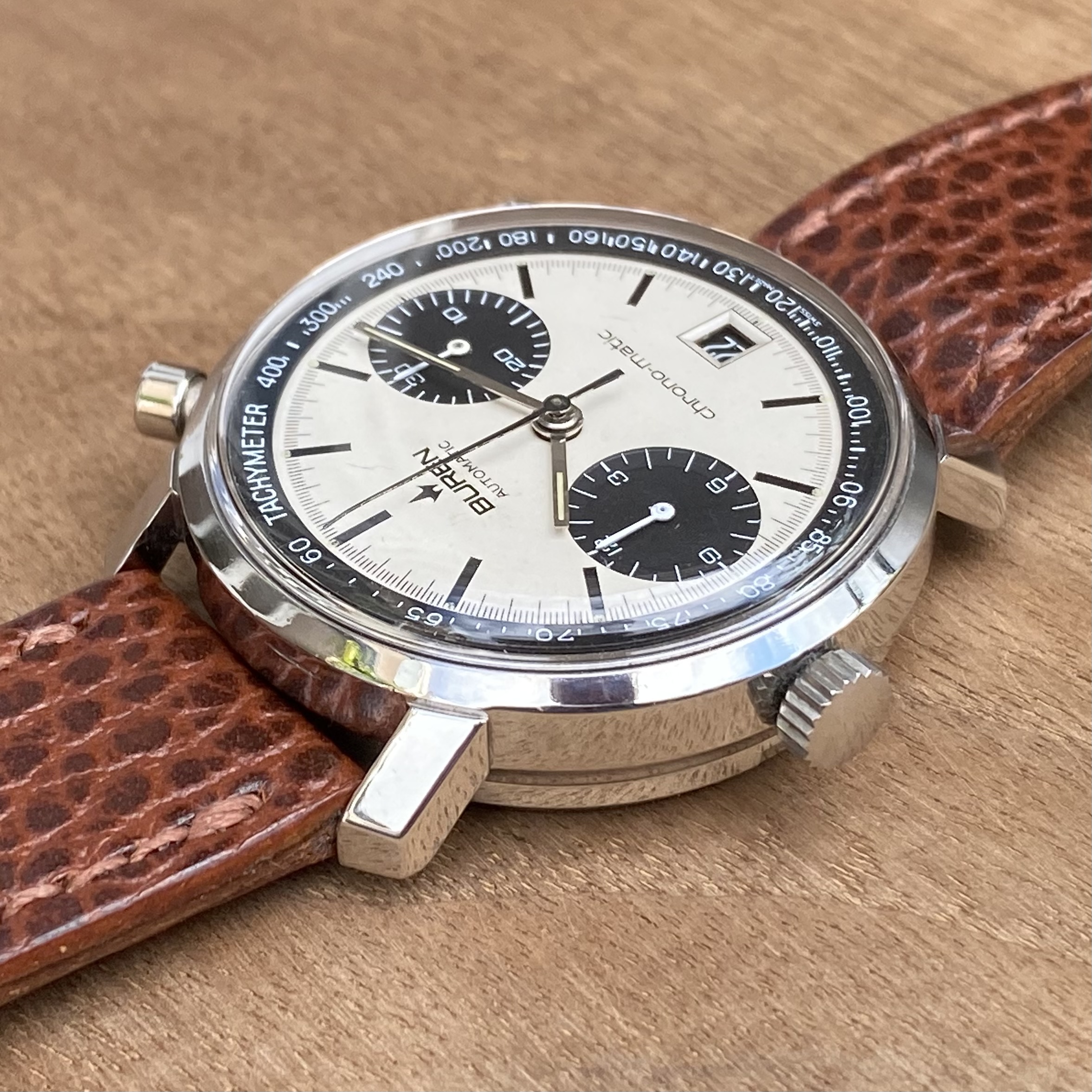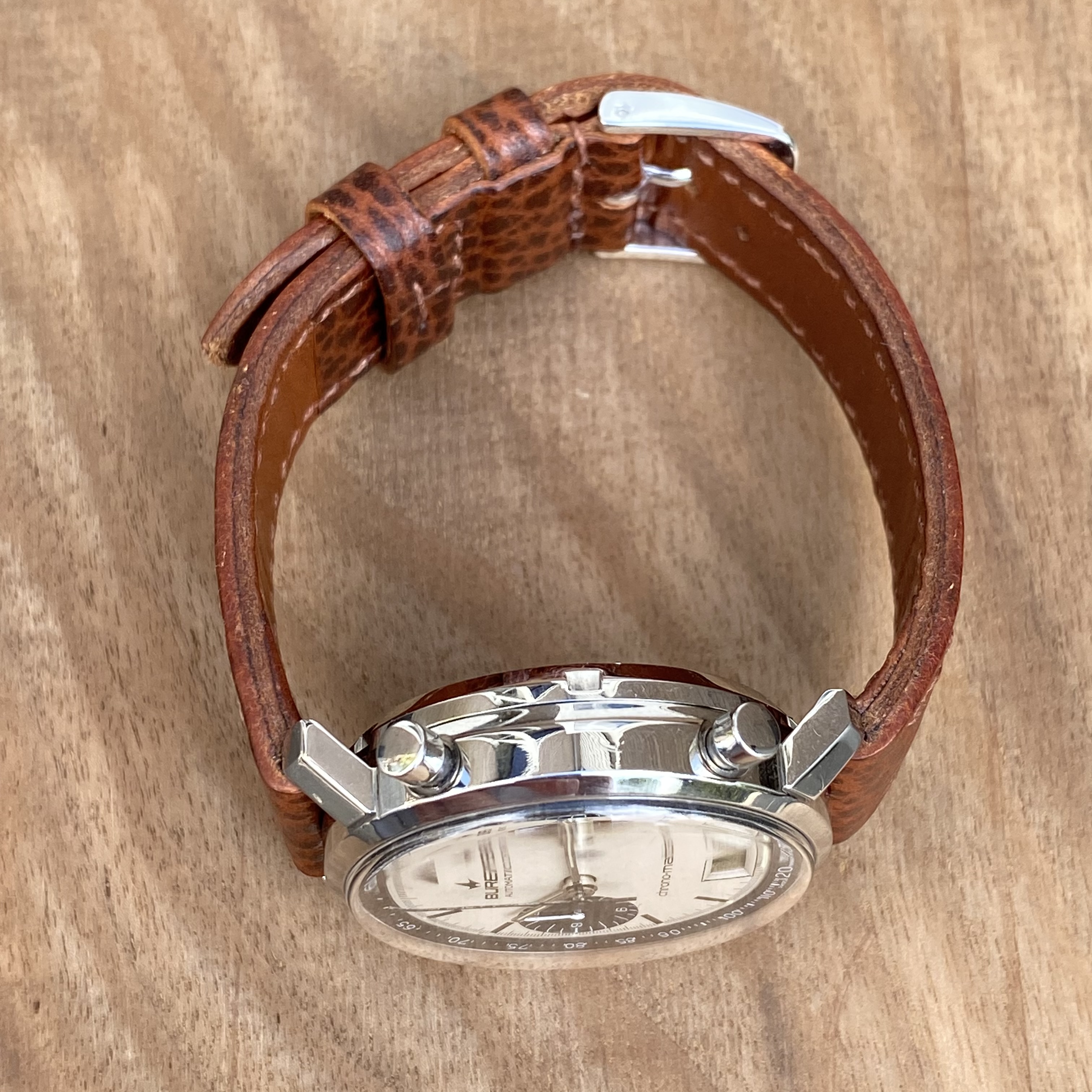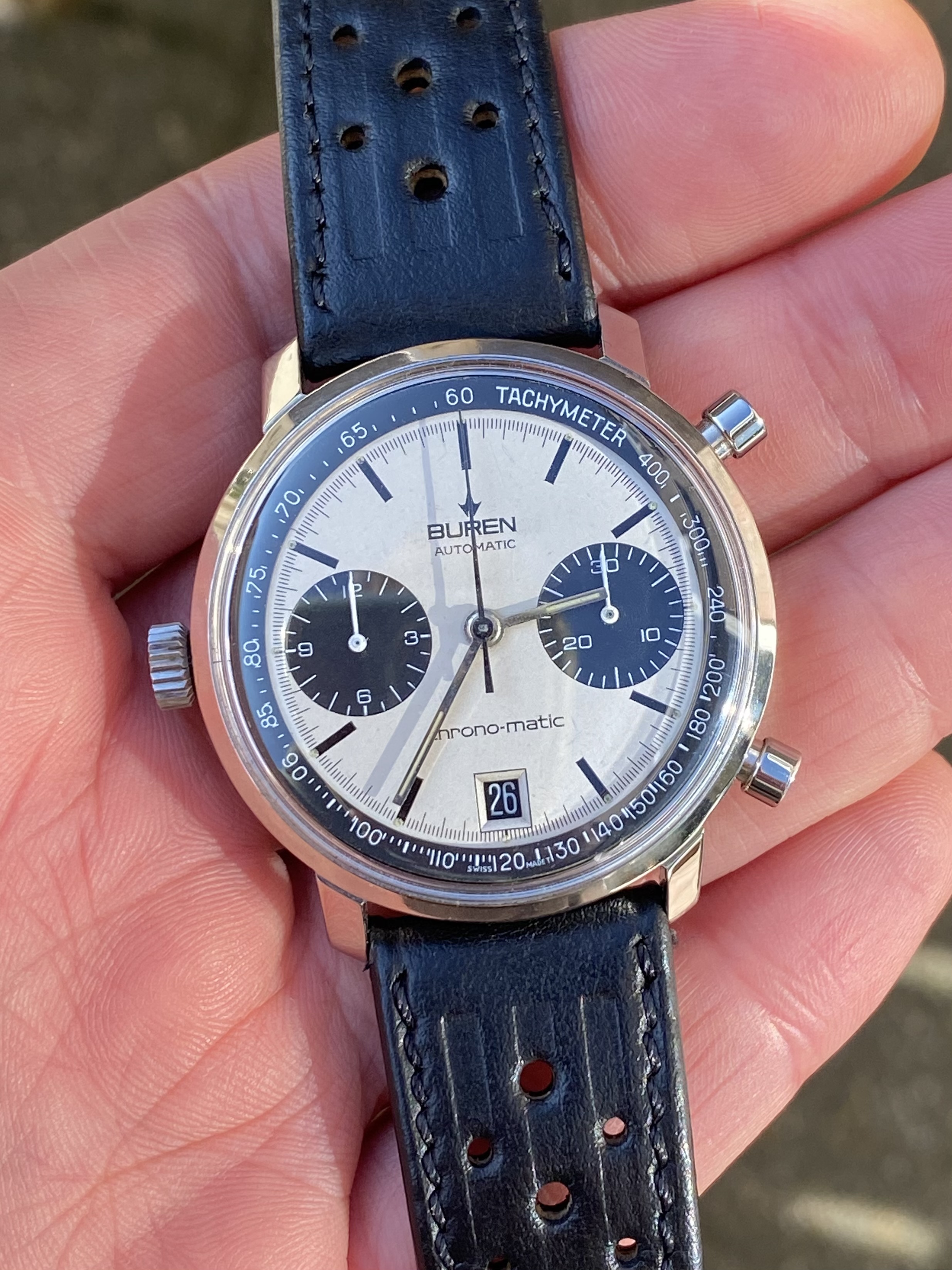 In order to fund another purchase, I would like to offer this Buren chrono-matic for sale. It is an uncommon version of this classic watch, with the Buren dial, instead of the more common Hamilton dial. Personally, I always found this appealing, since the calibre 11 movement was based on the Buren microrotor. The watch is from about 1969 and overall in good vintage condition. It is all original, except maybe the crystal (I honestly just don’t know).