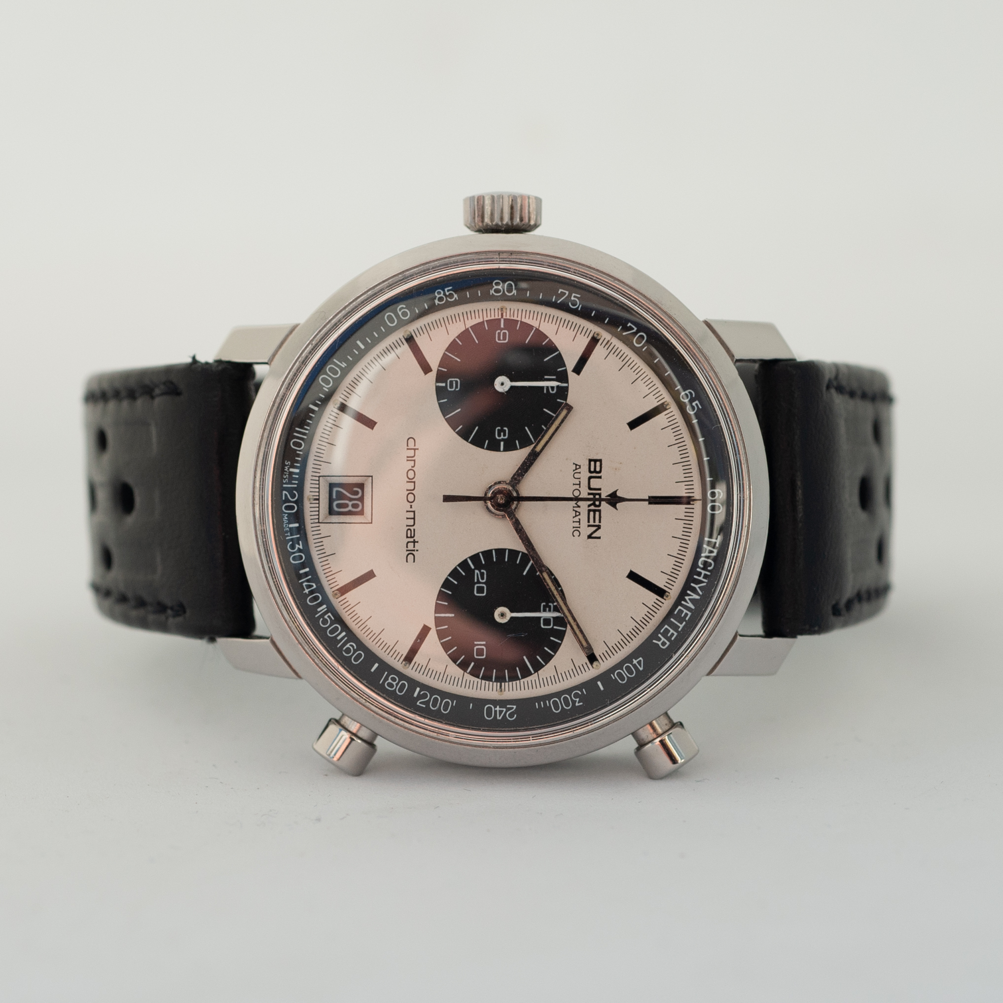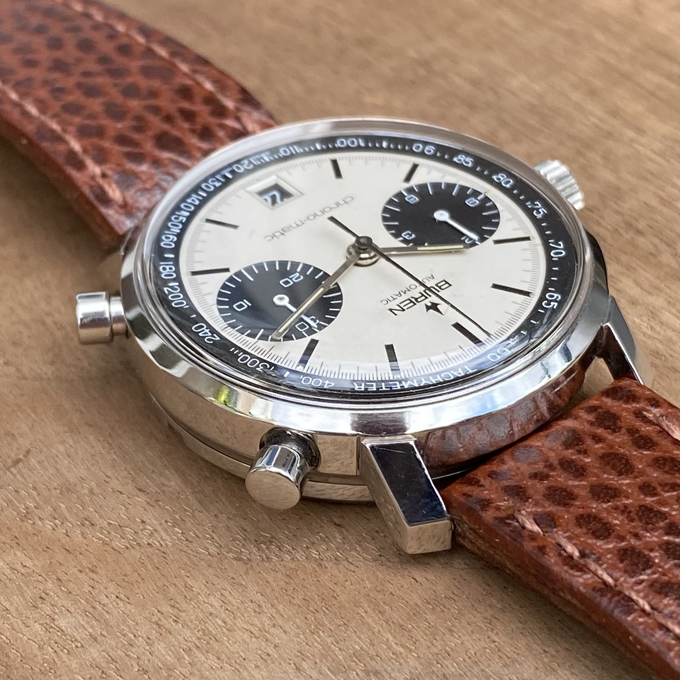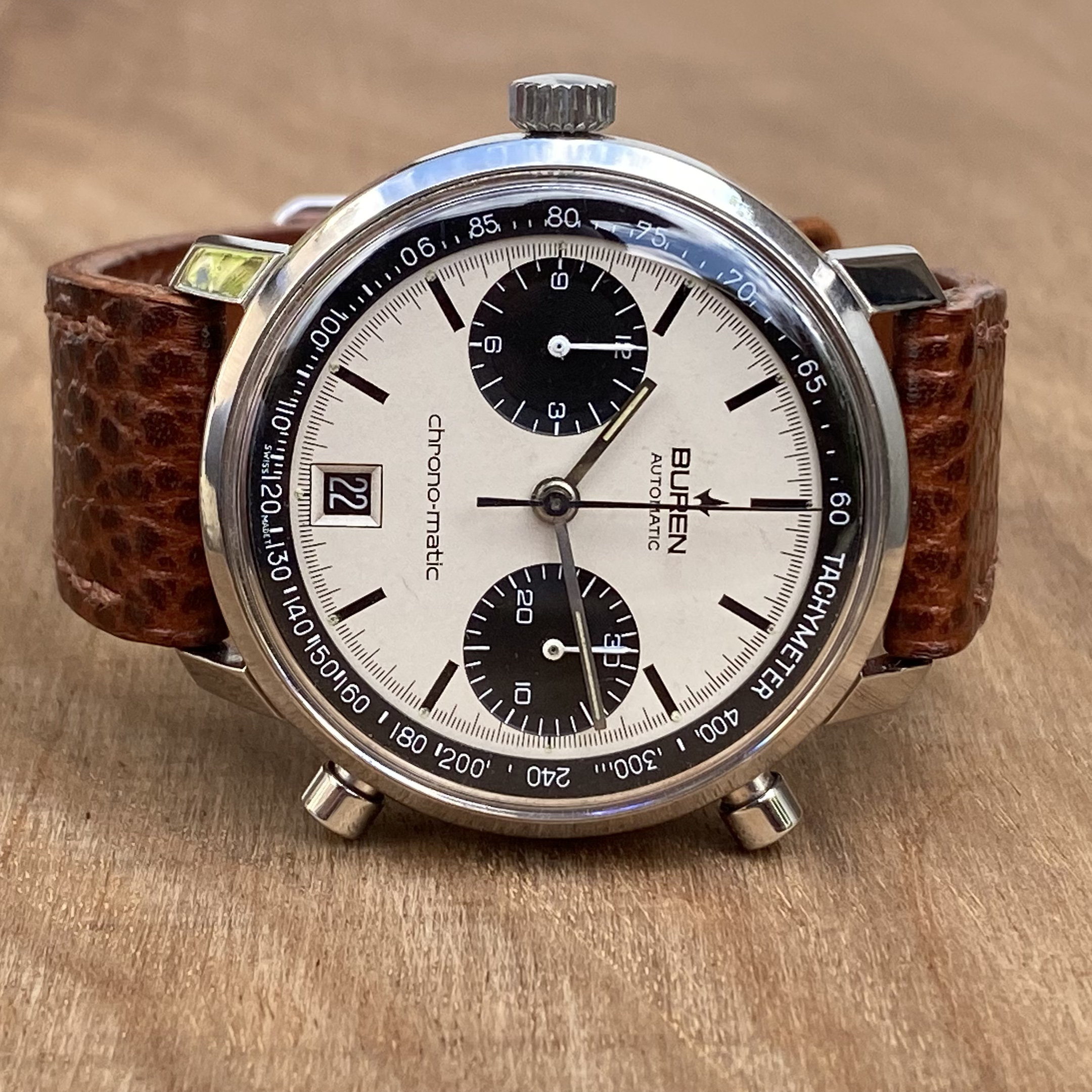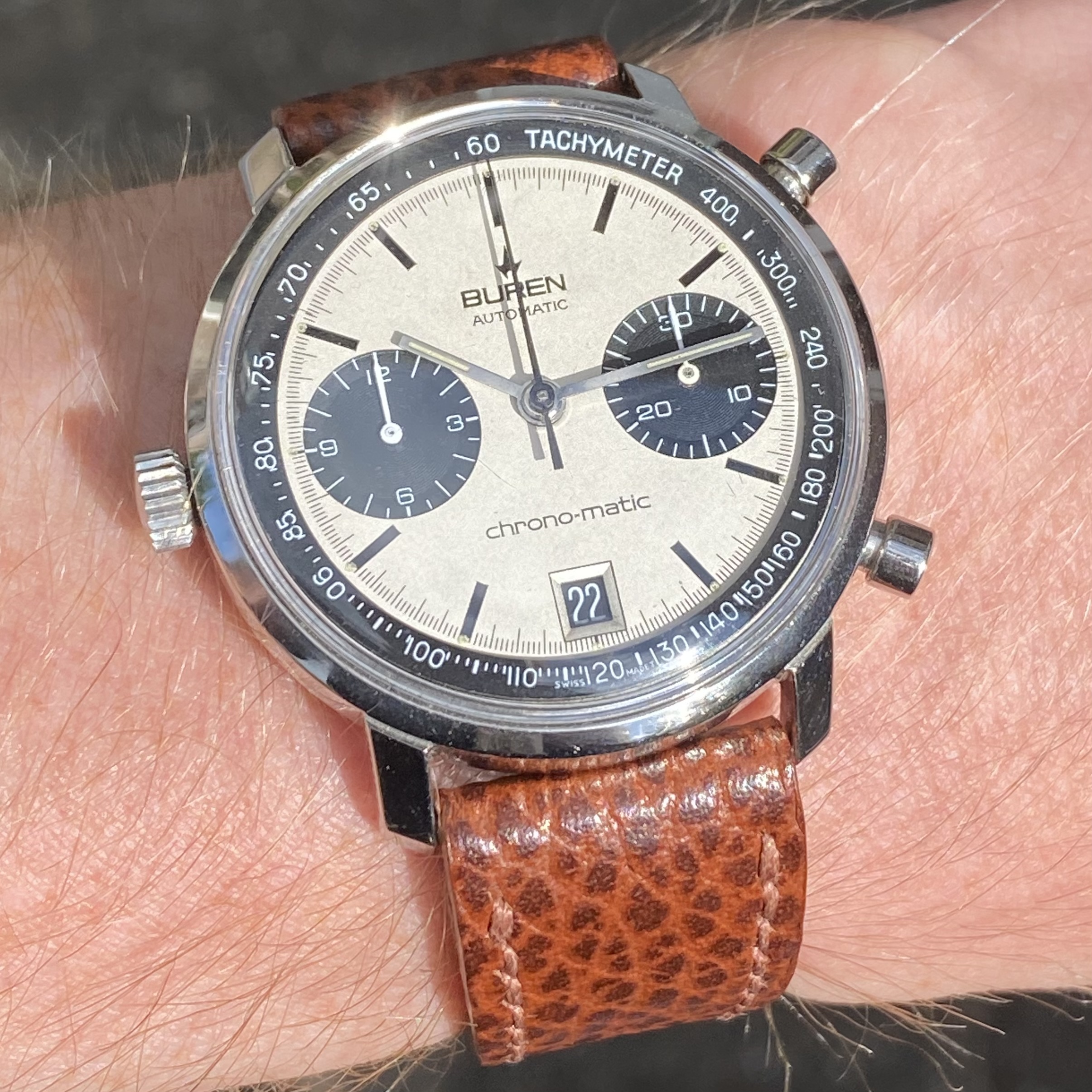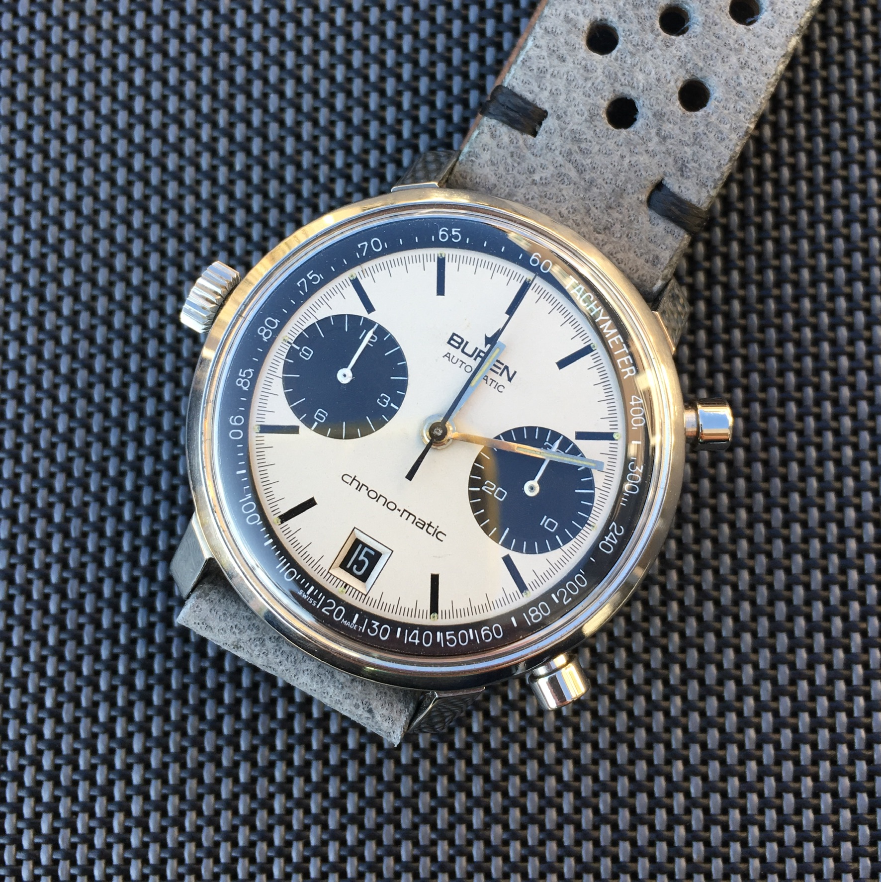 In order to fund another purchase, I would like to offer this Buren chrono-matic for sale. It is an uncommon version of this classic watch, with the Buren dial, instead of the more common Hamilton dial. Personally, I always found this appealing, since the calibre 11 movement was based on the Buren microrotor. The watch is from about 1969 and overall in good vintage condition. It is all original, except maybe the crystal (I honestly just don’t know).