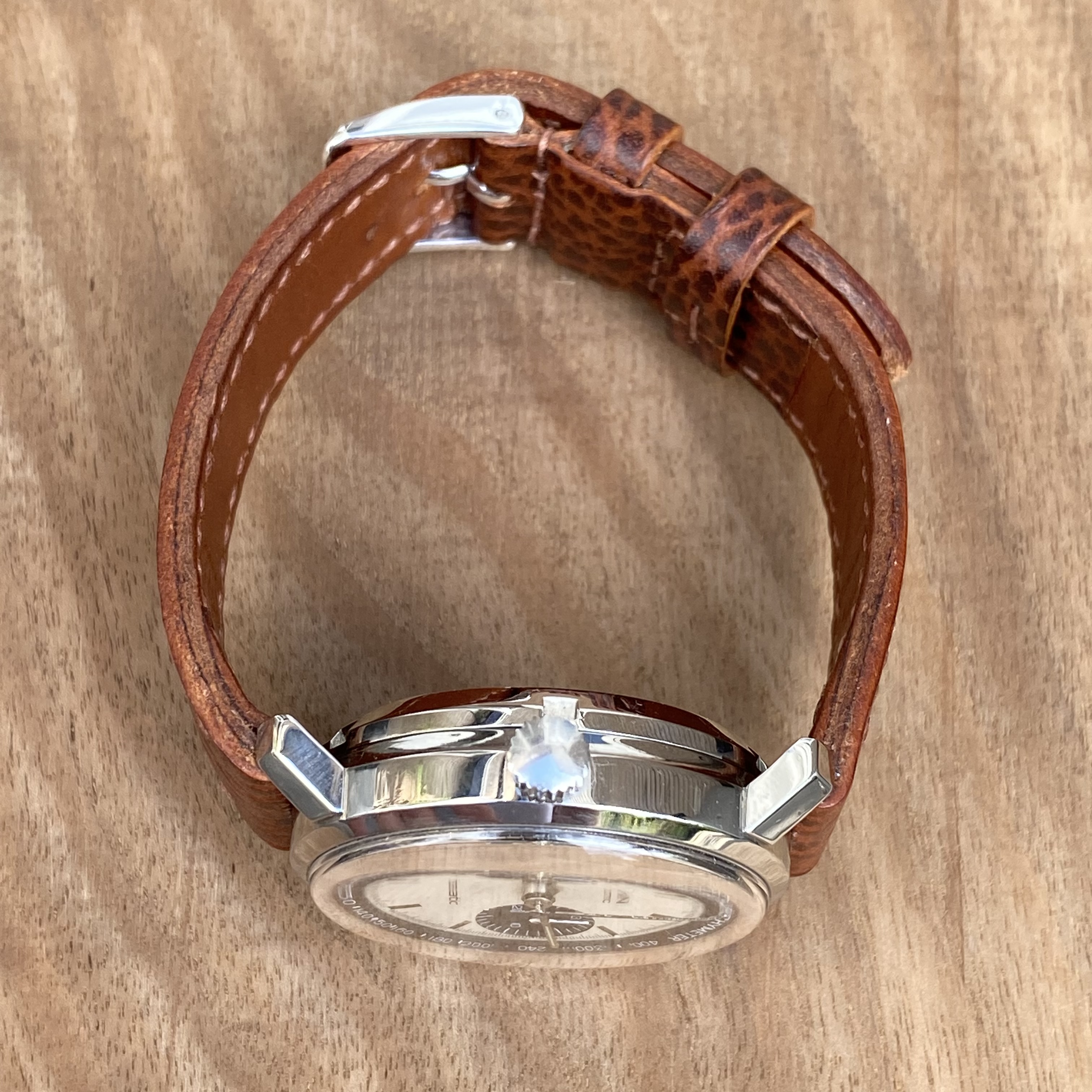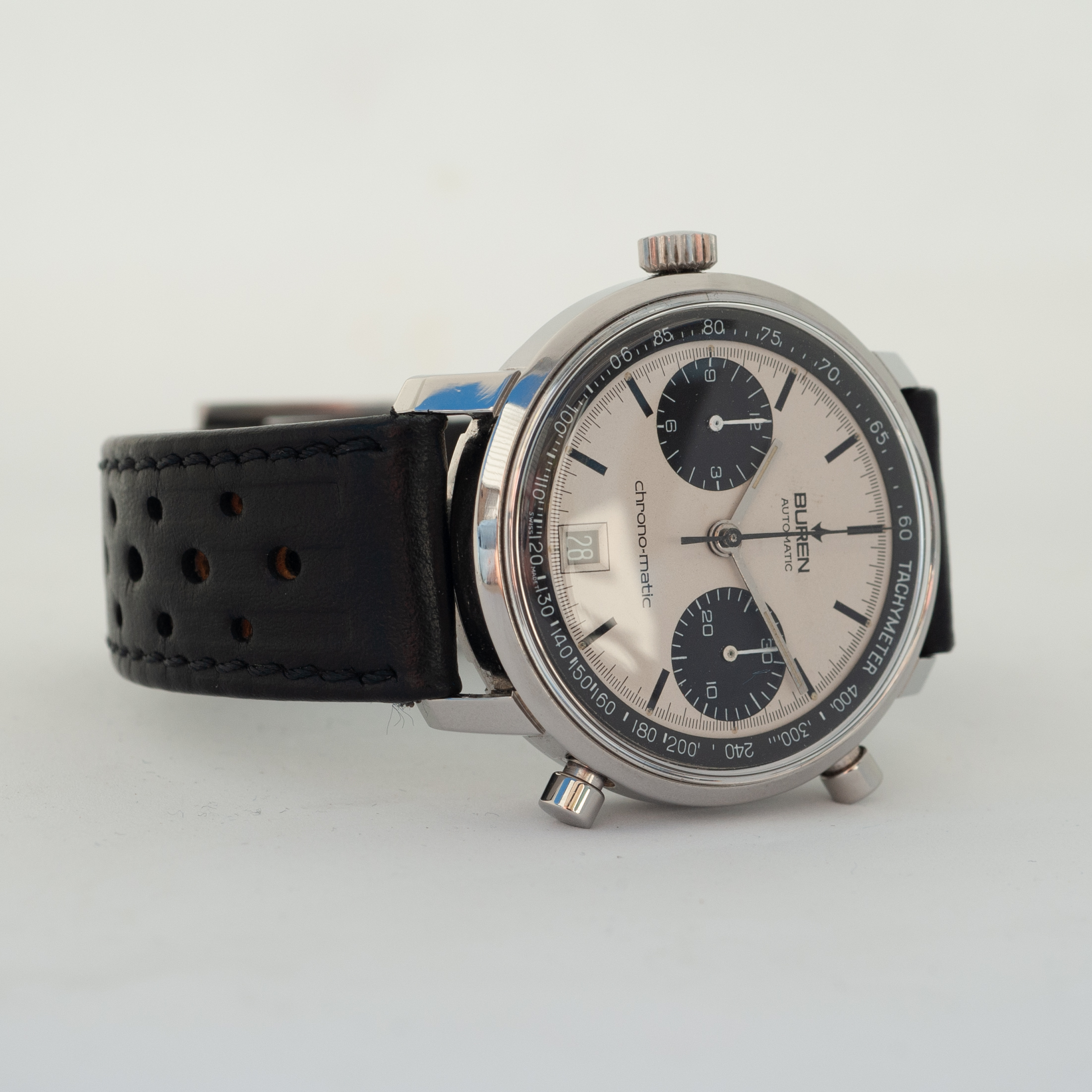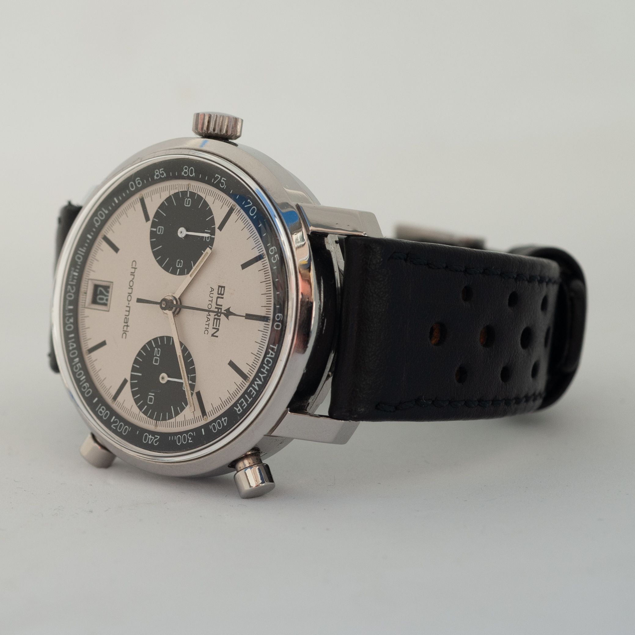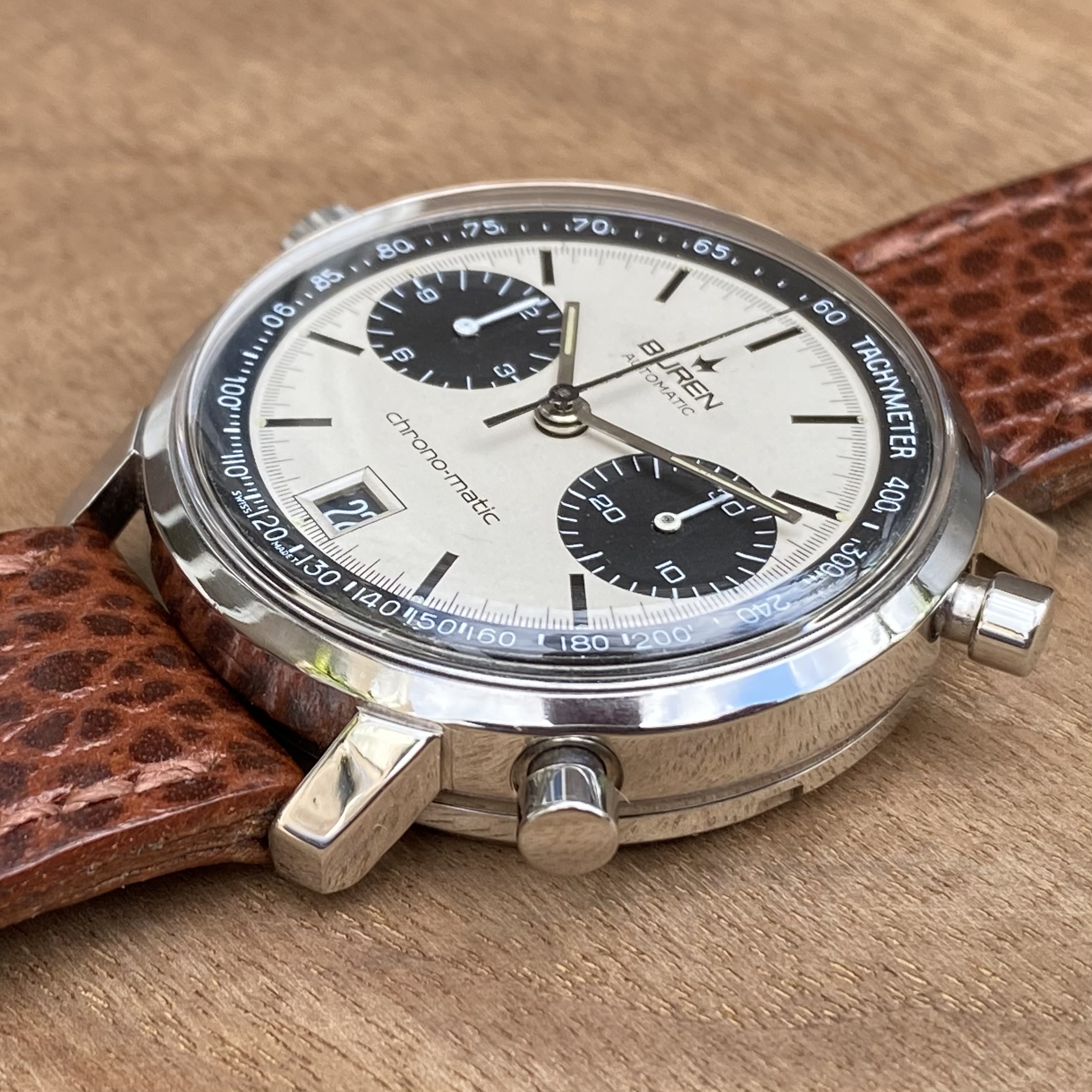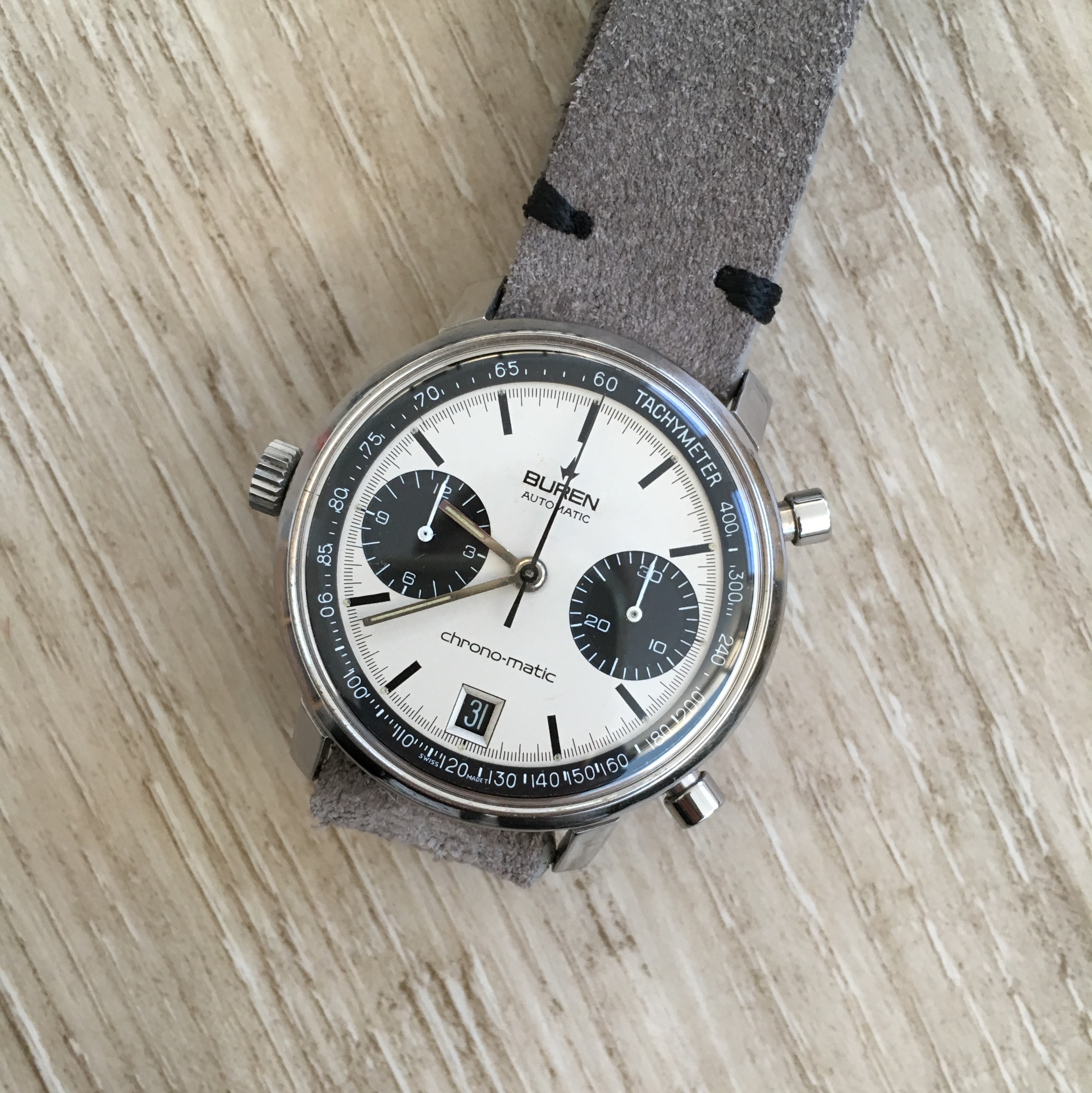 In order to fund another purchase, I would like to offer this Buren chrono-matic for sale. It is an uncommon version of this classic watch, with the Buren dial, instead of the more common Hamilton dial. Personally, I always found this appealing, since the calibre 11 movement was based on the Buren microrotor. The watch is from about 1969 and overall in good vintage condition. It is all original, except maybe the crystal (I honestly just don’t know).