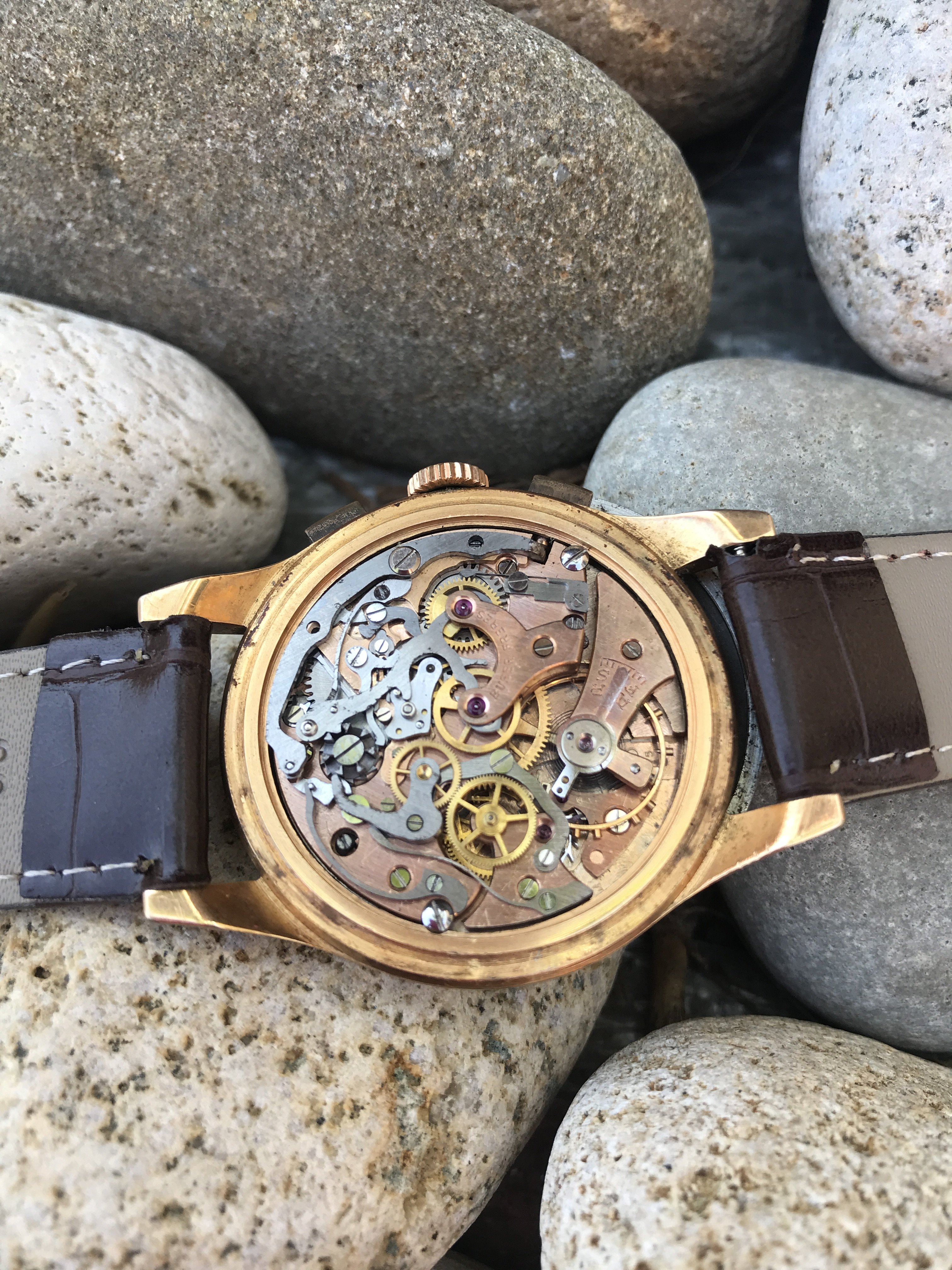 Buser Frères & Cie S.A., a family owned business whose origins began in 1892 in Niederdorf, Switzerland; were a true ‘manufacture d’horlogerie’. Buser designed and produced select components and ebauches in-house. In fact Buser were responsible for over 20 calibers, both manually wound and automatic, including early cylinder and lever movements, open face hunter movements and chronometer-grade movements . Buser movements can be recognised most commonly by their trademark capital ‘B’ within a triangle, and were utilised by Buser’s sub-brands (Nidor, Frenca, Esta, Neo, Tiptop, Buwat and others) and other watch companies such as Gruen.