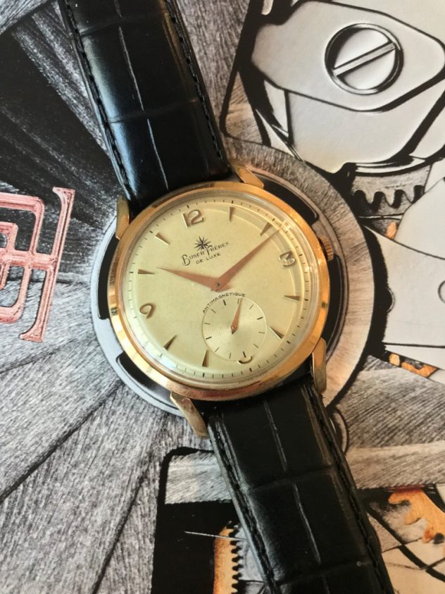 The vintage Buser Frères piece shown here, dating from the 1950s is powered by Buser’s nicely designed 13 ligne, 15 jewels, calibre 180 manual wind movement. At 38mm in diameter, this watch is large for its era. The beautiful dial has developed a lovely even honey patina over the years, and the slightly curved long lugs give the watch a very elegant look.