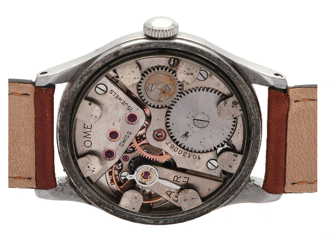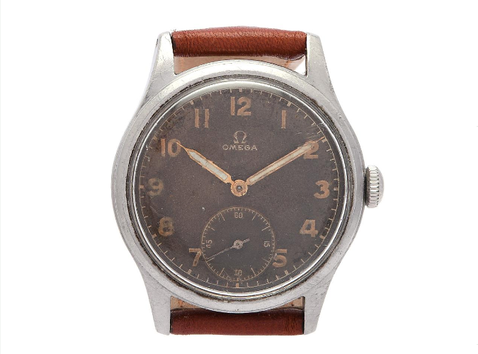 "OMEGA, Sovereign, Cal 30 T2 PC, Series no. 10130067, Ref no. CK 2400, Boett no. 2400-2 / 3274, men's watch, 35 mm, steel, manual, plexiglass, small second hand, damaged dial, leather strap, ca 1944."