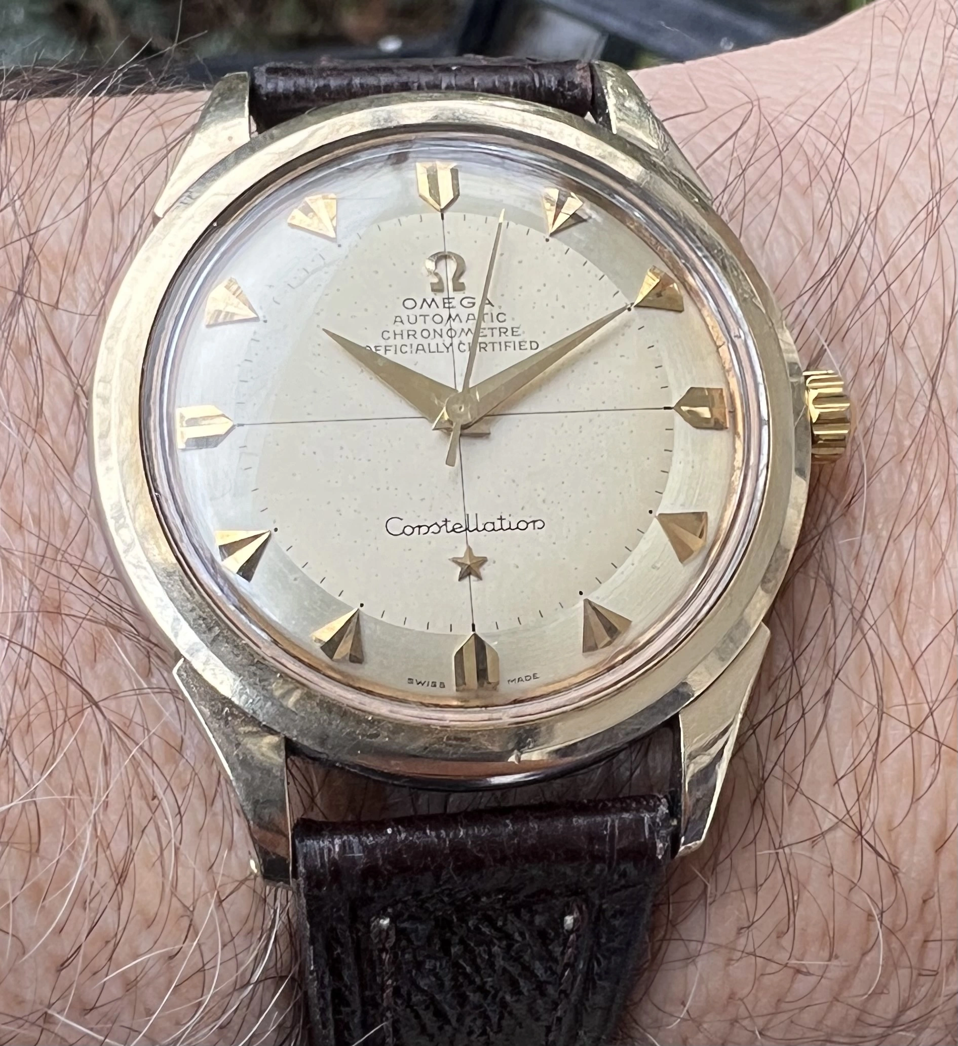 I think this is very attractive early Constellation. The dial is quite good with arrowhead markers with very little patina visible. Often these have quite extensive spotting which don’t see here. Correct hands. Movement is correct and looks clean. Everything looks correct and original.
