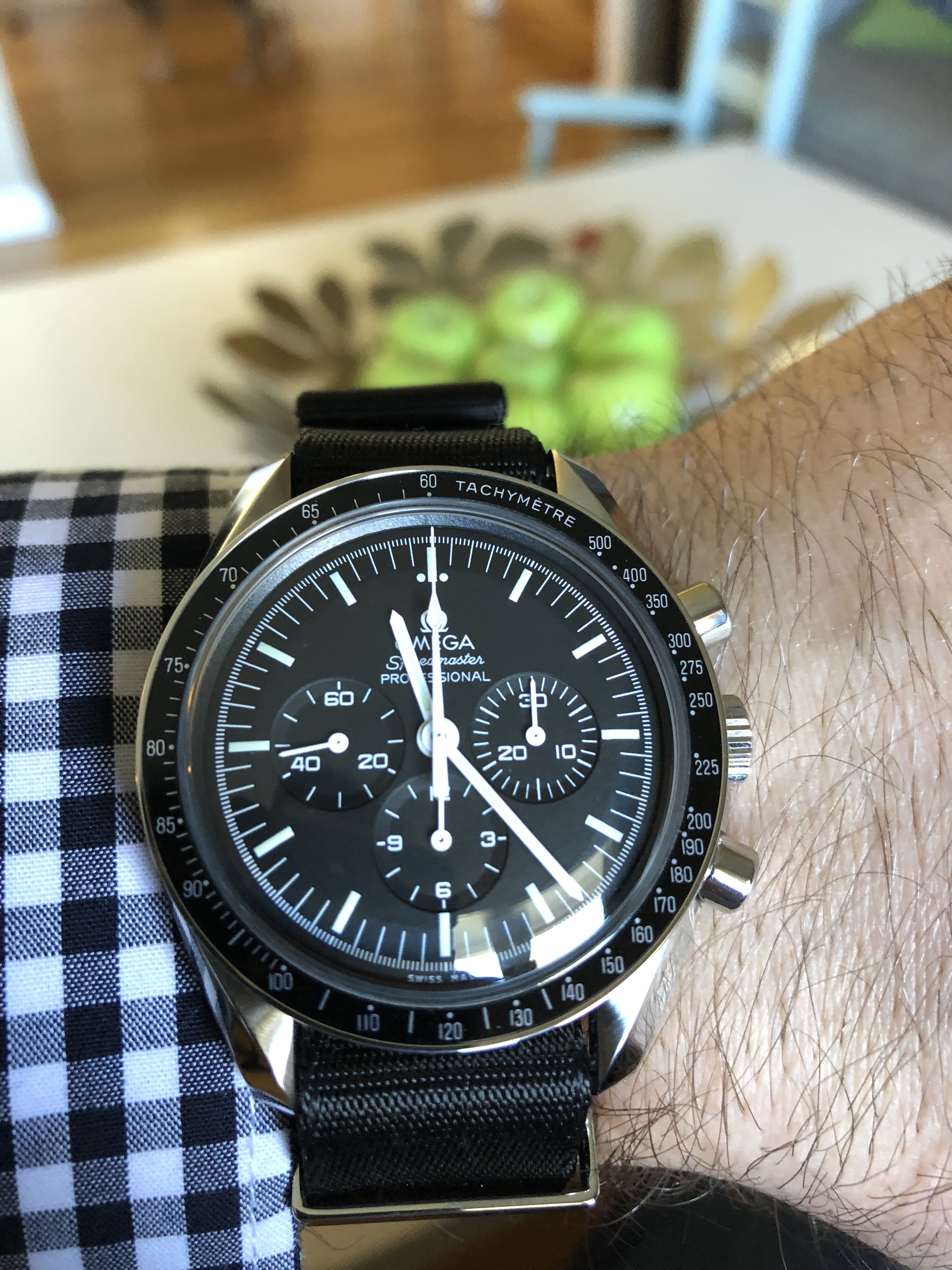 Later, you or your husband can get alternate leather straps which can be swapped about to his heart's content. Speedmasters have an almost unique ability to look great, yet different, on any leather strap. You can even have them custom made for very little money.
