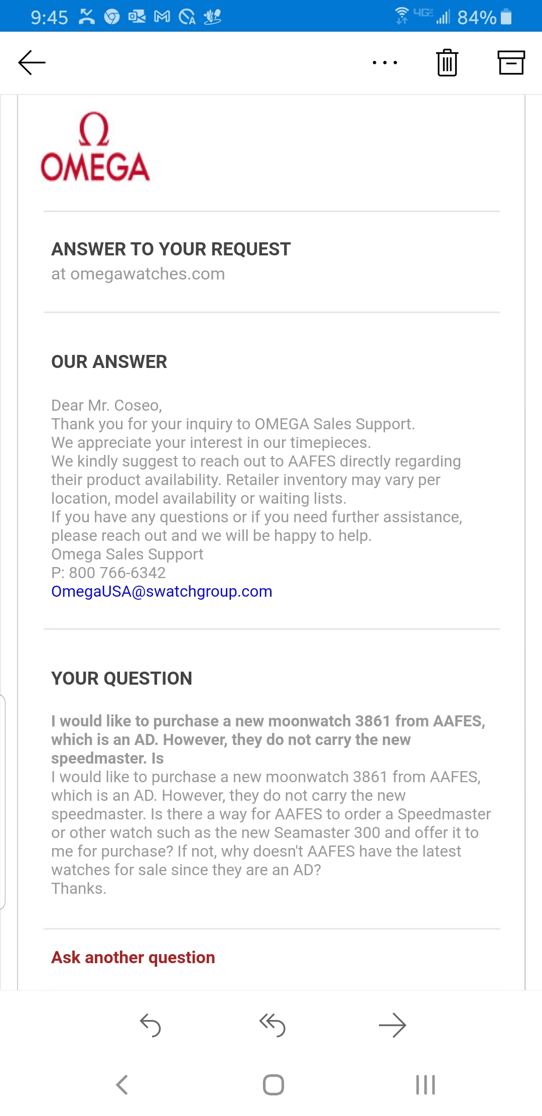 Yep. It was a long shot. I had already asked AAFES if they planned on getting the new watches or if I could order through them. No and no. The Omega request was more of a hail mary.