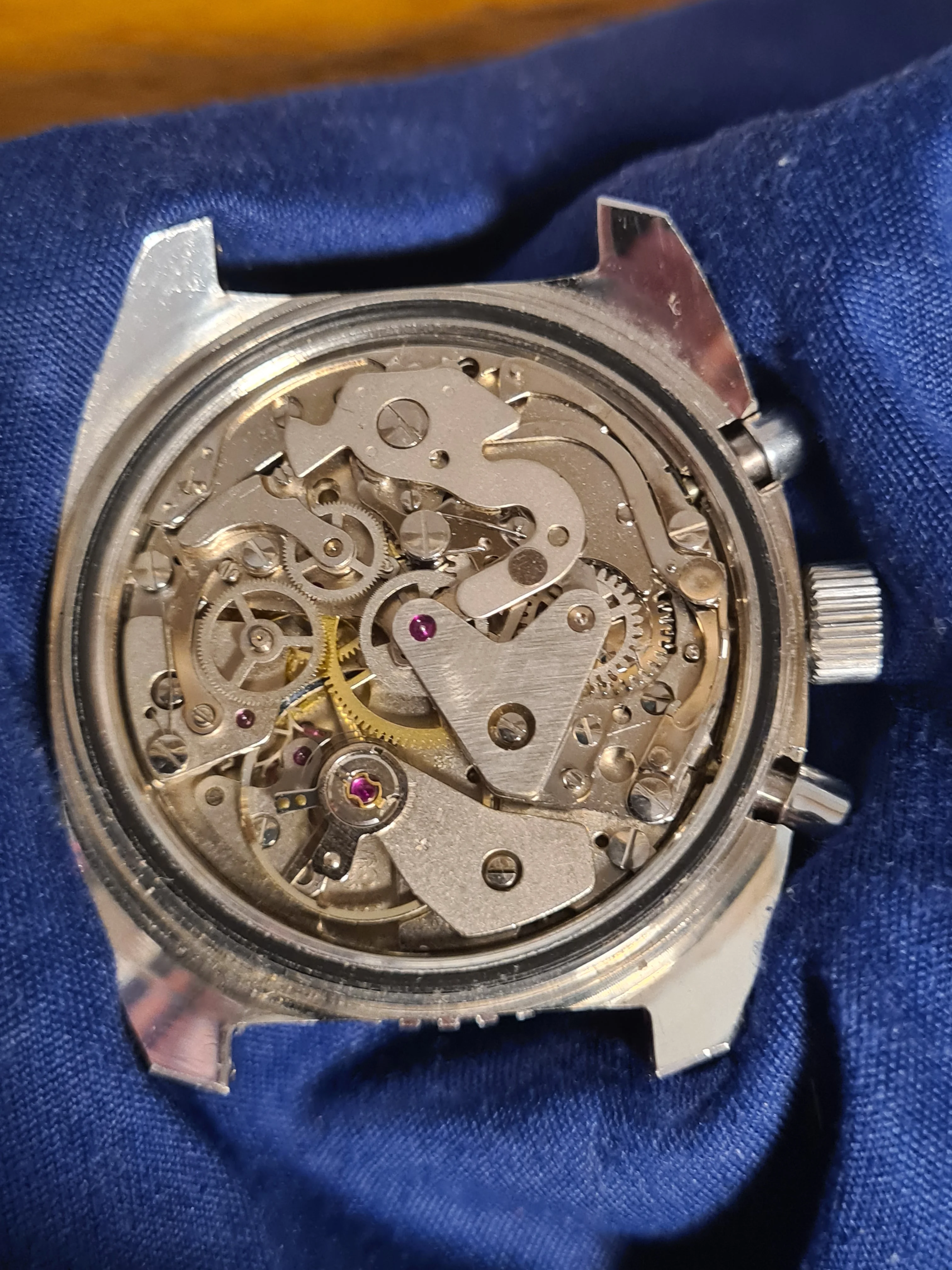 The Movement: Hand-wound Valjoux 7733 movement. Very clean, running strong, and keeping good time. All chrono functions work perfectly and sweep hand resets to zero. One previous owner (German). Service history unknown.