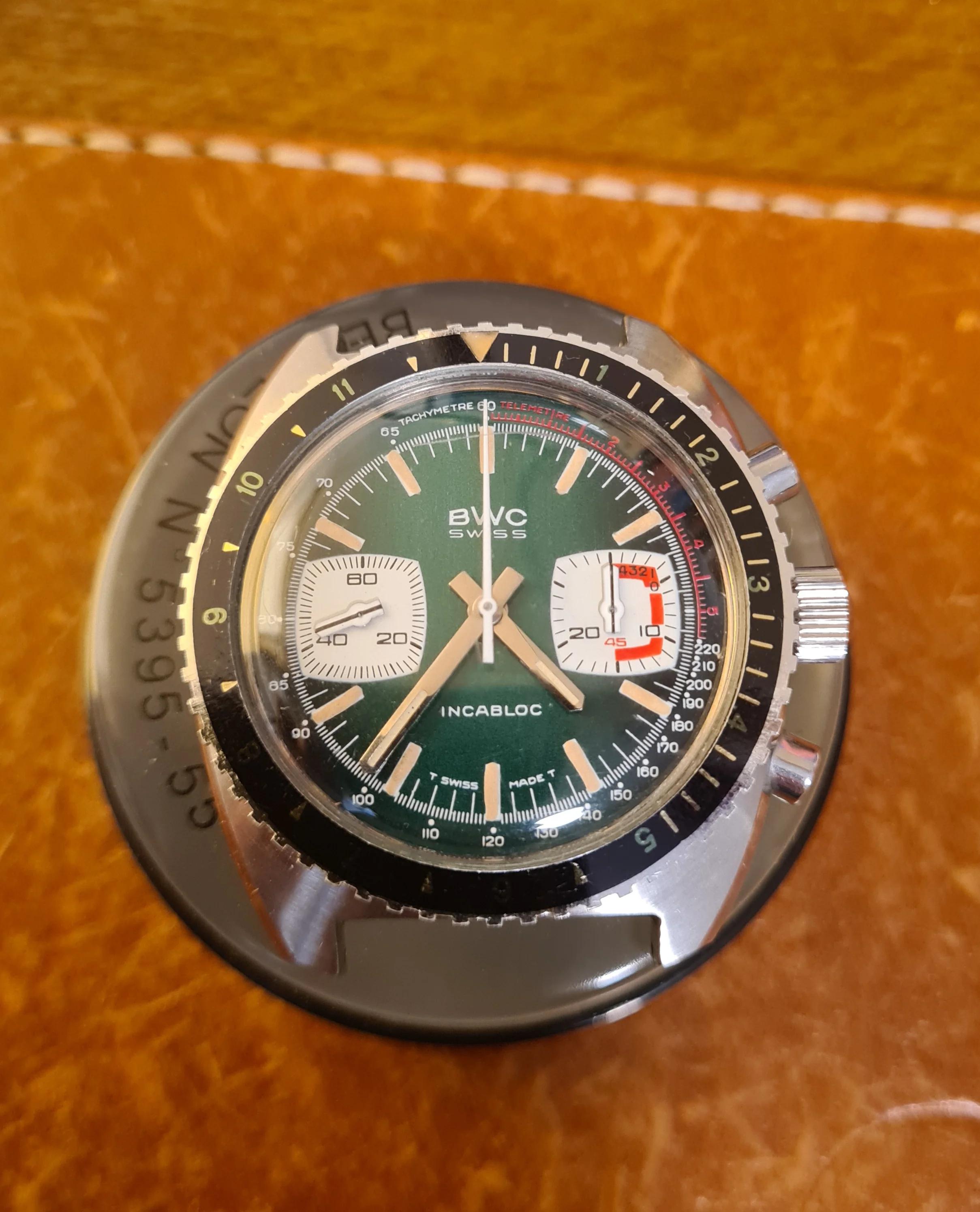 The Dial: Main color is a very rare racing-green, as befits the motorsports theme. Rectangular subdials are reminiscent of an automobile dashboard from the late-60s/early 70s. The minute subdial has both a 5-minute countdown timer and a 45 min. race demarcation. Outer telemetre dial in orange and tachy dial in white. White sweep second is complemented by white subdial batons with black racing stripes down the middle. Original lume on dial and baton hands has a nice buttery patina.