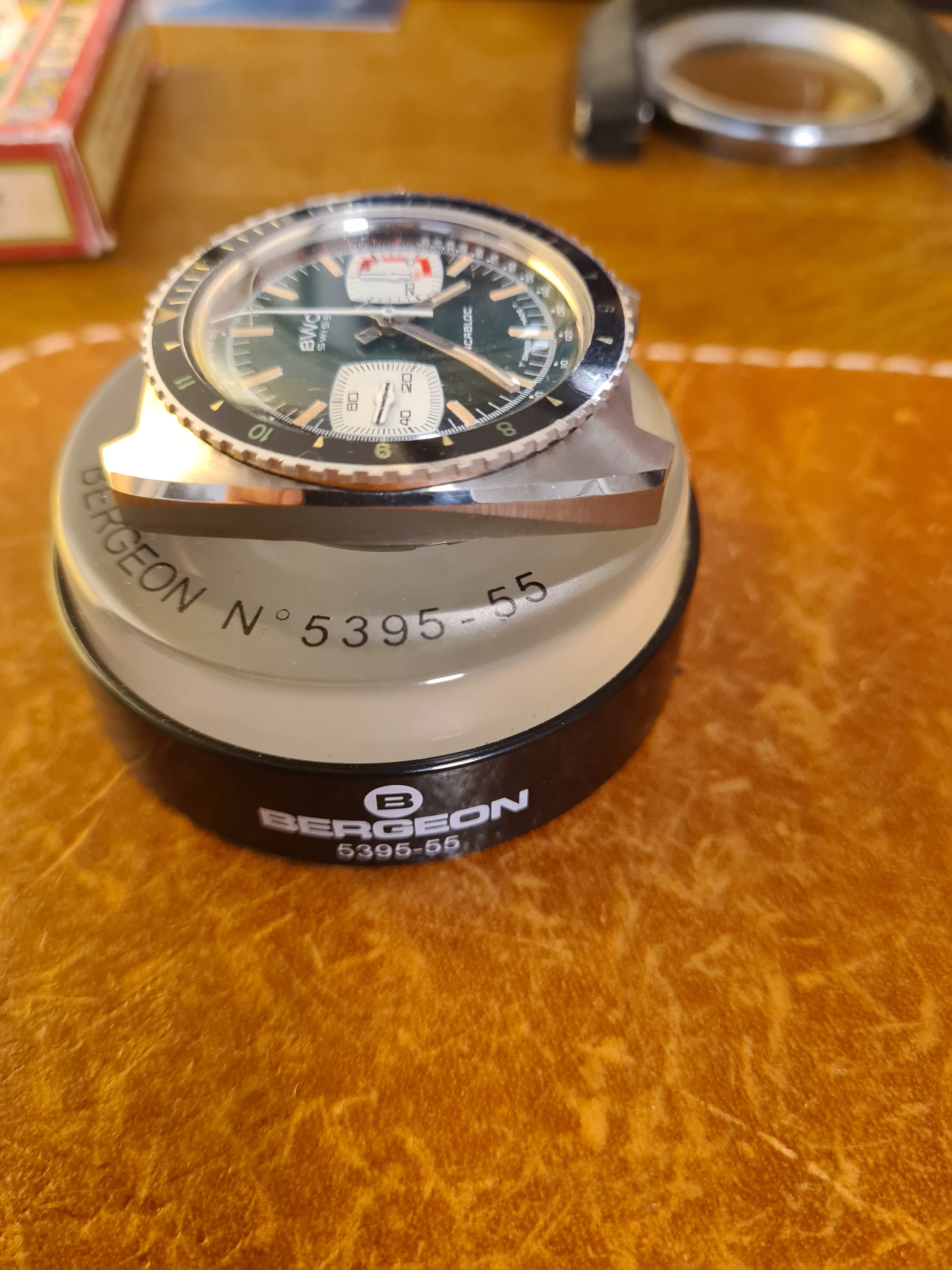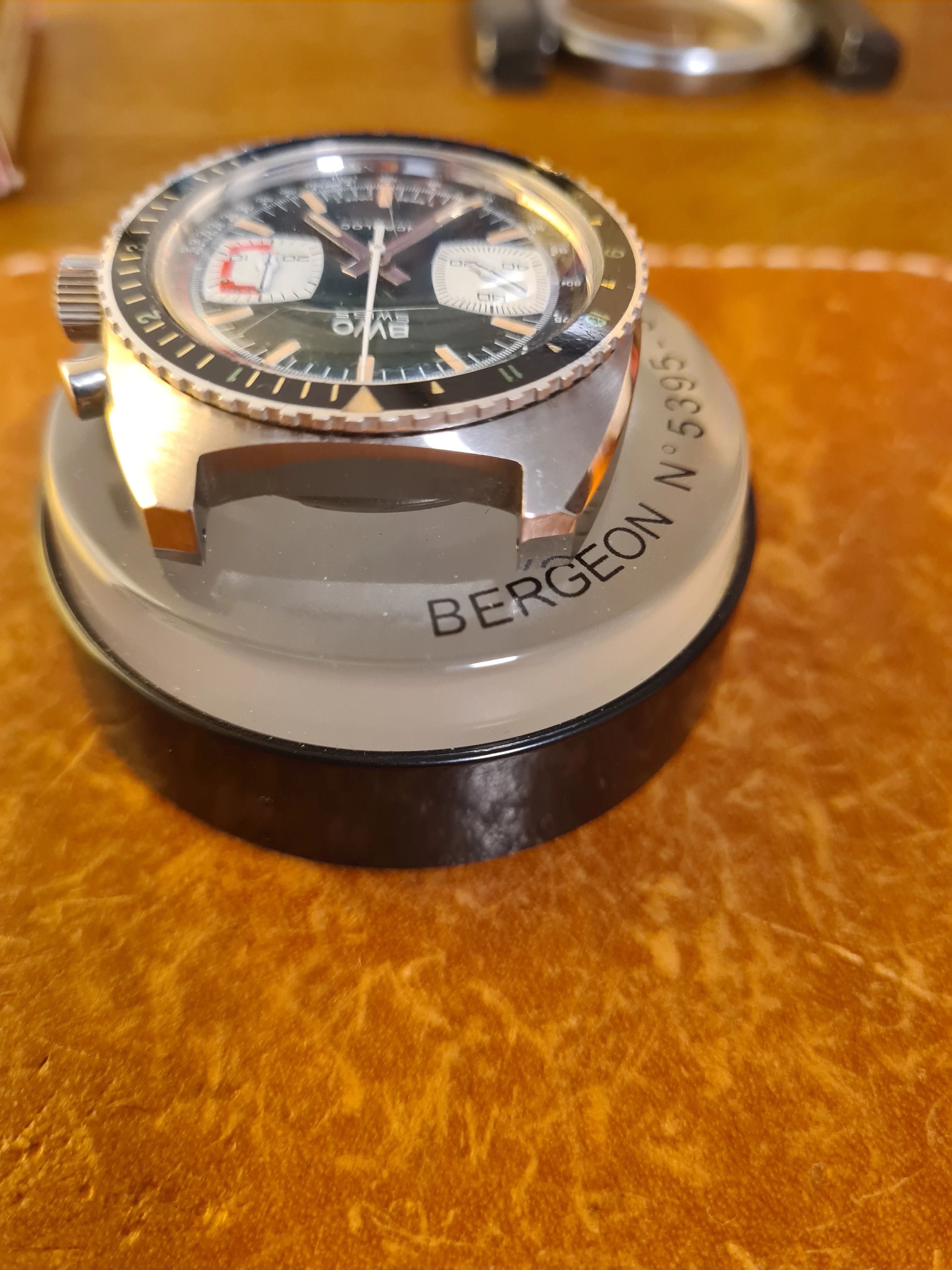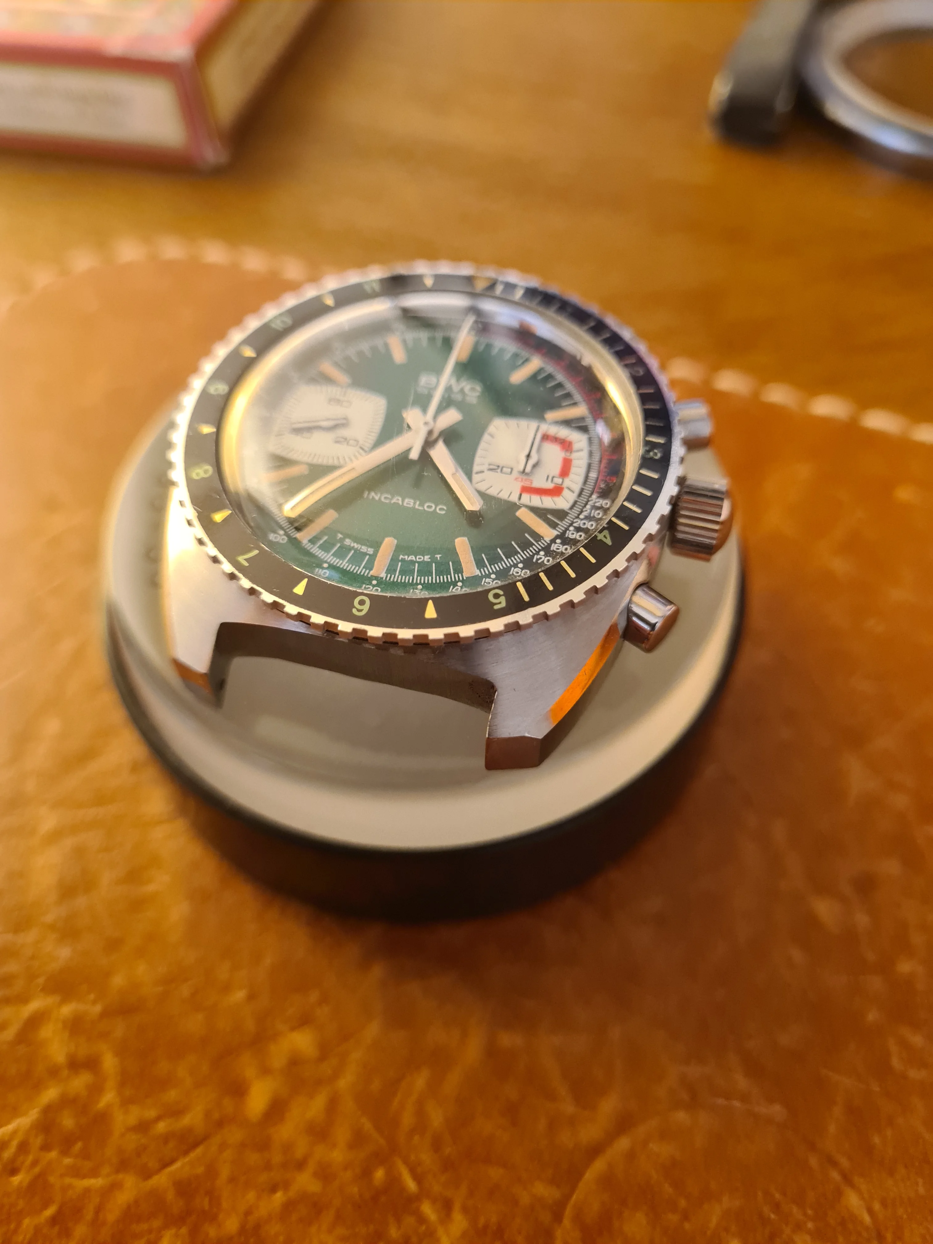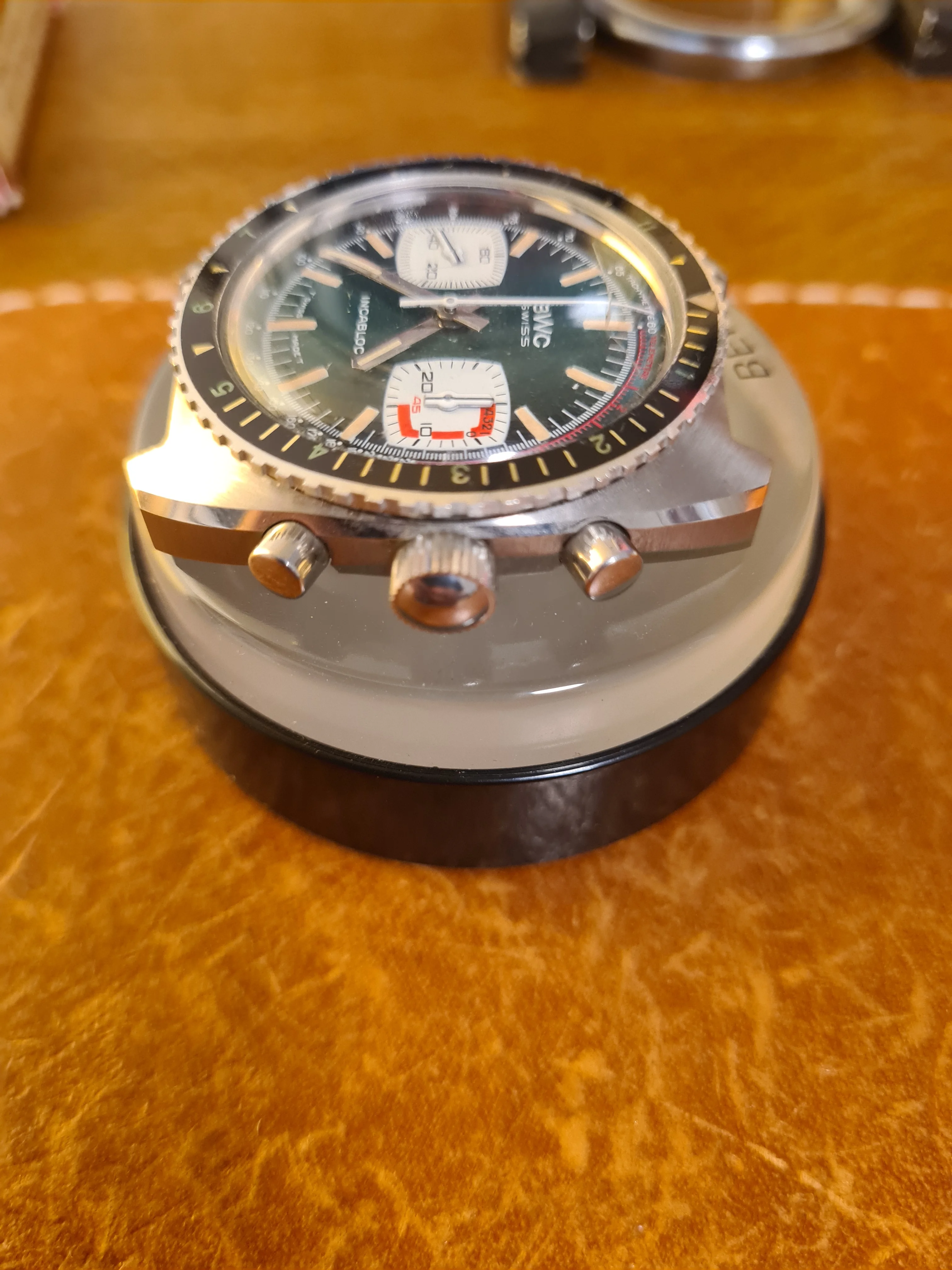 ·On offer is from my personal connection is a BWC (Buttes Watch Company) diving chronograph in near-NOS condition. This all steel, all original piece has great wrist presence and the dial has a really lovely color scheme. Lots of little details that evoke a racing theme. I haven't been able to date this one precisely, but judging by the batons, case, and dial layout, I'd say 1968-1972.